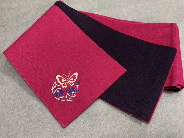 上質本麻素材◆撫松庵風おしゃれな夏の半巾帯『蝶に花刺繍/裏地深みの紺色』 たれ部分に刺しゅう