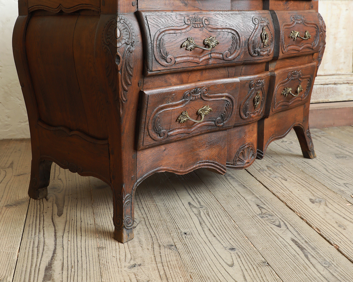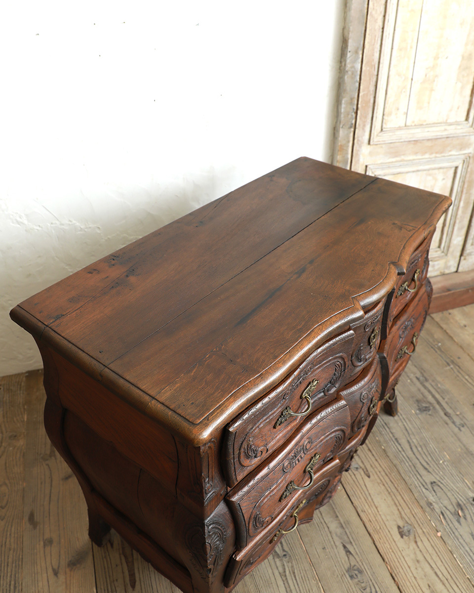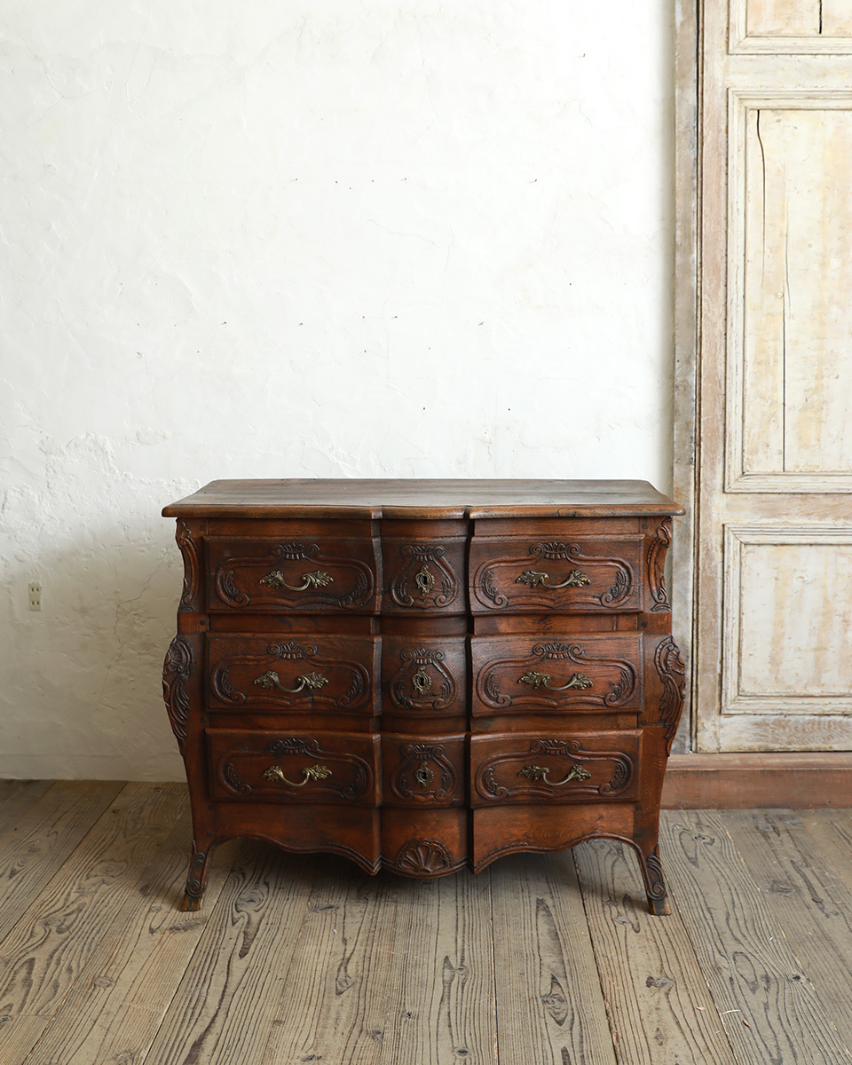 From : France フランスより届いた1870年代頃の荘厳な佇まいが目を惹くコモード。 ロココ様式ならではのどっしりとした重厚感のある風貌に豪華な装飾が配われ、エレガントな雰囲気を纏ったひと品。 ぼってりしたフォルムに優雅な曲線美が際立ち、ロココスタイルならではの真鍮製金物が高級感をいっそう引き立てます。 もともと宮廷などで肖像画の下の空間を飾るための装飾家具として広まり、要人の華やかさをいっそう引き立てるためにより豪華に贅沢に造られたチェストオブドロワーズです。 引き出し内寸:W76*D31.5*H12(cm) 商品はアンティーク品のため、お写真では伝わり難い色褪せや小傷などがございます。追加のお写真をご希望の方はお気軽にお問合せくださいませ。 商品はメンテナンスを施してからの発送となりますので、お届けまでに7日間ほどお時間をいただく場合がございます。 お急ぎの方はお気軽にご相談くださいませ。 |