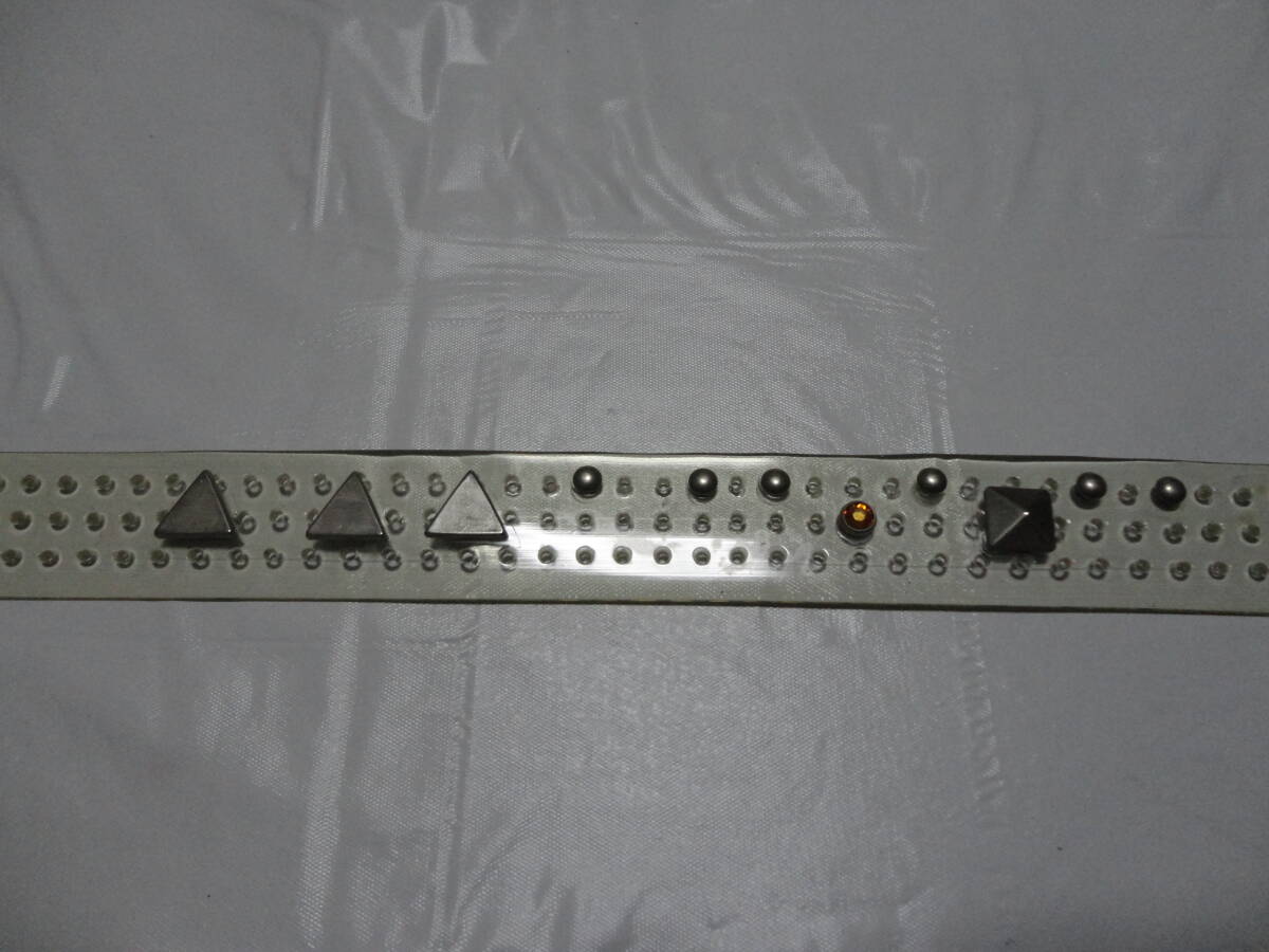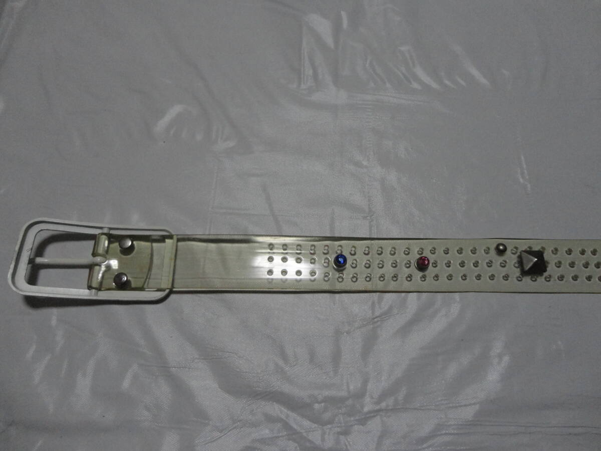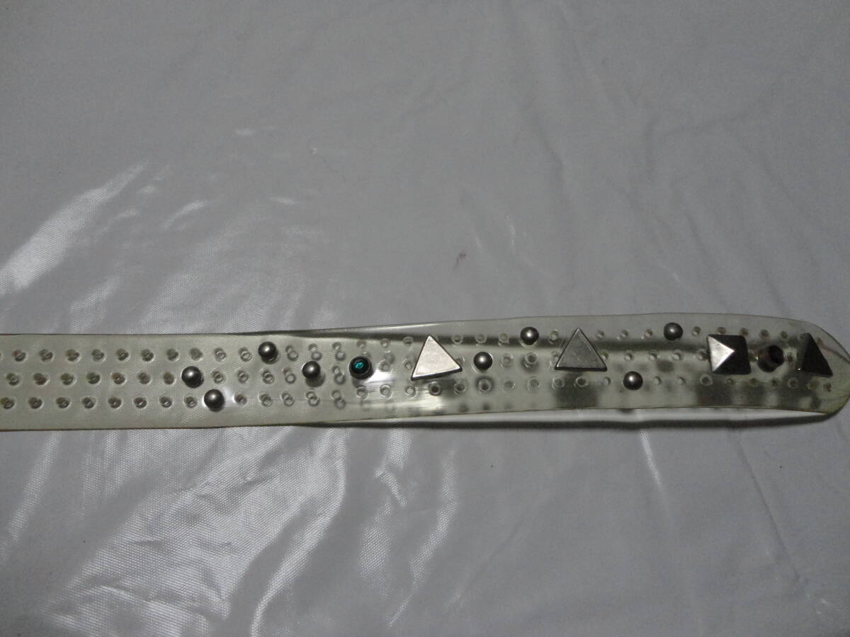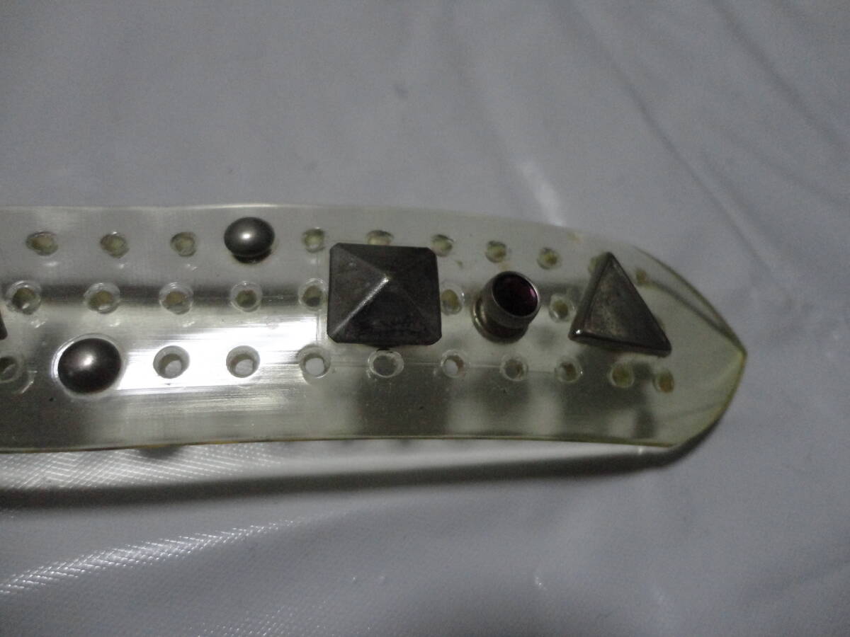 色=やや黄身がかった透明色(セロハンテープのような色合)×シルバースタッズ(複数)&青・桃・金・緑・紫スタッズ(各1箇所)