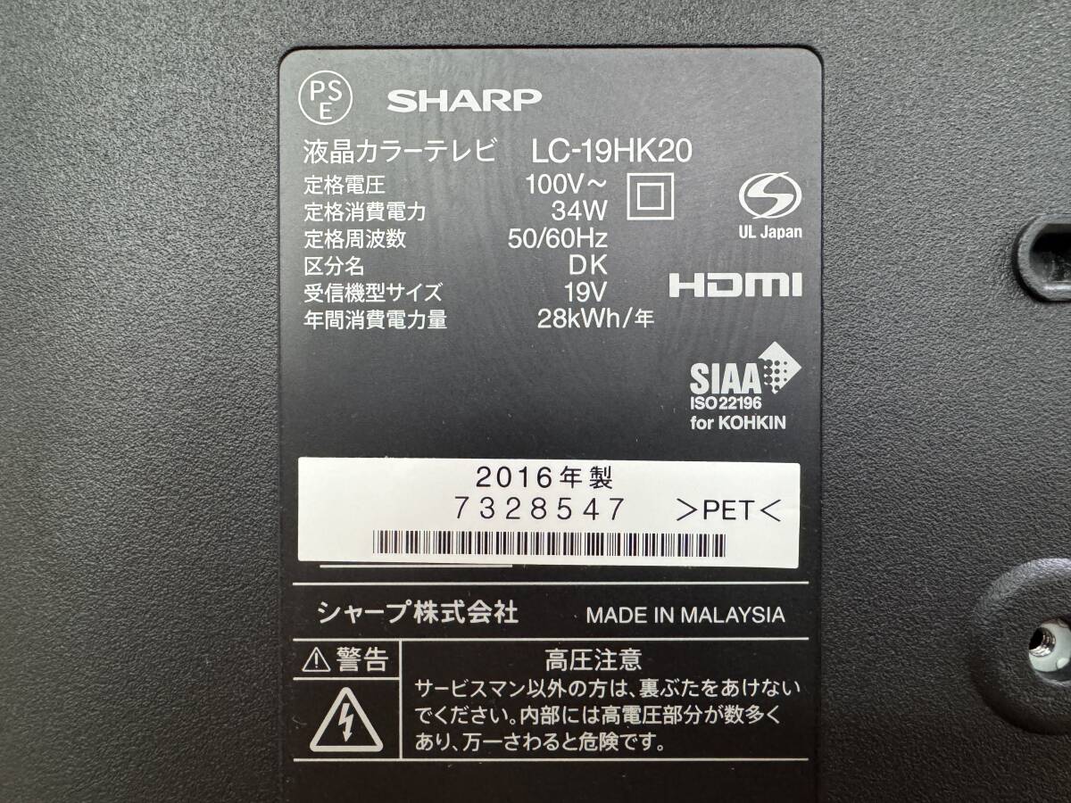 シャープ AQUOS 19型 LED 液晶テレビ 2016年製 LC-19HK20 管理番号F933