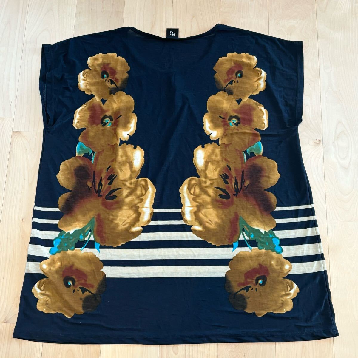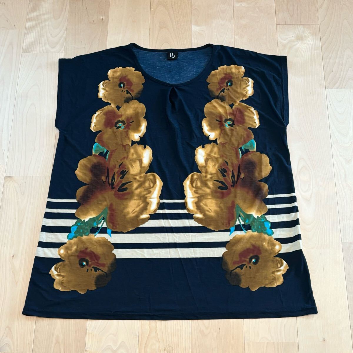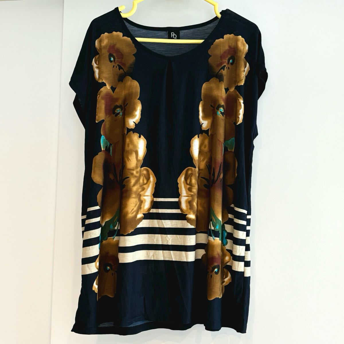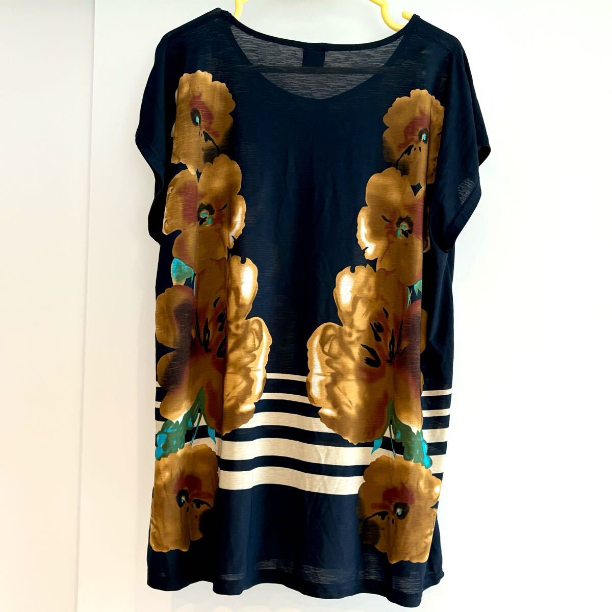 ネイビーの地に黄色のお花、ボーダーがデザインされたチュニックワンピ 。