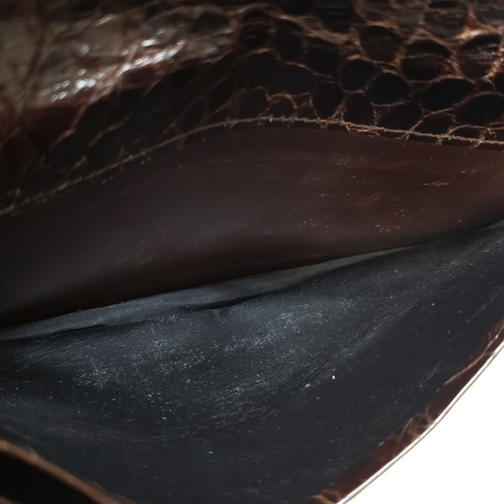 | 商品説明 | ・無双 クロコダイルレザー の長札入れ / 長財布です。 ・カラー ブラウン系(画像参照) ・素材 クロコダイルレザー(ワニ革) ・付属品 無し ・サイズ 縦幅 約9.5cm(中央部) 横幅 約17.5cm マチ 約1.3cm(最大幅) ・収納 札室×1 フリーポケット×3 カード室×9 ・商品コンディション 外装全コーナーに軽いスレがあります。 外装本体レザー両面に軽い貼りつき跡・軽いスレがあります。(画像参照) 内装札室内・フリーポケット内の壁面に貼りつき跡があります。(画像参照) その他軽い使用感がありますが、大きなダメージがなくまだまだご愛用頂けるコンデションです。 ※個人保管商品ですので、店舗コンディションをお求めの方はご入札をお控えください。ご理解の上ご入札お願いいたします。 |