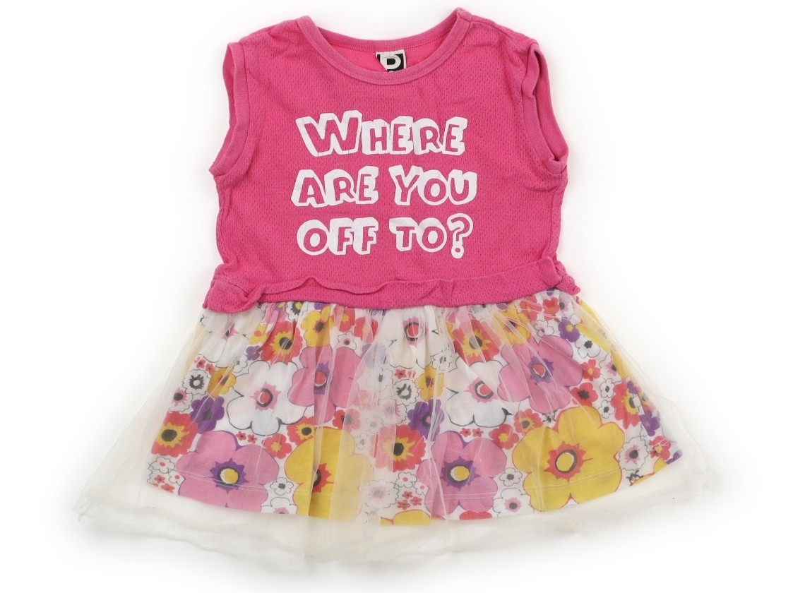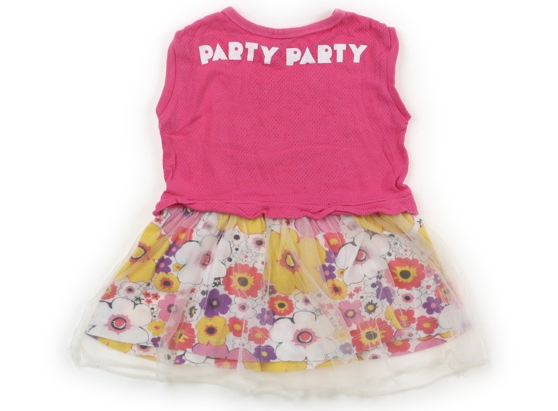 上身頃はコットン素材のメッシュ地。下身頃は表地チュール地、裏地ポリエステル・レーヨンのカットソー生地。全体的に毛羽立ちと色褪せがあり、プリントはひび割れています。後ろスカート裏地に大き目の薄茶色い汚れがあります。