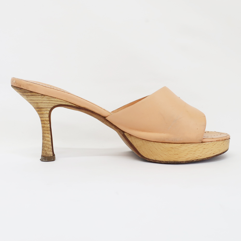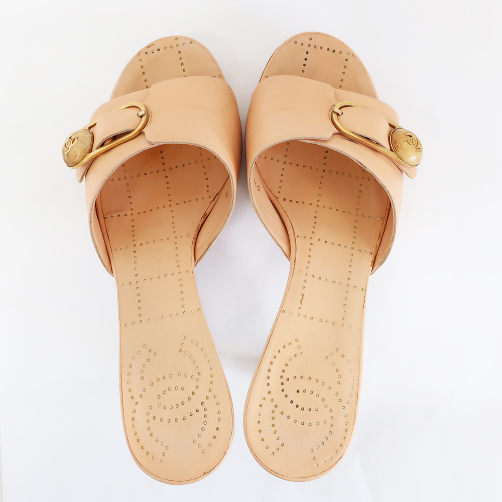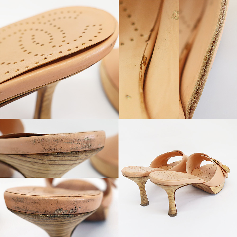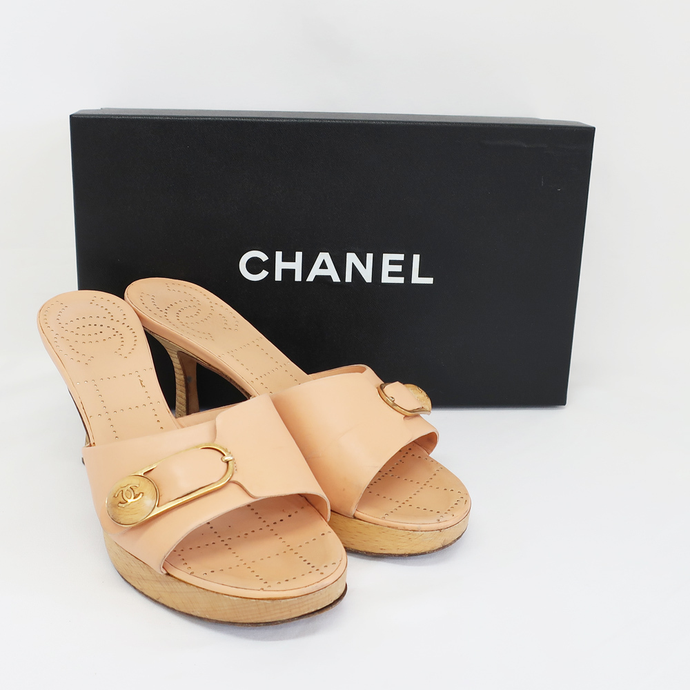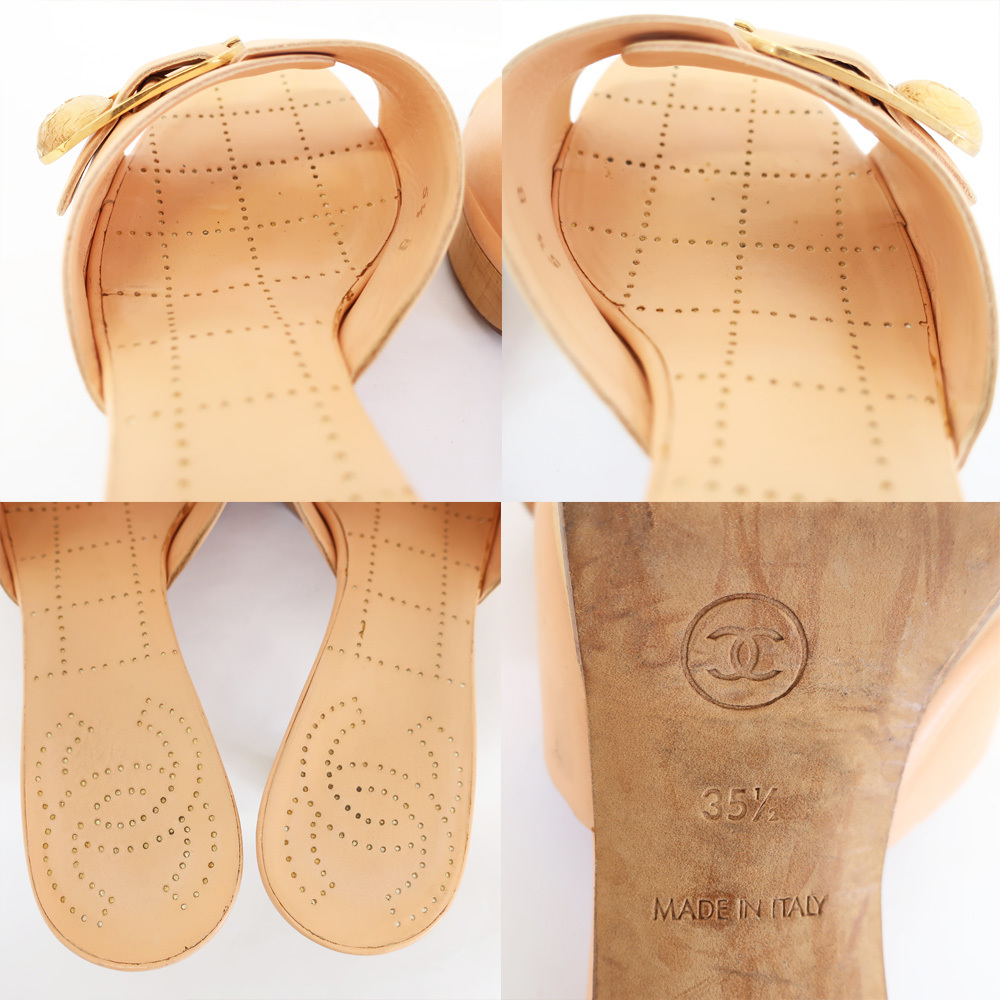 【天白】シャネル サンダル ミュール ウッドボタン ココマーク ピンク ベージュ サイズ35.5 22.5cm相当 靴 レディース