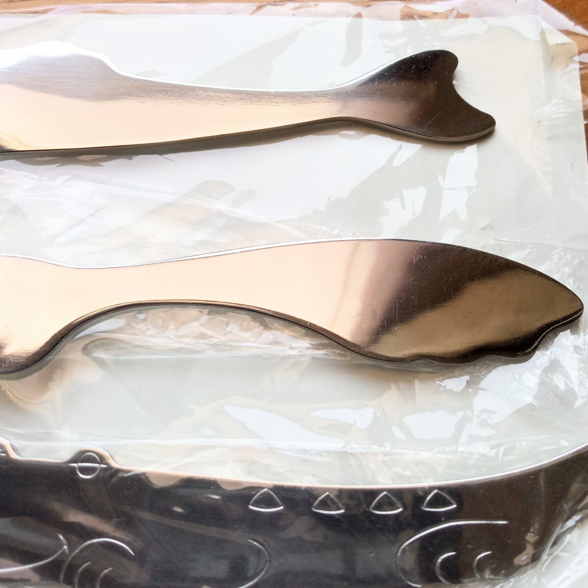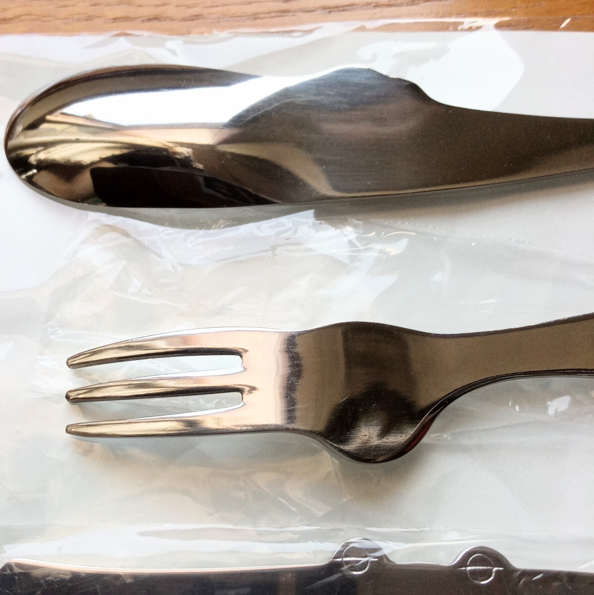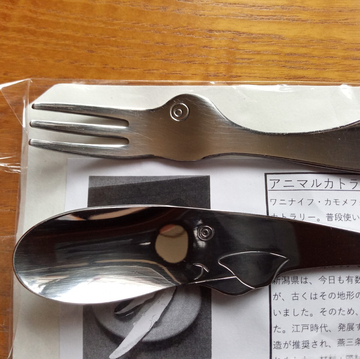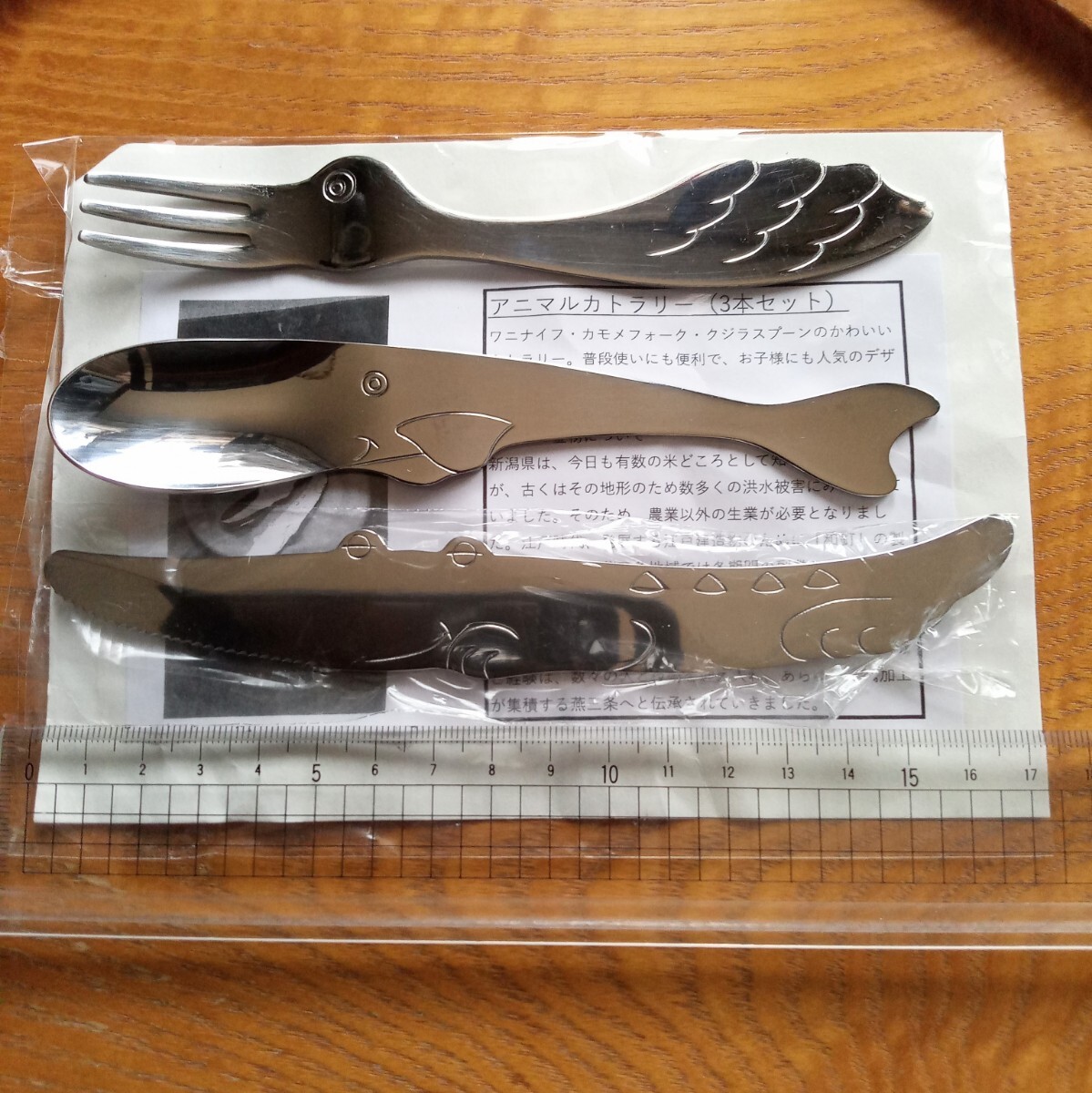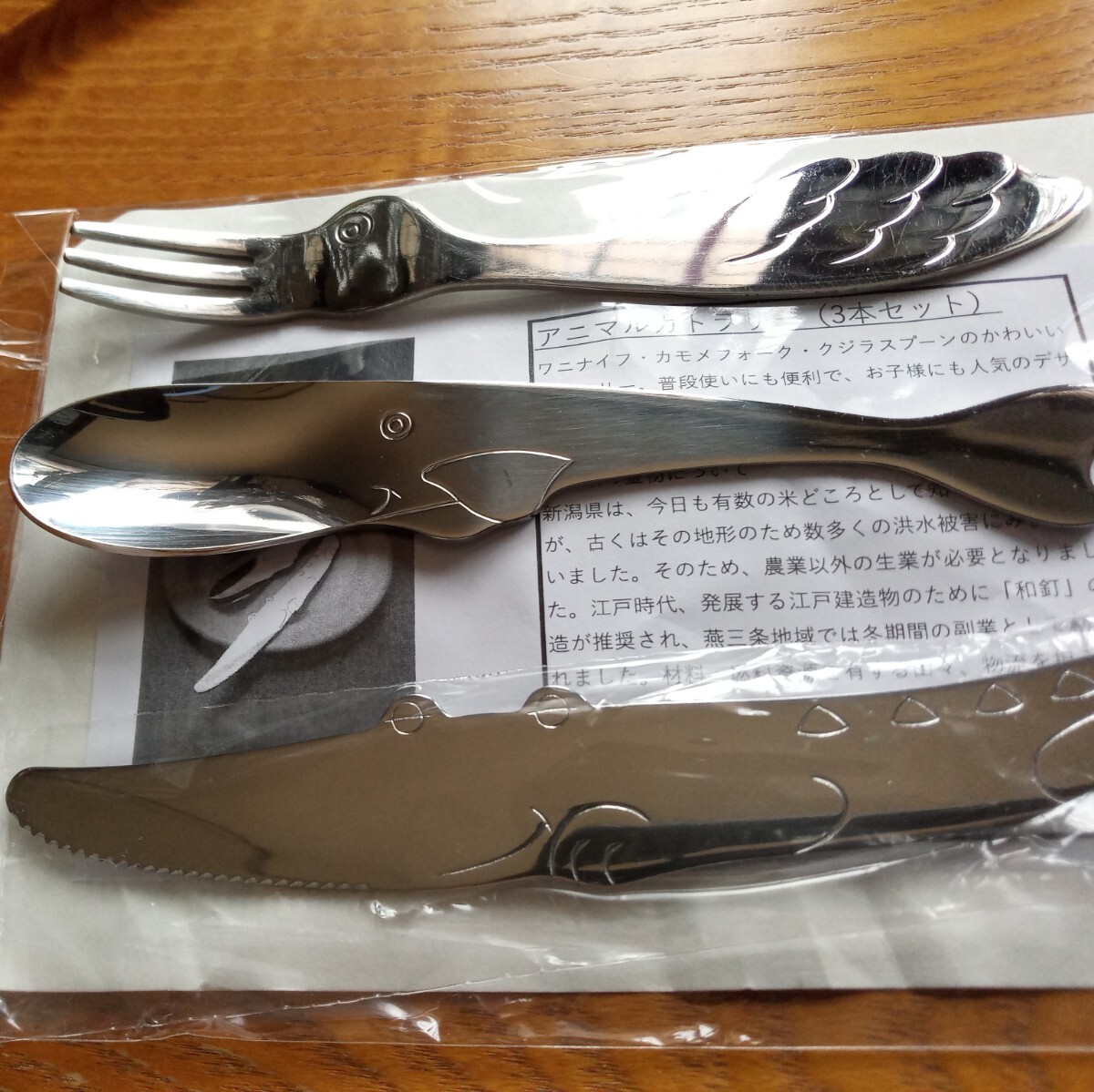 ワニナイフは未使用ですが、クジラスプーンは1度洗浄済みの未使用、かもめフォークは2度使用・3度洗浄したもので、それぞれ多少の細かい傷が見られます。