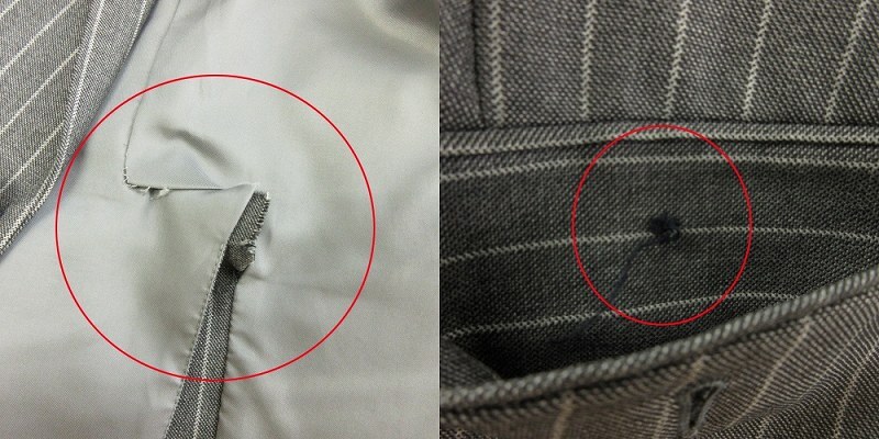 【状態】この商品には下記のようなダメージがあります。 ・ジャケット裏地に破れ箇所 ・ズボンのバックポケットのボタン欠品 ※全体的に中古品としての使用感と上記のようなダメージがありますが、通常使用には支障のない商品です。 掲載写真や記載内容をご確認いただき、ご理解の上ご購入ください。