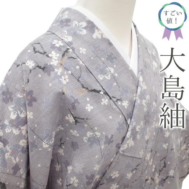 【中古】 すごい値! 本場大島紬 リサイクル 着物 袷 正絹 泥染 7マルキ 薄灰紫 梅 花 カジュアル 大島 大島紬 中古 仕立て上がり 身丈168 裄丈67 Lサイズ 春 秋 冬 リサイクル着物 中古 大島紬 普段着 カジュアル着物 観劇 お食事 ショッピング お出かけ など カジュアルシーンに たとう紙付き 送料無料 30代 40代 50代 60代 ~ 販売 購入 リユース すごいね みやがわ nek01487