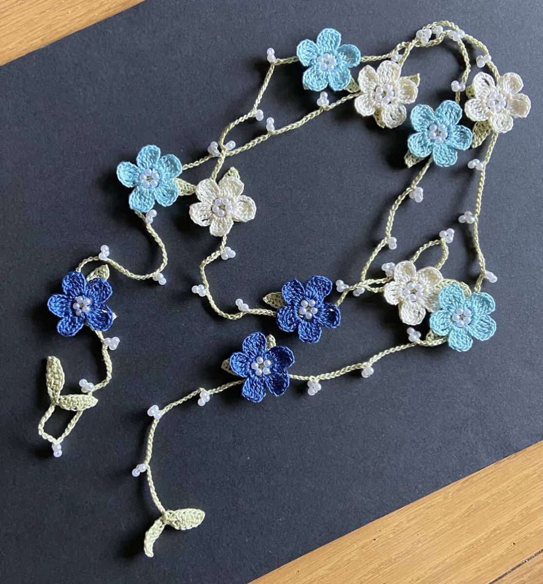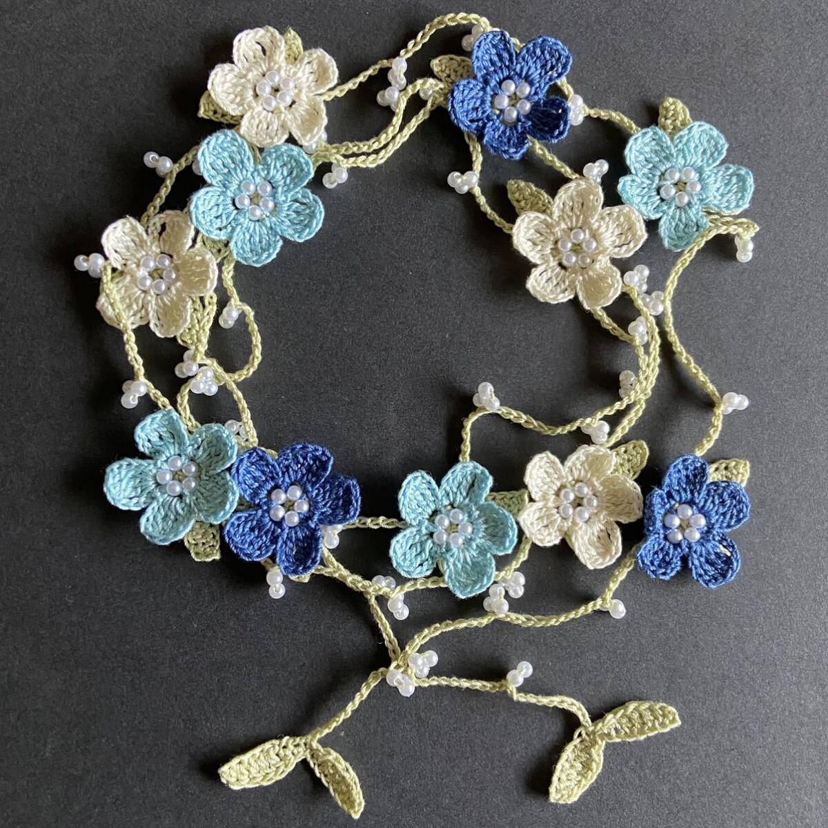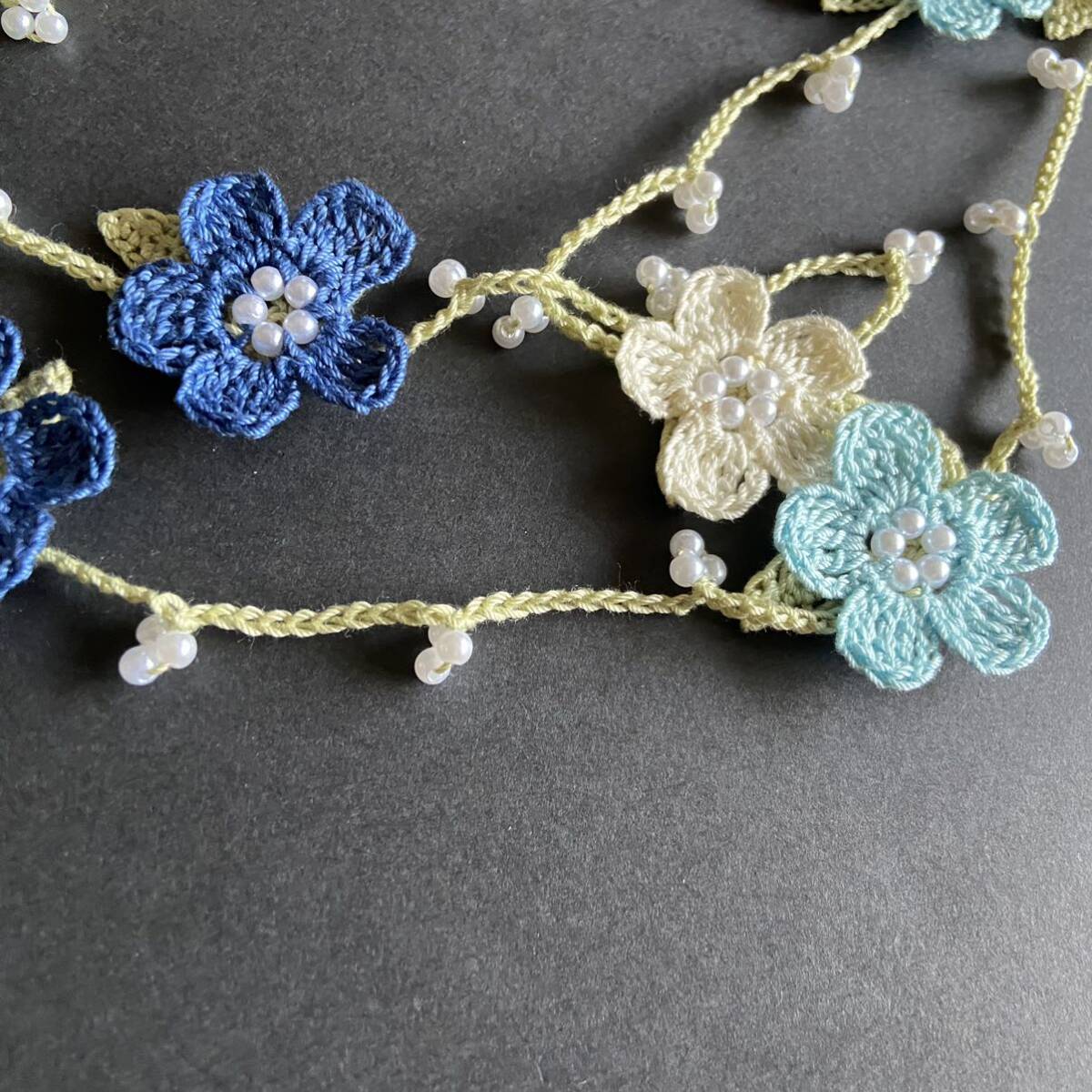 ハンドメイド、パールビーズを編み込んだブルー系お花ラリエットです。