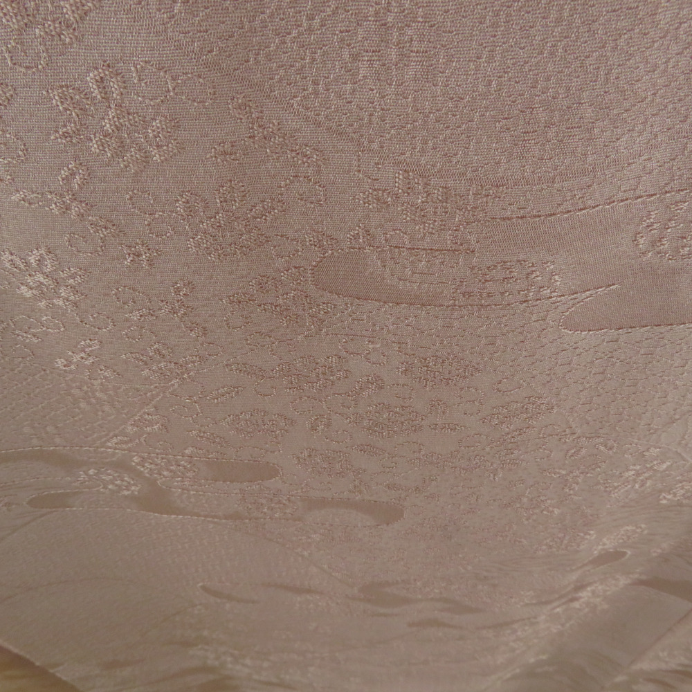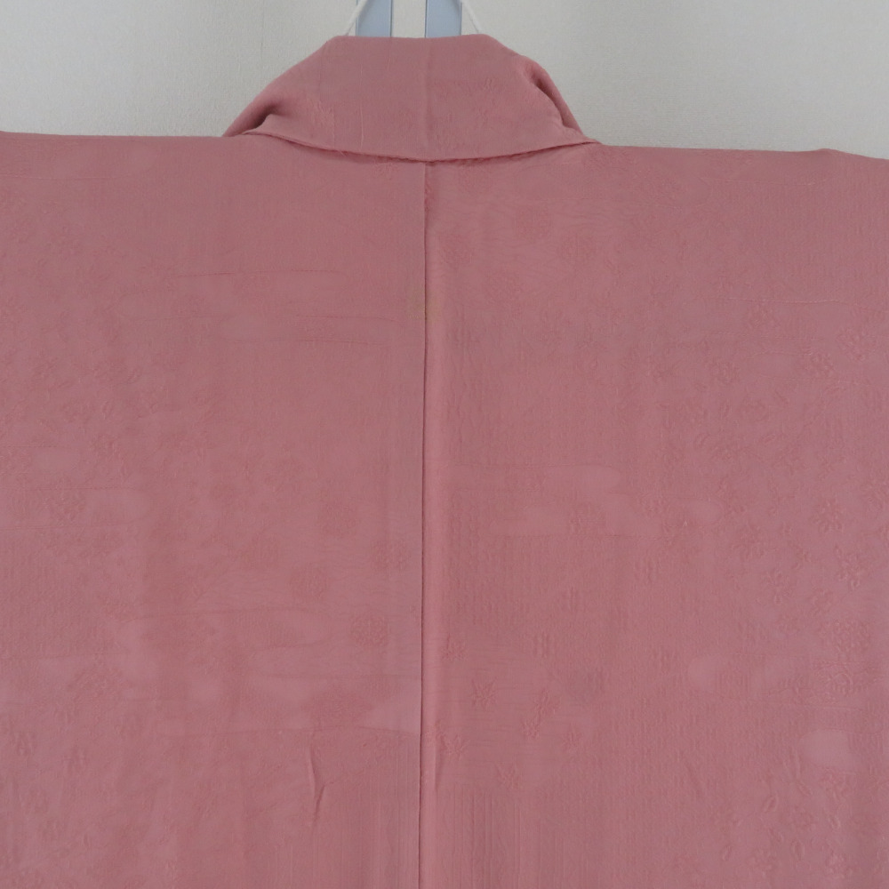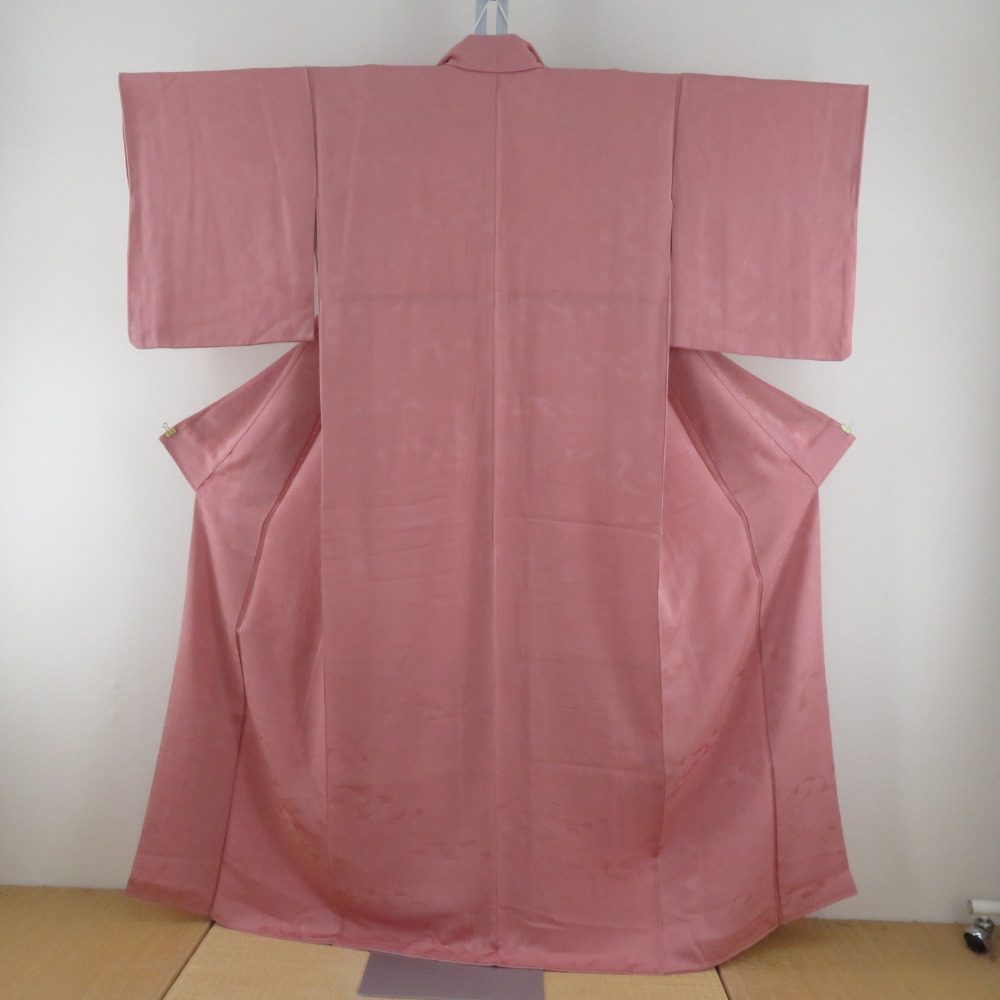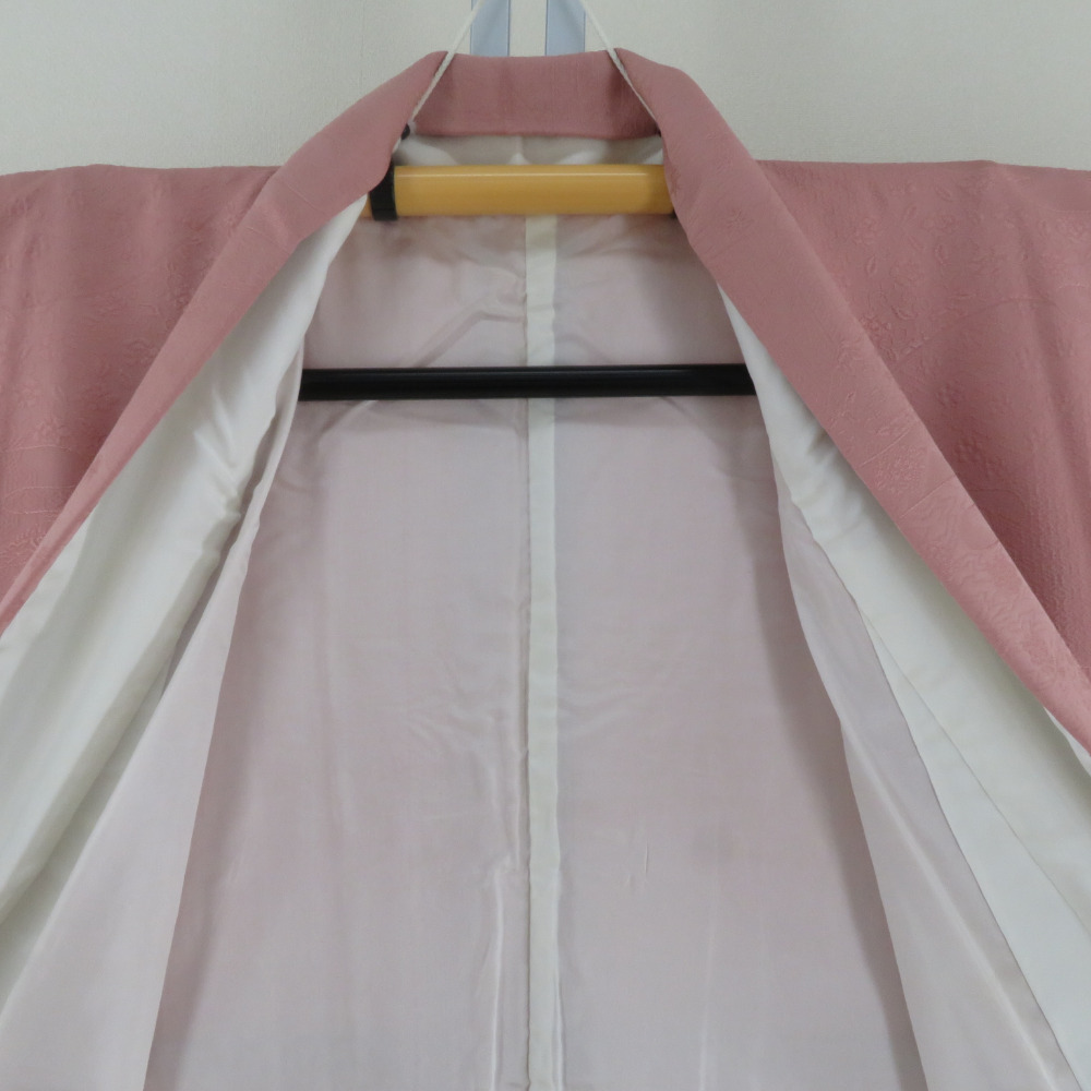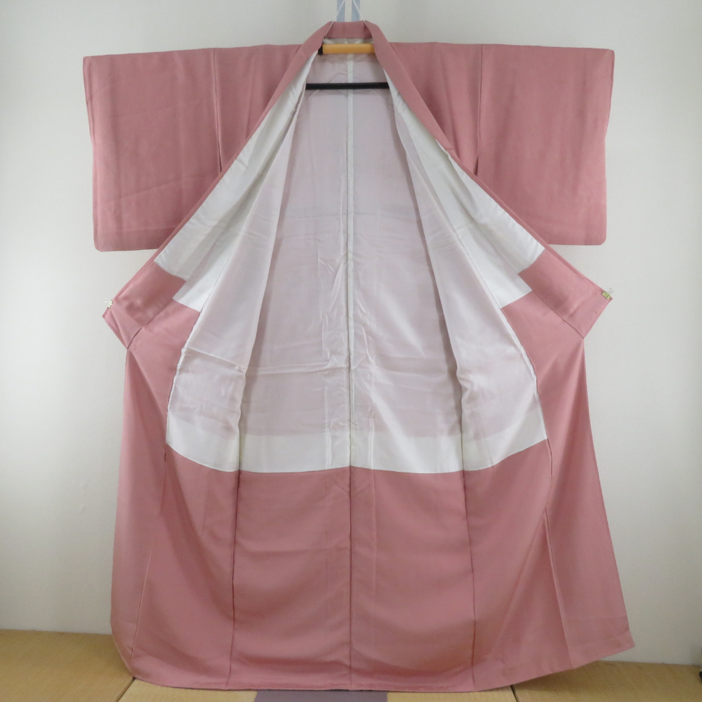 | 色無地 袷 パウダーピンク色 地紋入り 一つ紋 違い鷹の羽紋 正絹 広衿 仕立て上がり着物 身丈158cm |
