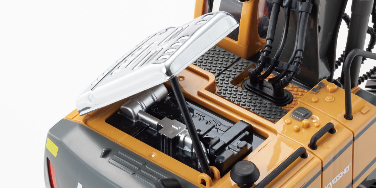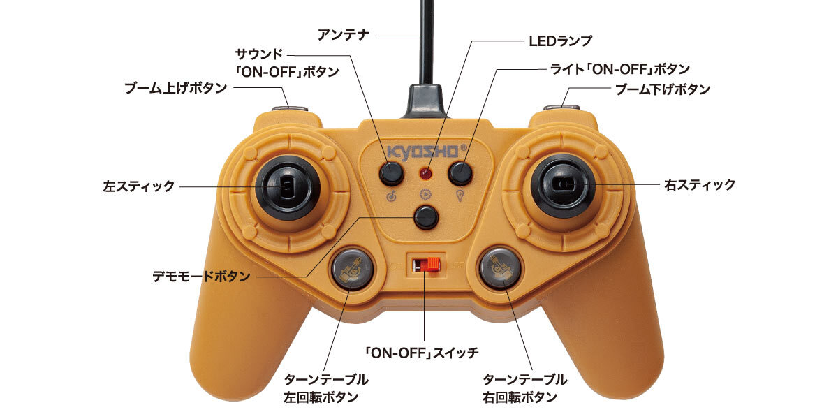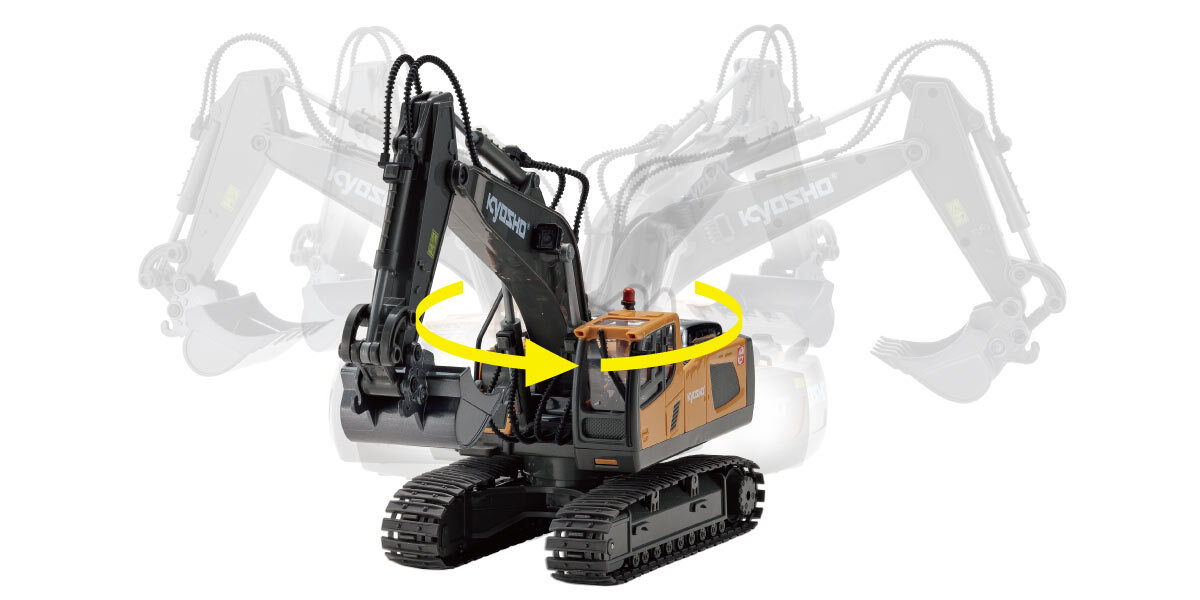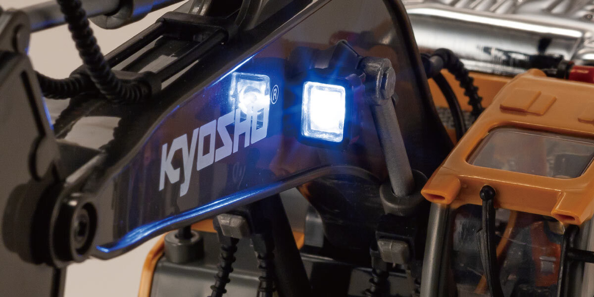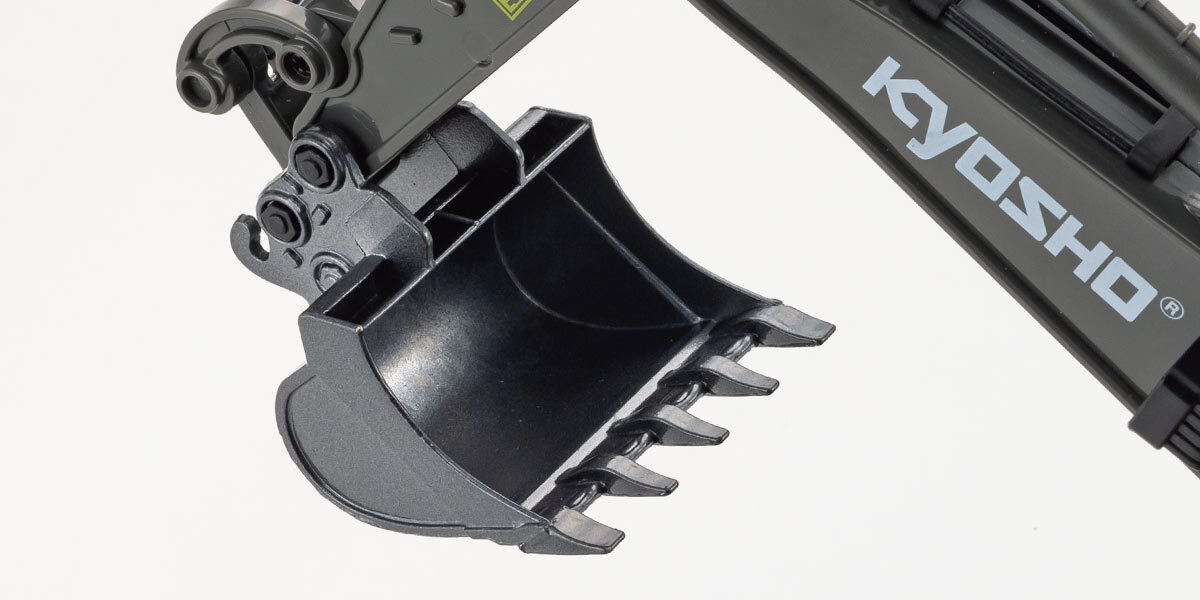 黒光りするアイアンメタルバケットと、ブーム左右にあしらわれた“KYOSHO”ロゴが存在感を主張する。
