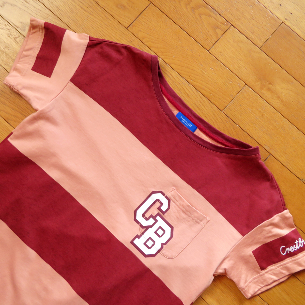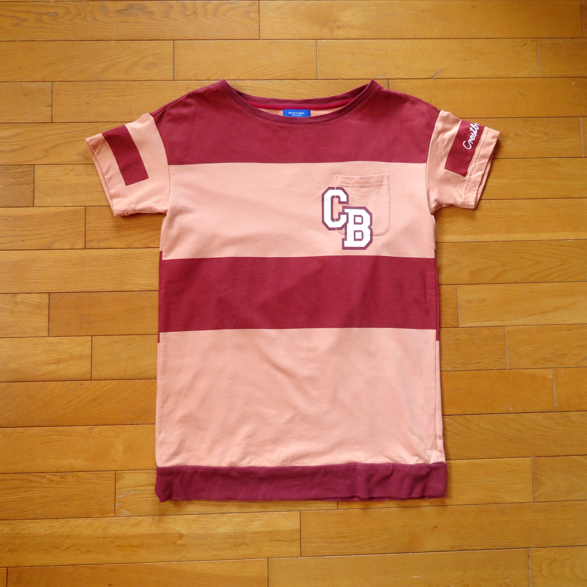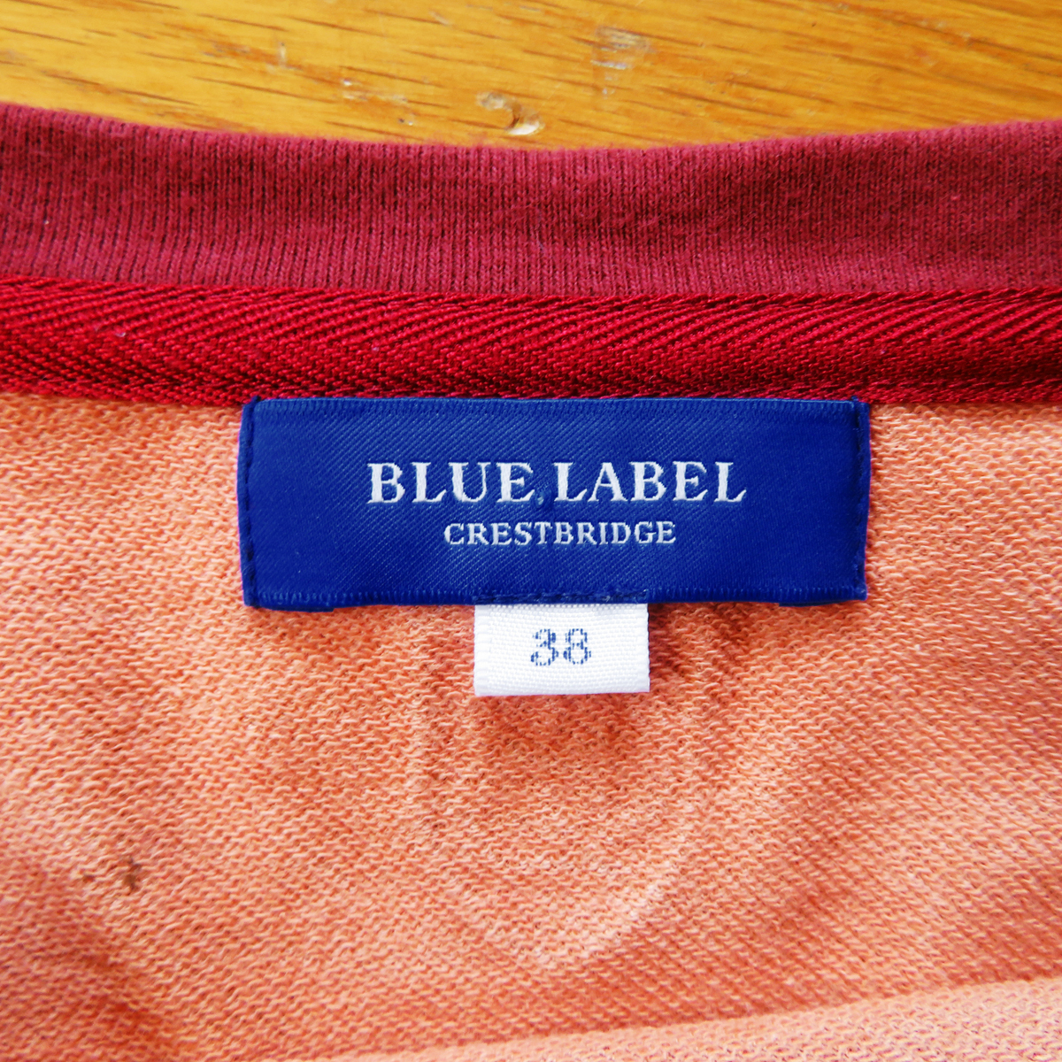 ワイン色とピンクオレンジのボーダー柄、胸にはロゴ、袖にもロゴの刺繍が入った、 とっても可愛いブルーレーベルクレストブリッジの半袖Tシャツです。 ドロップショルダー系、オーバーサイズで少し大きめの作りになっています。 生地はコットンで、薄めではなく、割としっかりとした生地になっています。 おしゃれ可愛い半袖Tシャツ、アウターインナーにも使えて、可愛くてコーディネイトの主役になれます。 おすすめです!いかがでしょうか^^ 【コンディション】 多少の使用感はありますが、着用回数は少なめで大きなダメージ、目立つ汚れ等はありません。 まぁまぁきれいかと思います。十分着用していただます。 ---------------------------------------------- 【表記】サイズ 38 (M~Lぐらい) 【実寸】 平置き 肩幅 52cm (水平計測) 身幅 48.5cm (身幅は脇の下あたりで計測) 袖丈 11cm (下側計測) 着丈 71cm (後ろ側 上から下まで) 前後程度になります。※平置き、素人採寸になりますので、多少の誤差はお許し下さい。 ----------------------------------------------- 【色】 ワインレッド オレンジピンク 【素材】 コットン100% 【USED品】 ----------------------------------------------- ◆ 他にもいろいろデニムなど出品していますので、よかったら見ていってください。 ◆ もちろん同梱もできますので、お気軽にご質問ください。 ◆ 気持ちの良いお取引を目指していますので、ご質問は事前にお気軽にどうぞ。 終了直前だとお答えできない場合があります。どうぞよろしくお願い致します。 | ||||