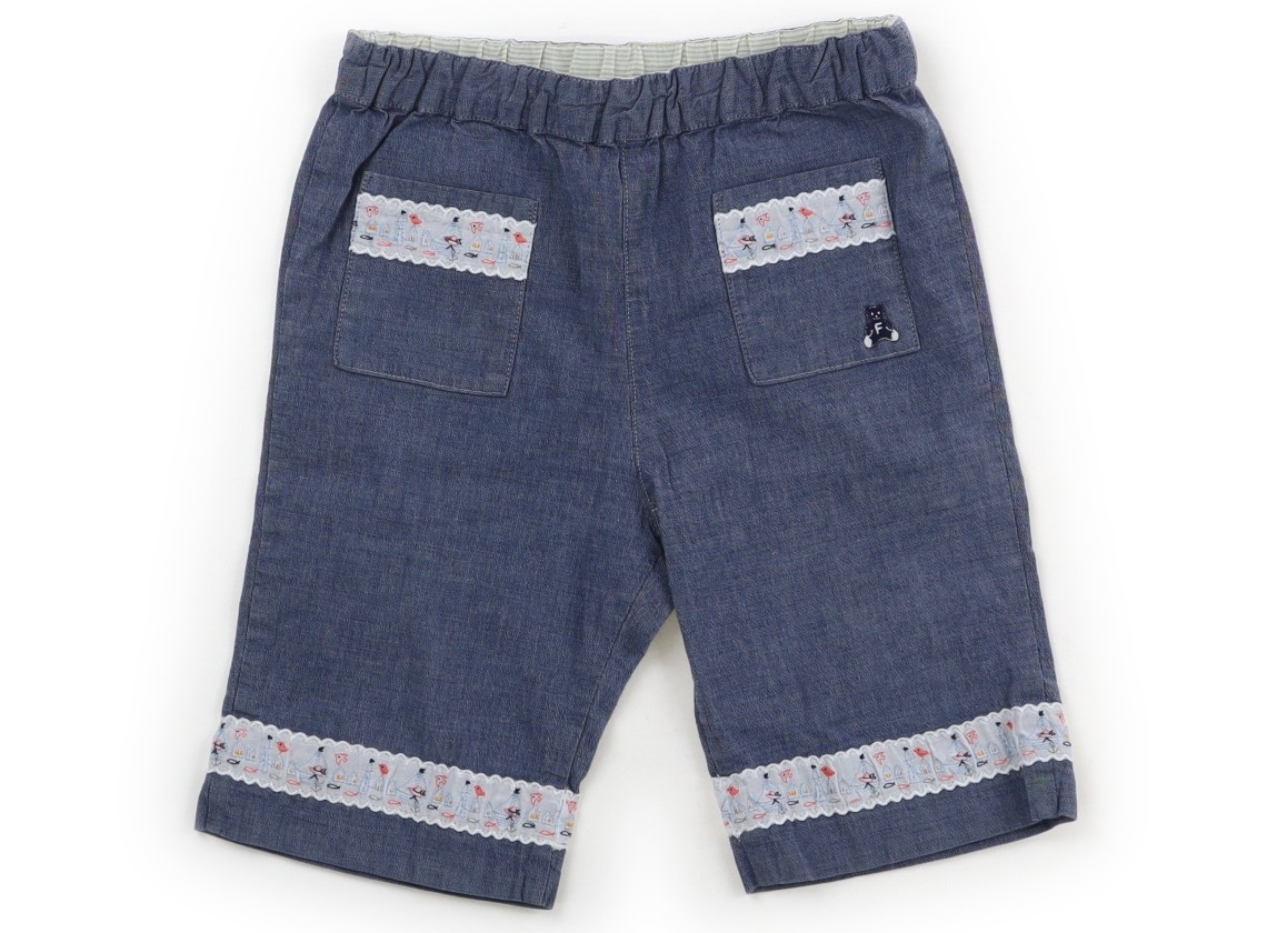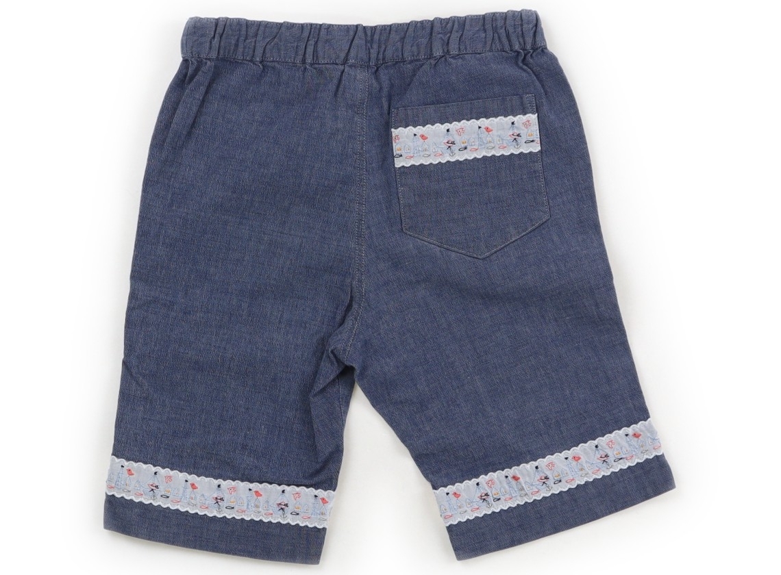 ストレッチ性のあるダンガリー生地、ウエストは総ゴムです。デニム特有の黄ばみが少し出ています。裾に黄色い汚れあり。