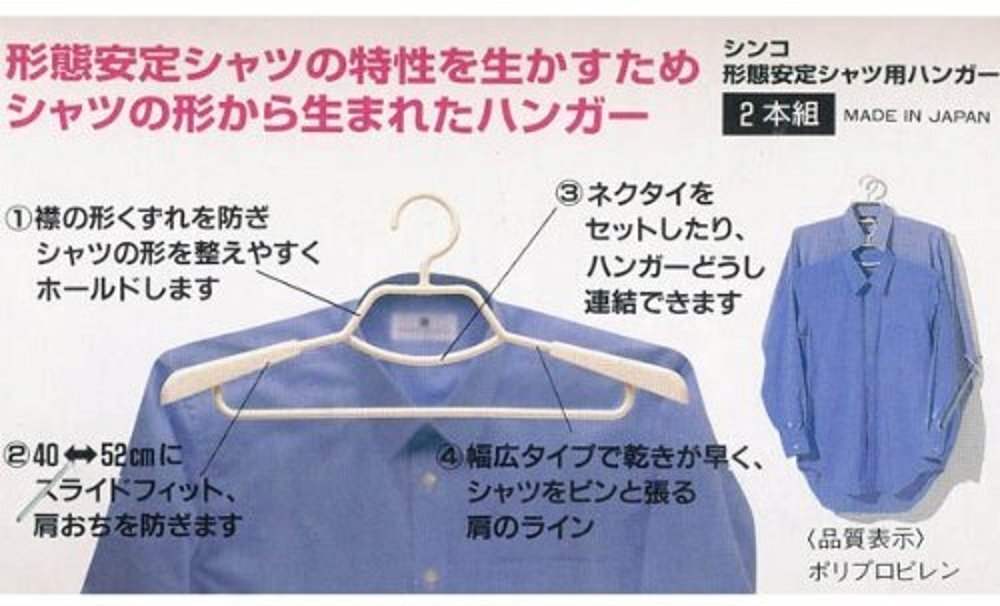 単身赴任のお父さん、会社で夜遅くまでいそがしい一人暮らしの男性の方に!ぜひ使っていただきたいワイシャツの型くずれを防ぐことができる形態安定シャツ用ハンガーです。襟の形をしっかり保つので、ネクタイをしめた時ぐんと差がでます。※肩が40-52cmまでスライド可能。女性用にも男性用にもお使いいただけます。2本セットでお届けします■サイズ:幅40-52×高さ19.5×厚さ2.1cm■材質:ポリプロピレン■原産国:日本(Made in Japan)■備考:同色2本組