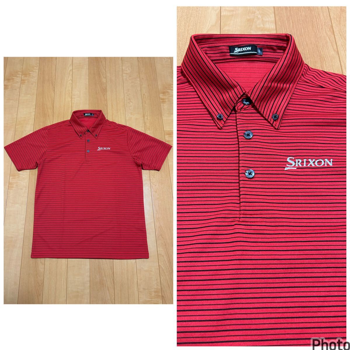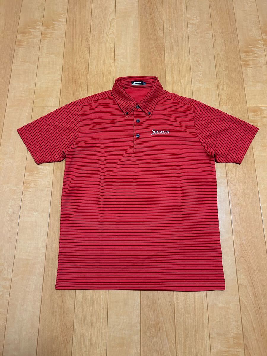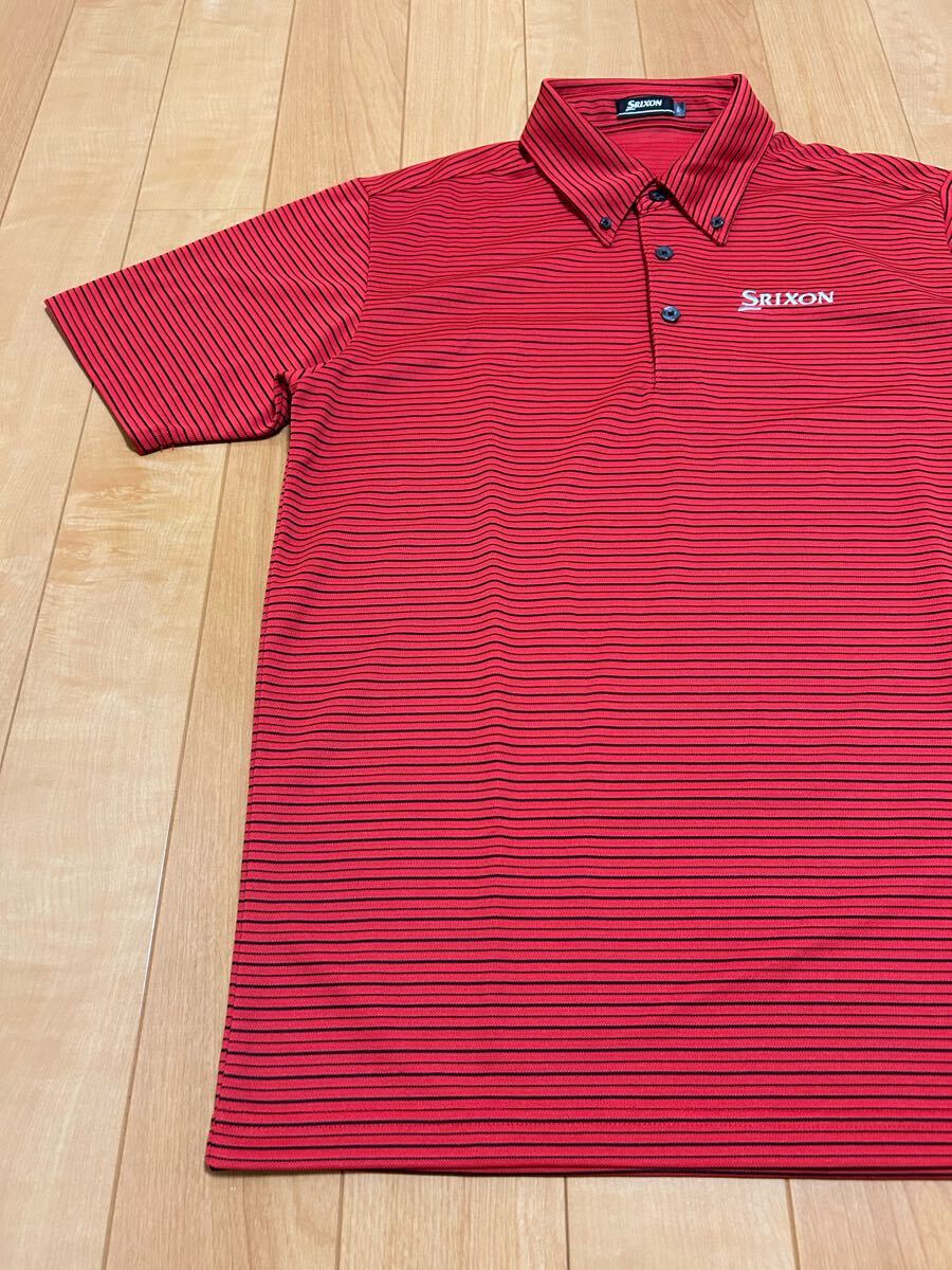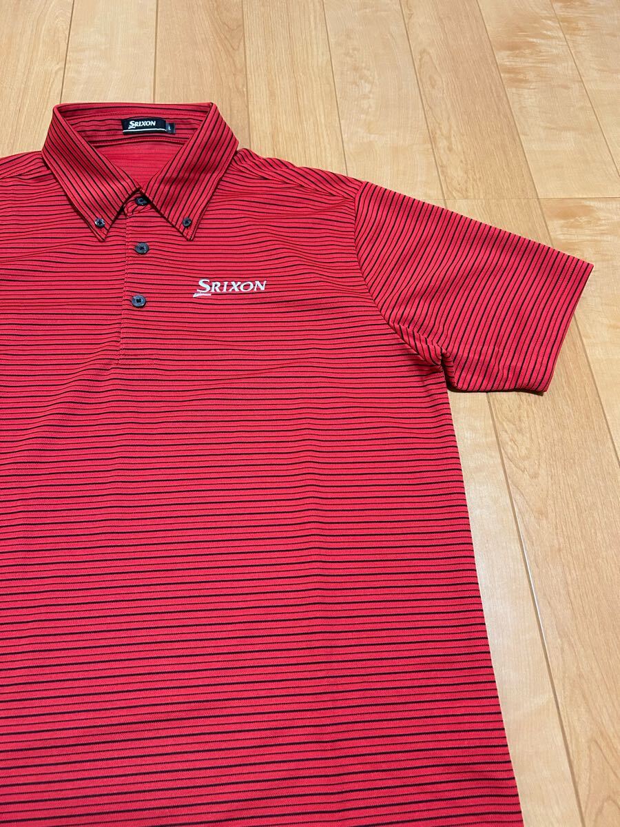 着用少な目.美品★SRIXON/スリクソン メンズサイズL大き目 快適速乾ドライ.半袖BDポロシャツ ロゴ刺繍入&全面ブラックボーダー柄 GOLF