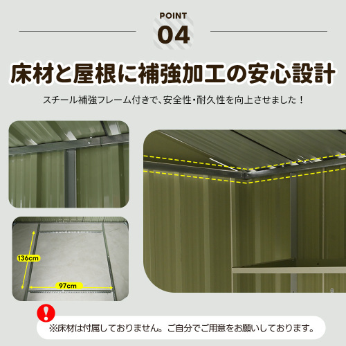 • ◎04床材と屋根に補強加工の安心設計 スチール補強フレーム付きで、安全性・耐久性を向上させました!※床材は付属しておりません。ご自分でご用意をお願いしております。