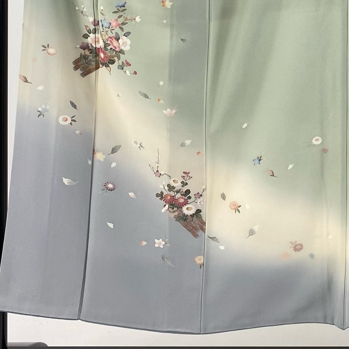 | 付下げ 秀品 落款 花筏 草花 染め分け ぼかし 薄緑 袷 身丈151.5 裄丈61.5 S 正絹 【中古】 |