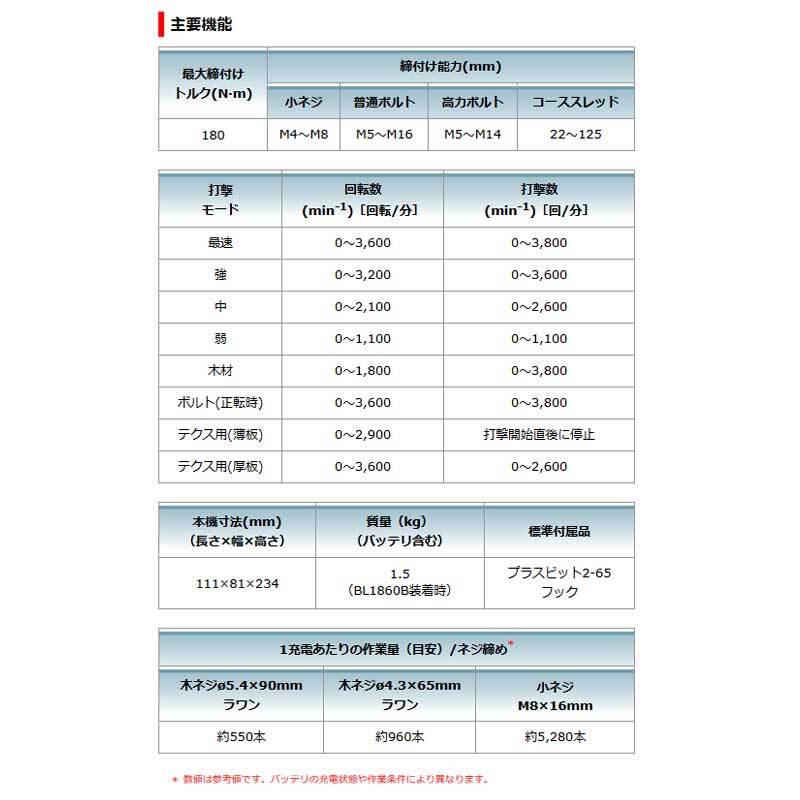 付属品 | バッテリBL1860B×2本・充電器DC18RF・ケース・プラスビット2-65・フック 付 |