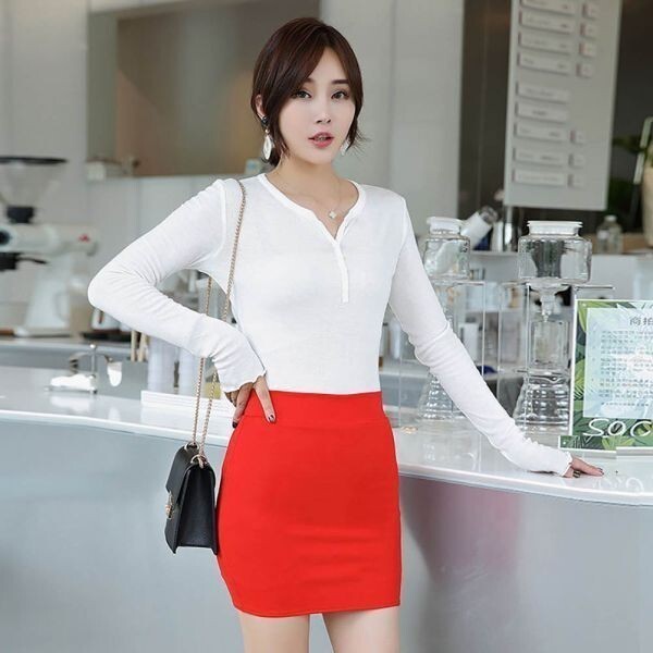 タイトスカート ミニ ストレッチ 無地 膝上 レディース ウエストゴム 美脚 ひざ上 2XLサイズ ホットオレンジ