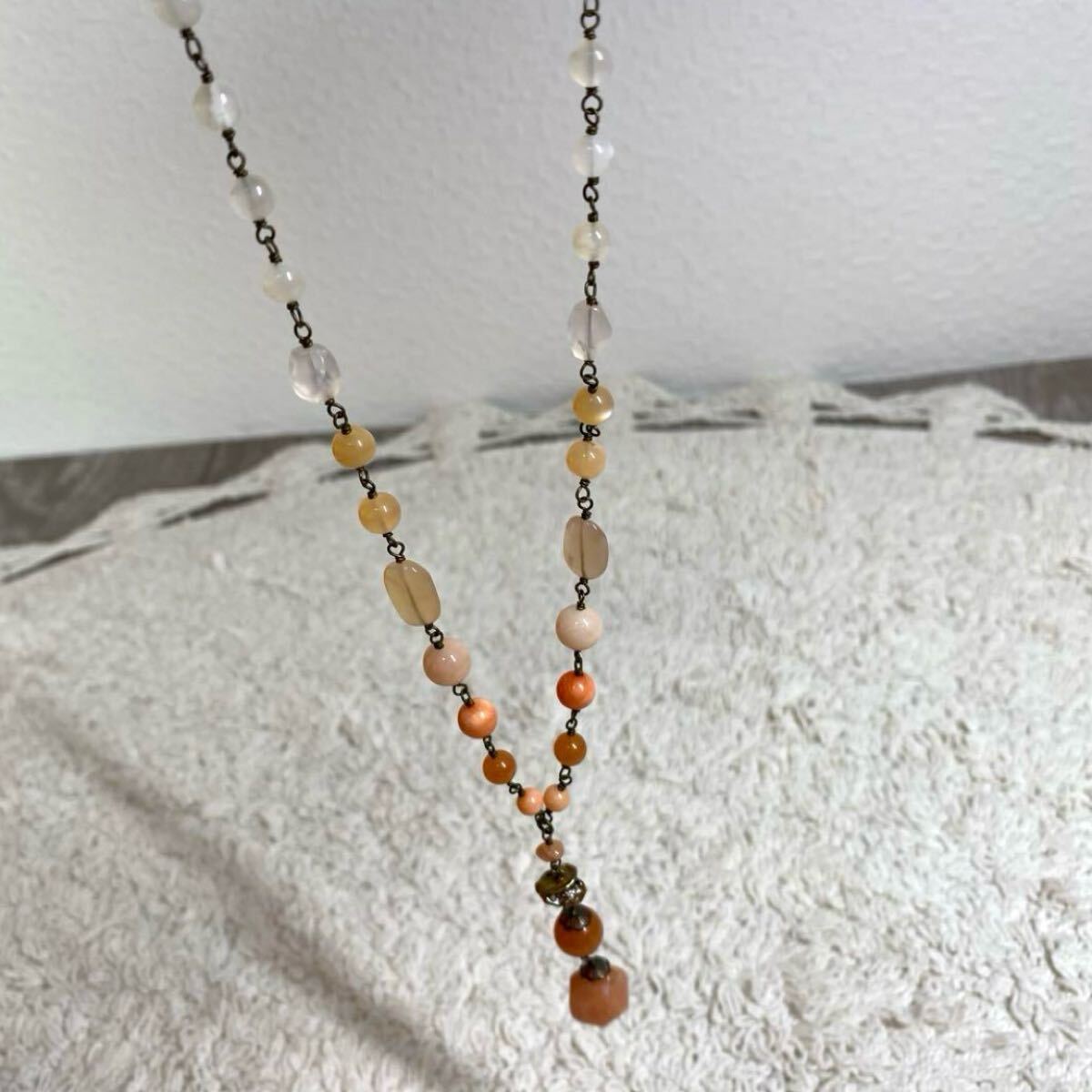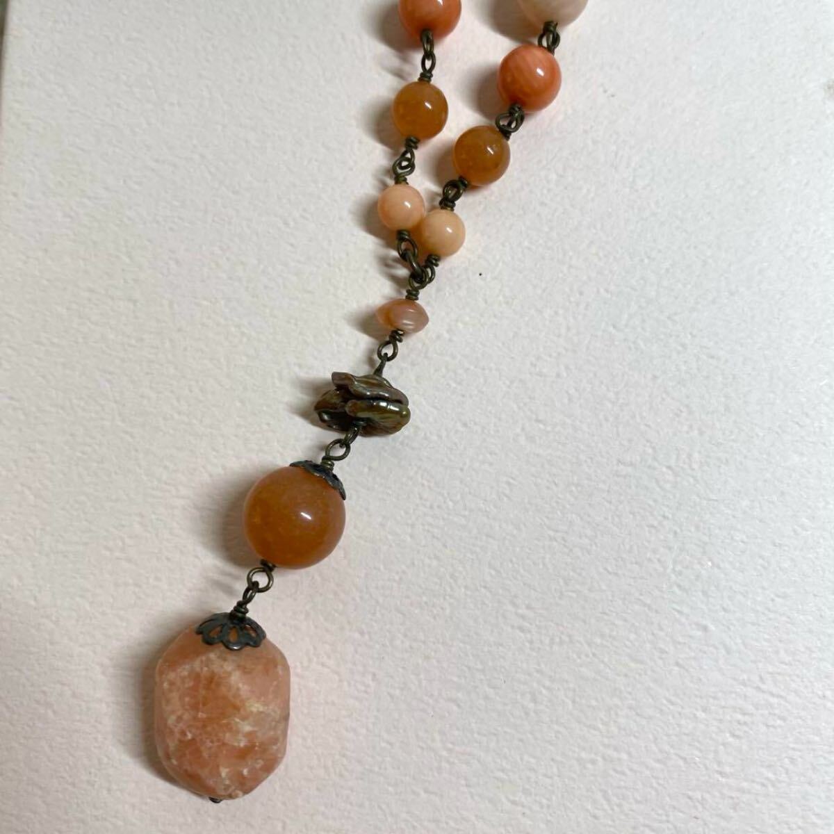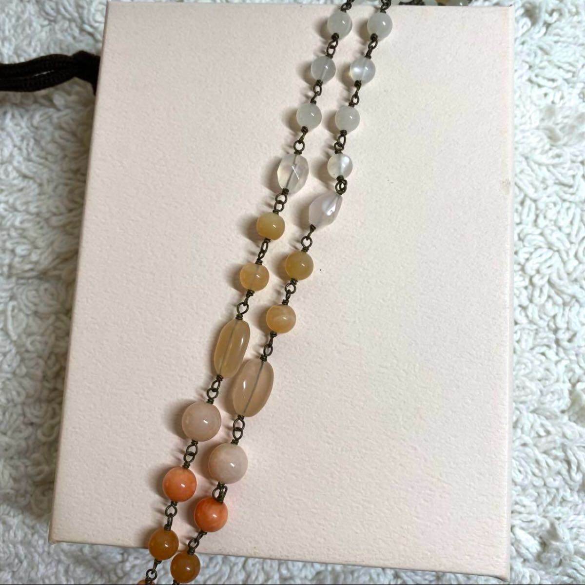 天然石を使用した薄いオレンジ系のネックレス、オリジナルポーチと箱付き。