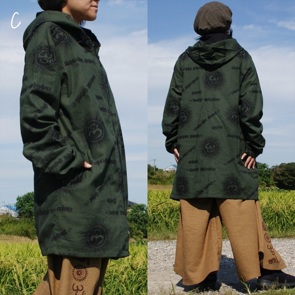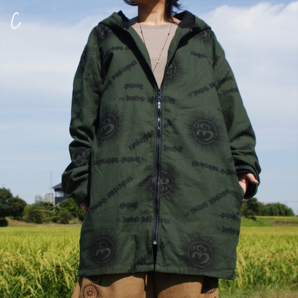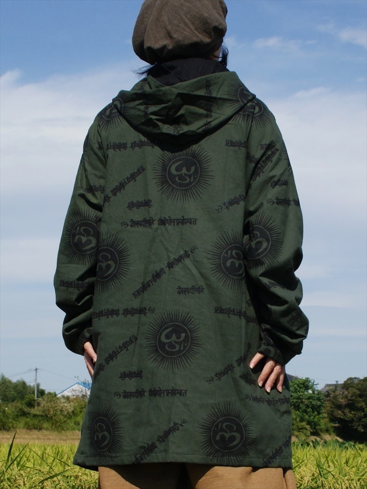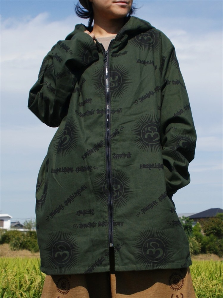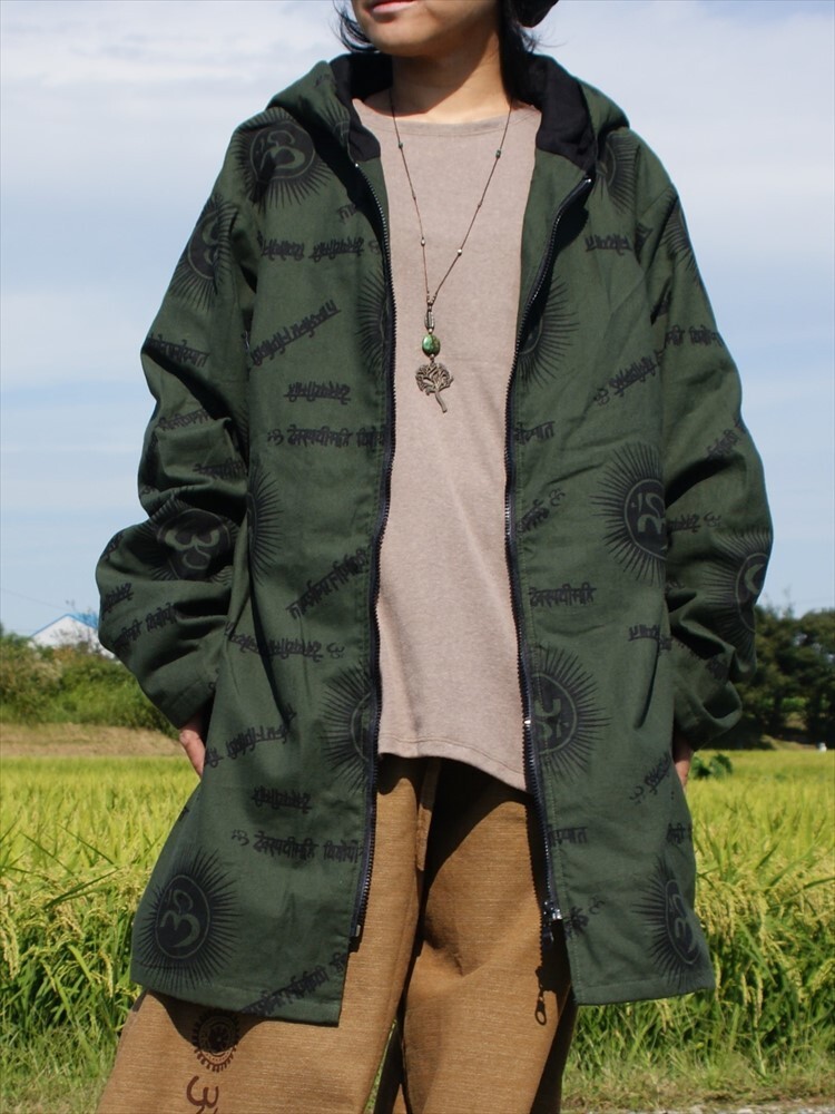 落ち着いた大人カラーに、ヒンドゥーの聖なる言葉「オーム」がプリントされたコットンパーカー♪使いやすいカジュアルデザインで、手軽に着られるライトアウターとしておすすめの1枚です。トレンド感のあるゆったりオーバーサイズでレイヤーコーデも楽々◎ユニセックスでお楽しみ頂けます。腰周りすっぽりの長め丈なので、この時期は冷え対策にもお役立ち。ロングシーズン楽しめるコットン素材の表地と柔らかコットンの裏地付き♪おしゃれエスニックな雰囲気をお楽しみ下さい♪