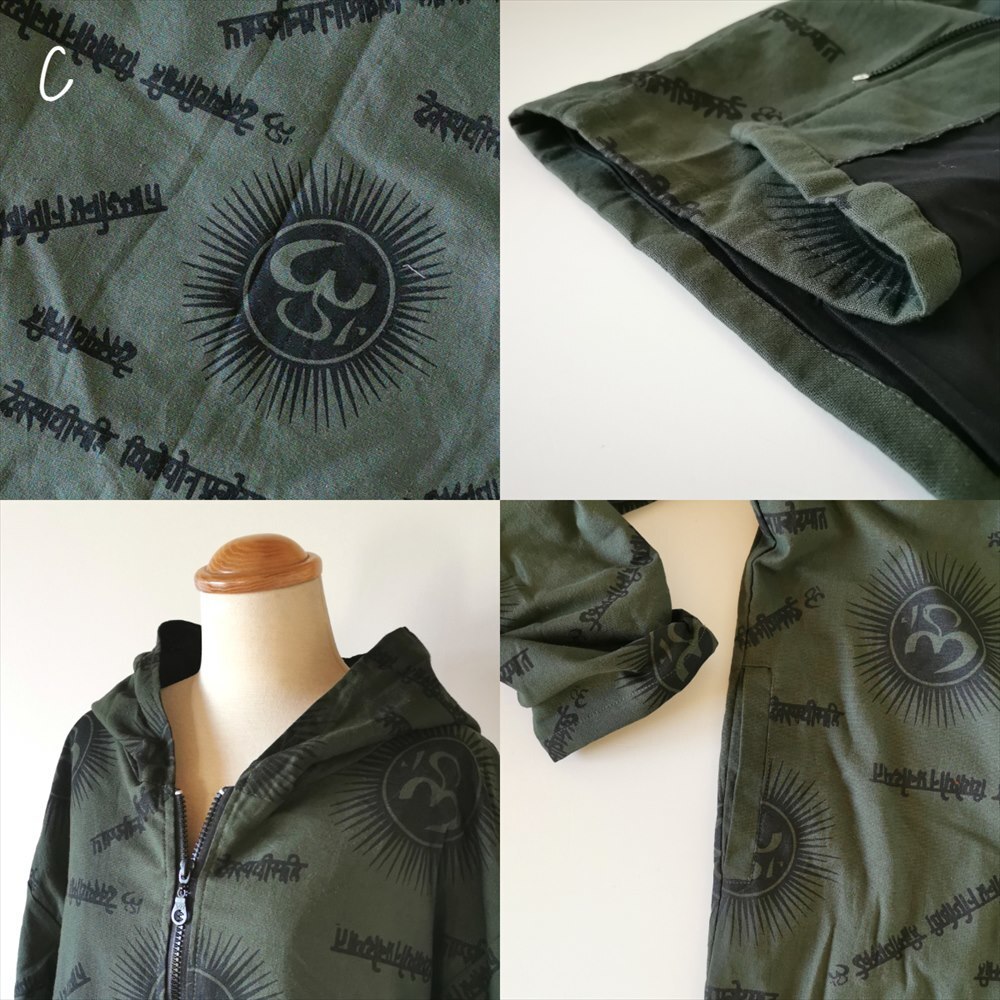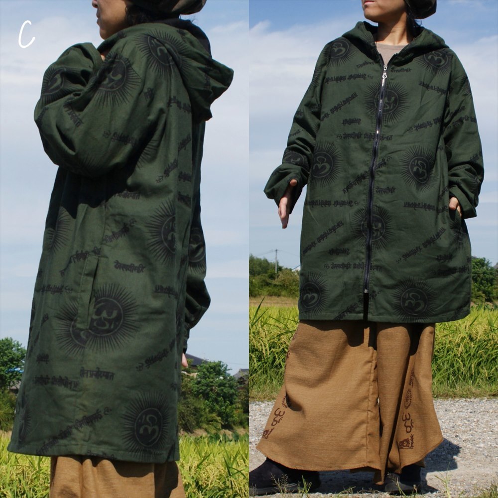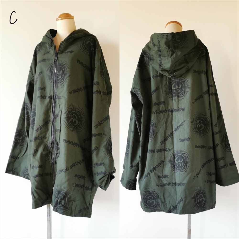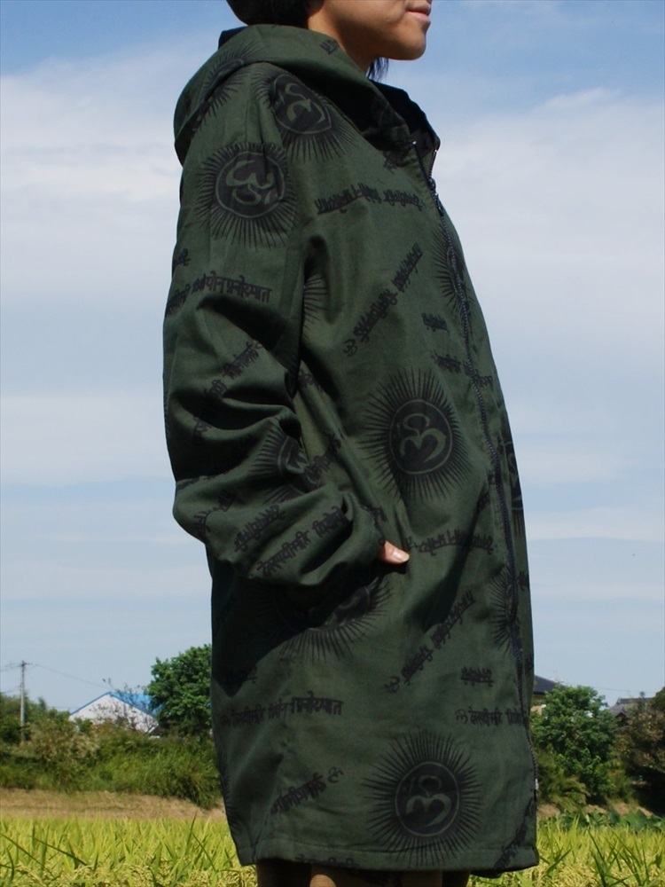 落ち着いた大人カラーに、ヒンドゥーの聖なる言葉「オーム」がプリントされたコットンパーカー♪使いやすいカジュアルデザインで、手軽に着られるライトアウターとしておすすめの1枚です。トレンド感のあるゆったりオーバーサイズでレイヤーコーデも楽々◎ユニセックスでお楽しみ頂けます。腰周りすっぽりの長め丈なので、この時期は冷え対策にもお役立ち。ロングシーズン楽しめるコットン素材の表地と柔らかコットンの裏地付き♪おしゃれエスニックな雰囲気をお楽しみ下さい♪
