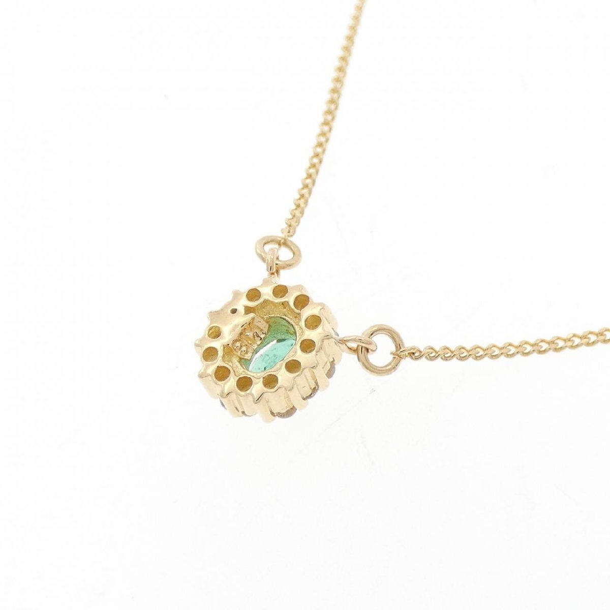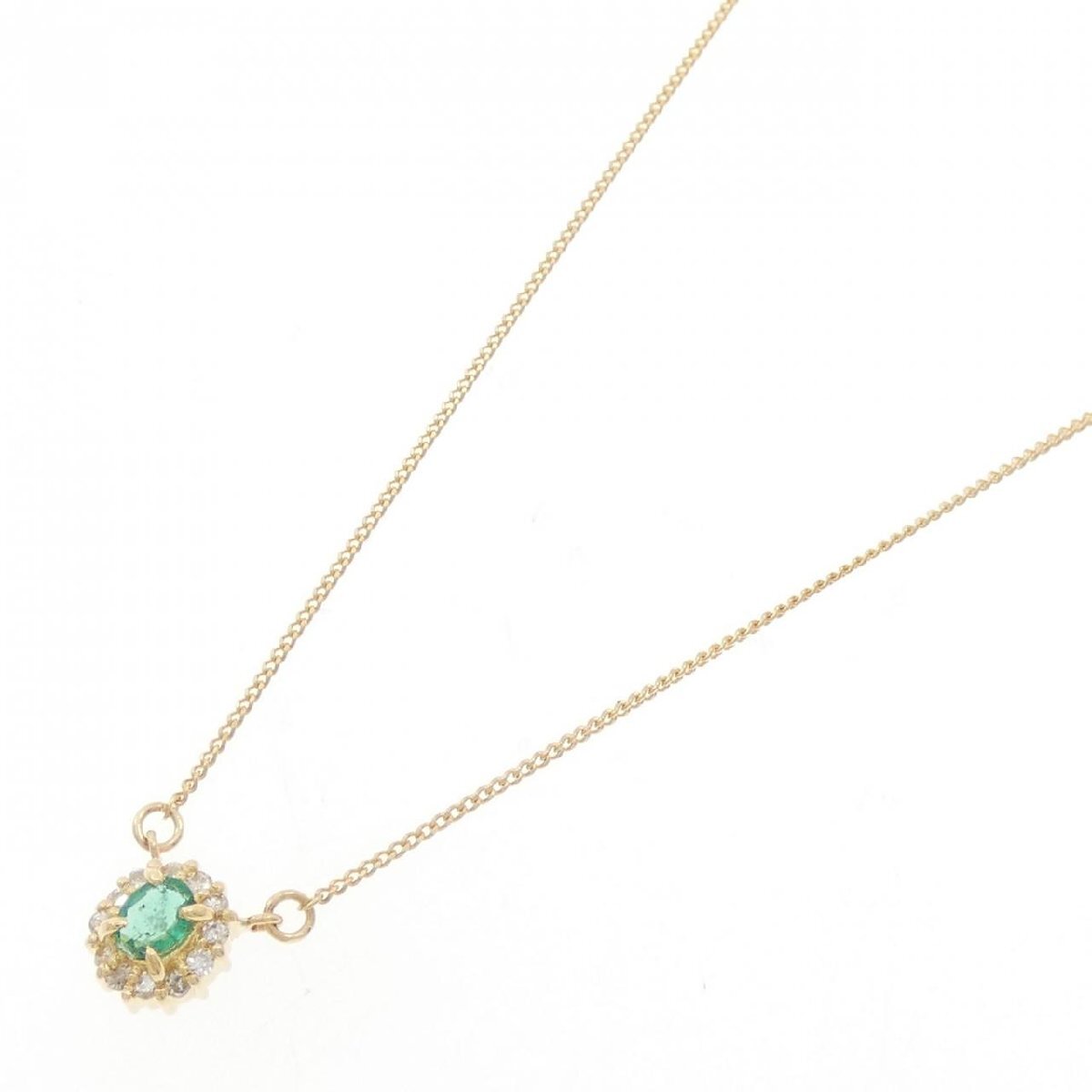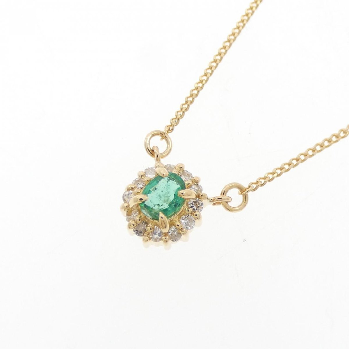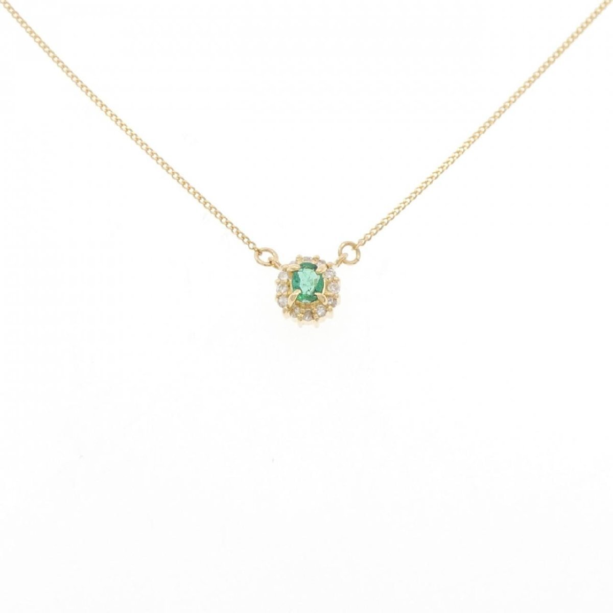 明るいグリーンカラーのエメラルドをキラキラと光るダイヤモンドが囲みます。胸元を上品に飾るネックレスです。