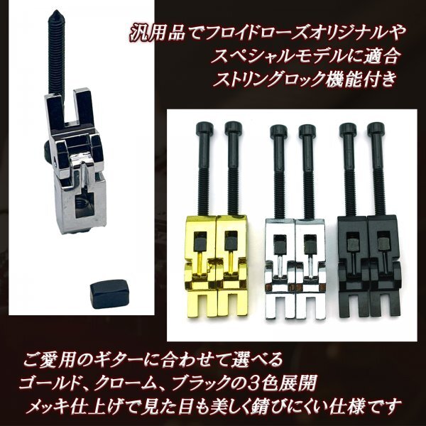 汎用品なのでフロイドローズオリジナルやスペシャルモデルに適合しストリングロック機能付き。メッキ仕上げで見た目も美しく錆びにくい仕様です。