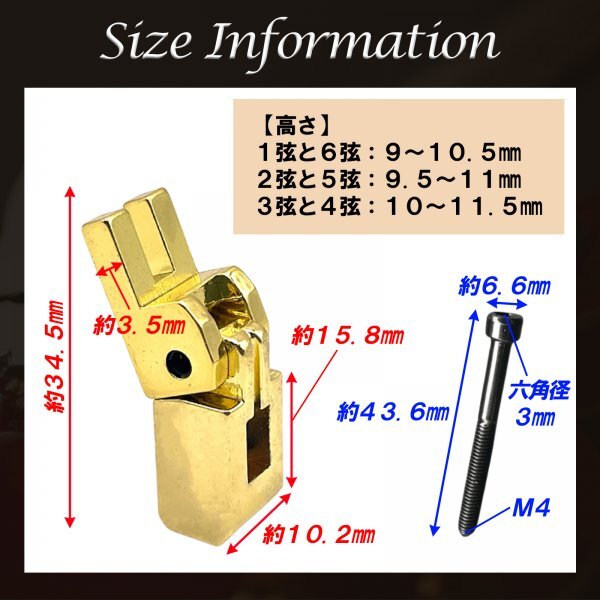 【サイズ】サドルサイズ:約34.5x10.2mm(10.2mmピッチ)、ネジサイズ:約43.6X6.6X4mm 六角径3mm 【高さ】1弦と6弦9.10.5 mm、2弦と5弦9.5-11 mm、3弦と4弦 10-11.5 mm