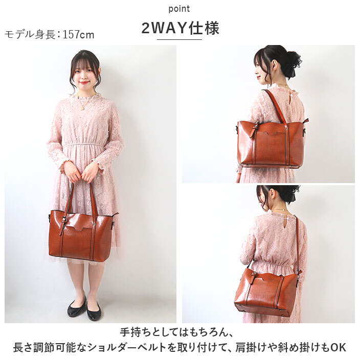 商品説明 | ・・シンプルでおしゃれなPUレザーの2WAYトートバッグが登場! ・【2WAY仕様】 ・手持ちとしてはもちろん、長さ調節可能なショルダーベルトを取り付けて、肩掛けや斜め掛けもOK。 ・【柔らかな生地感】 ・バッグ表面は光沢のあるPUレザー素材。お手入れもしやすく、使い勝手バツグン。 ・【ファスナー開閉】 ・メイン開口部は天ファスナー式で中身が見えずプライバシーを確保! ・【B5サイズが入る】 ・程よいマチがあり、500mlのペットボトルや長財布などB5サイズがすっぽり入る◎ ・【仕切りポケット】 ・メイン収納は仕切りにもなるファスナーつきポケット仕様!ポケットも多いので、ゴチャつきがちなカバンの中を仕分けし、整理整頓がしやすい。 ・【底鋲付き】 ・底鋲付きなので床に置いても鞄が自立するので、鞄の底が汚れてしまったり、擦れてしまうことを軽減! ・【通勤、通学に】 ・機能性とデザイン性で、通勤・通学用にピッタリ! ・【ポケット仕様】 ・メイン収納:オープンポケット×2、ファスナー付きポケット×2 ・フロント:オープンポケット×1 |