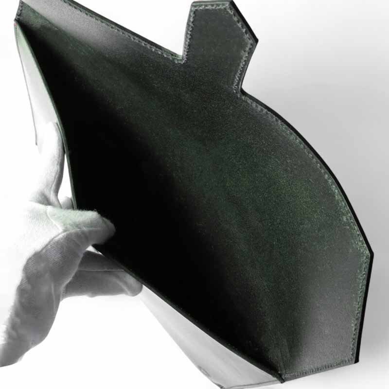 ・継ぎ目のない1枚革のレザーを使用した、金具を使用しないすっきりとしたシンプルなデザインが魅力。