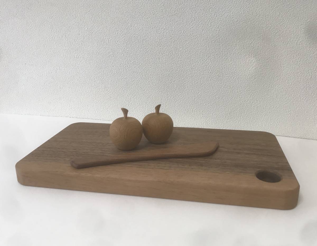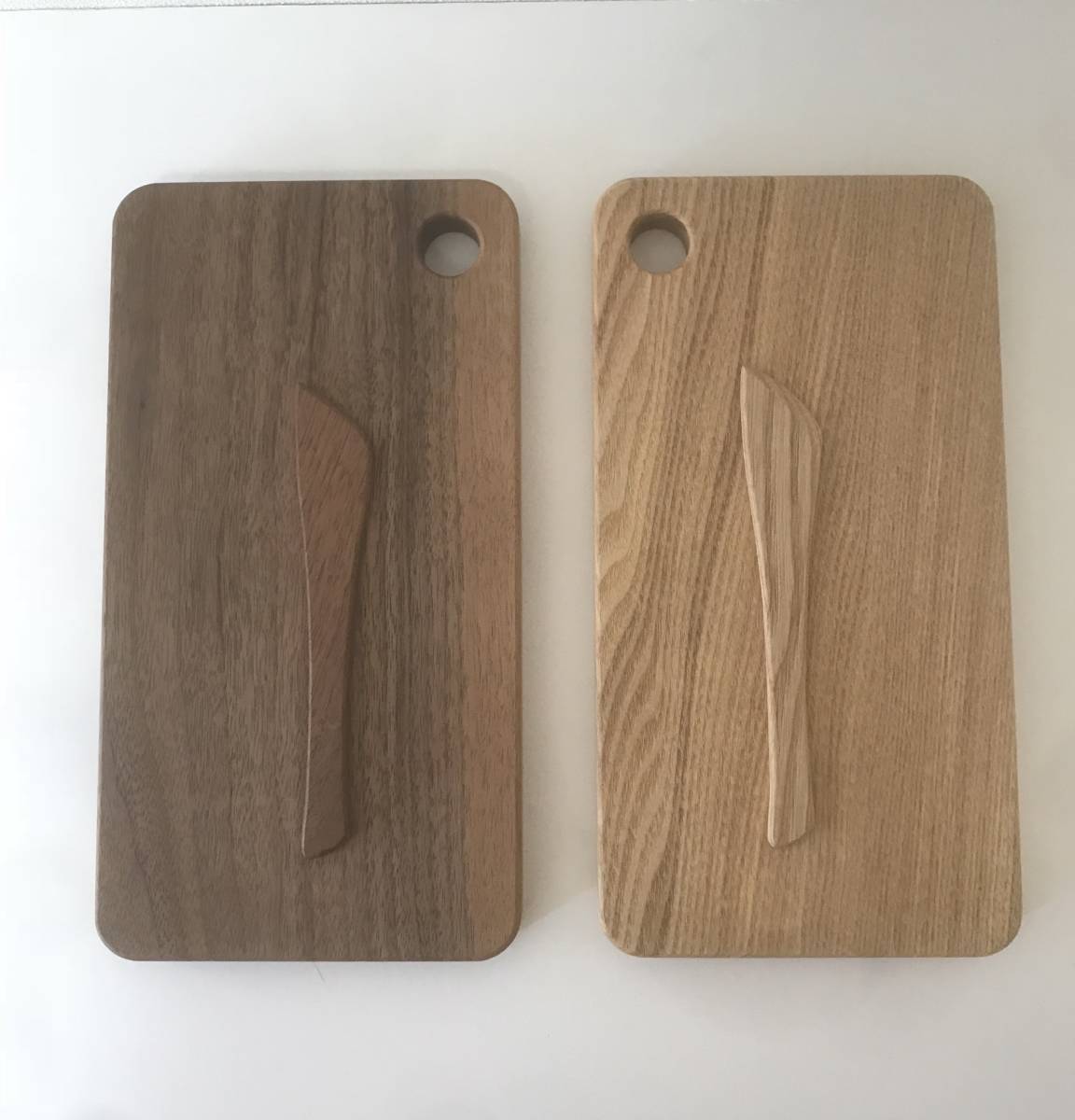 ウォルナット材とタモ材で製作したカッティングボード&ナイフです。