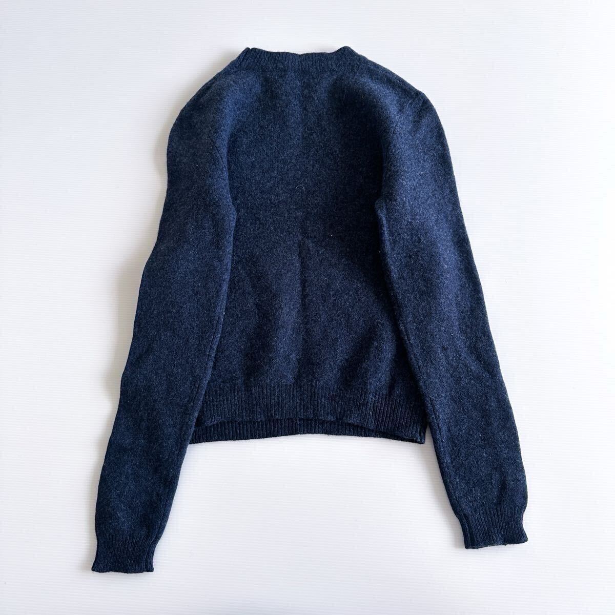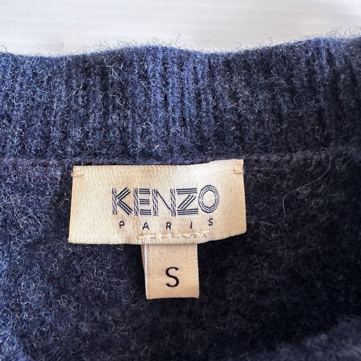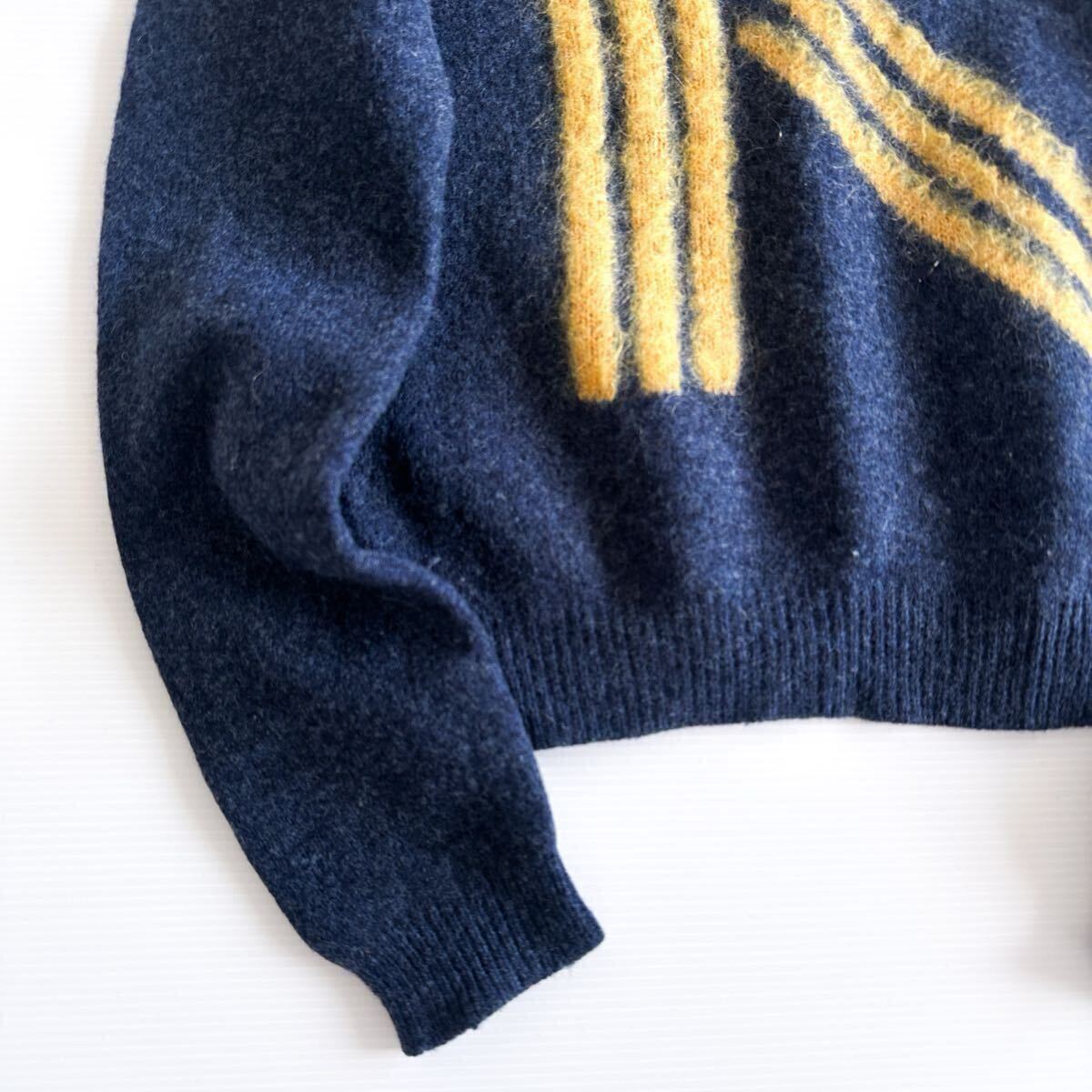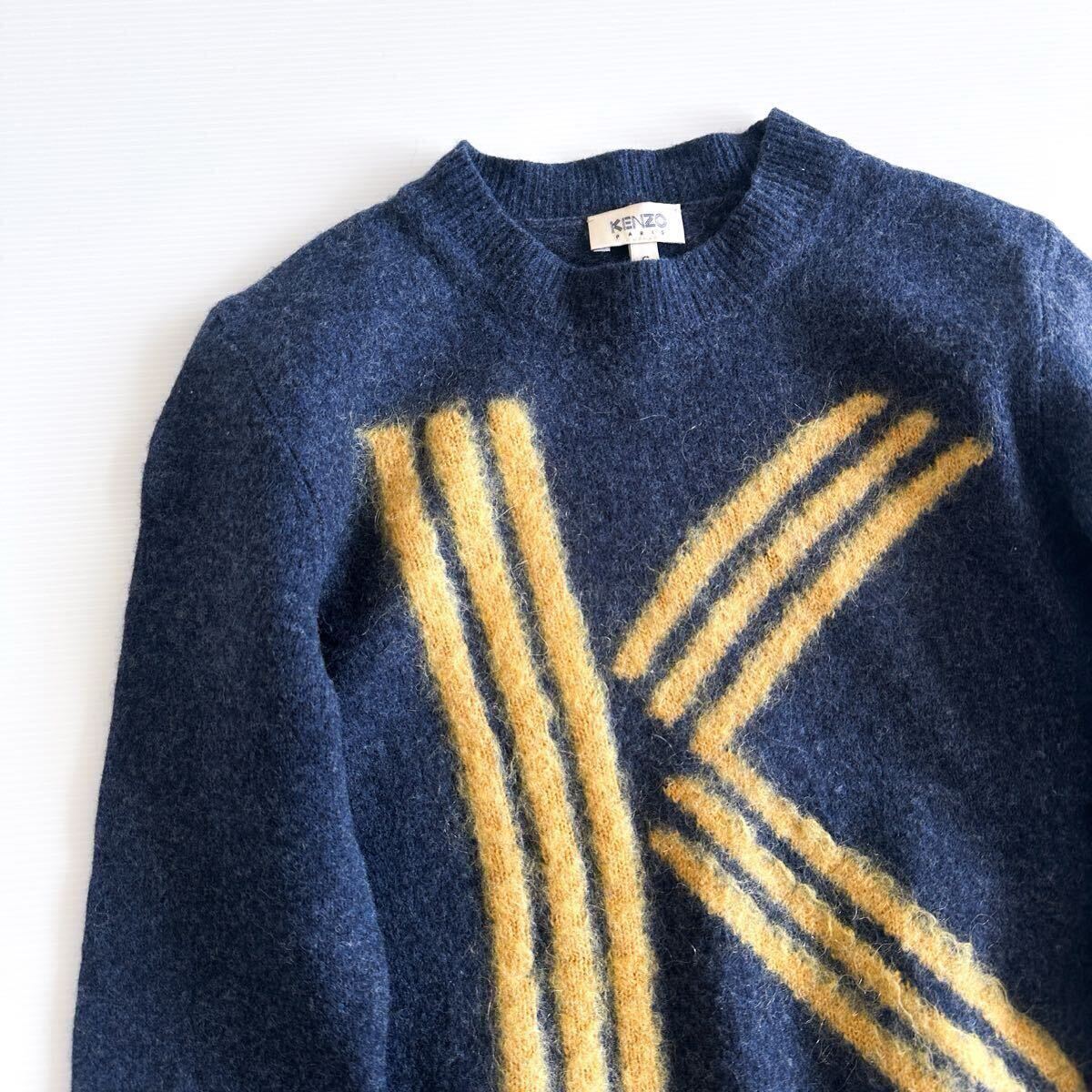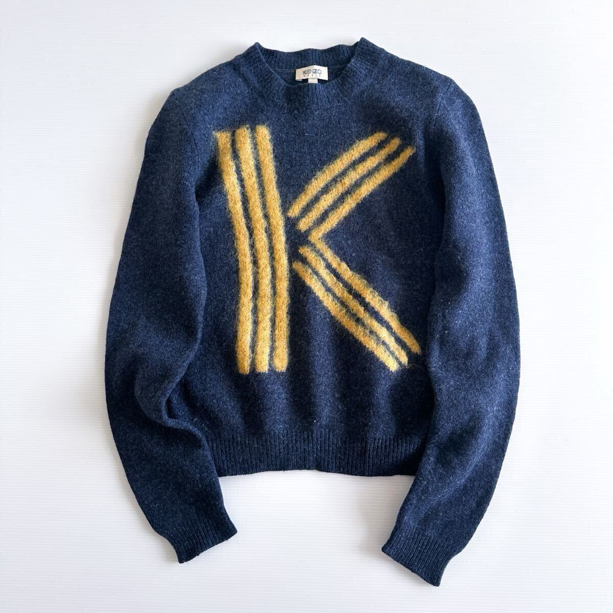 ネイビー地に毛足の長いマスタードイエローで大胆に描いた “K” が目を引く〈KENZO PARIS〉のウールニット。