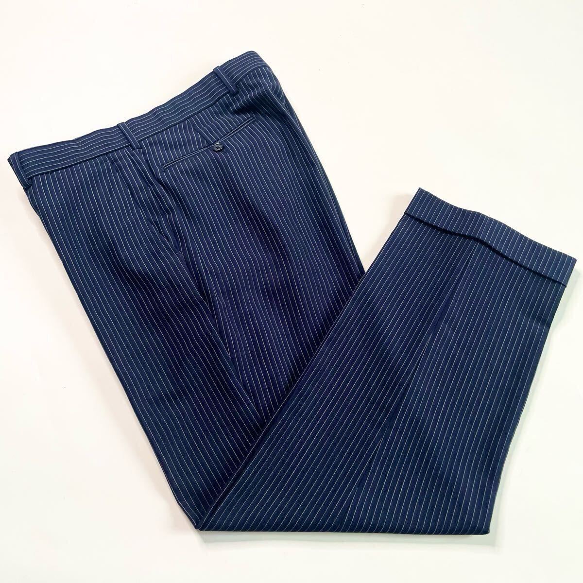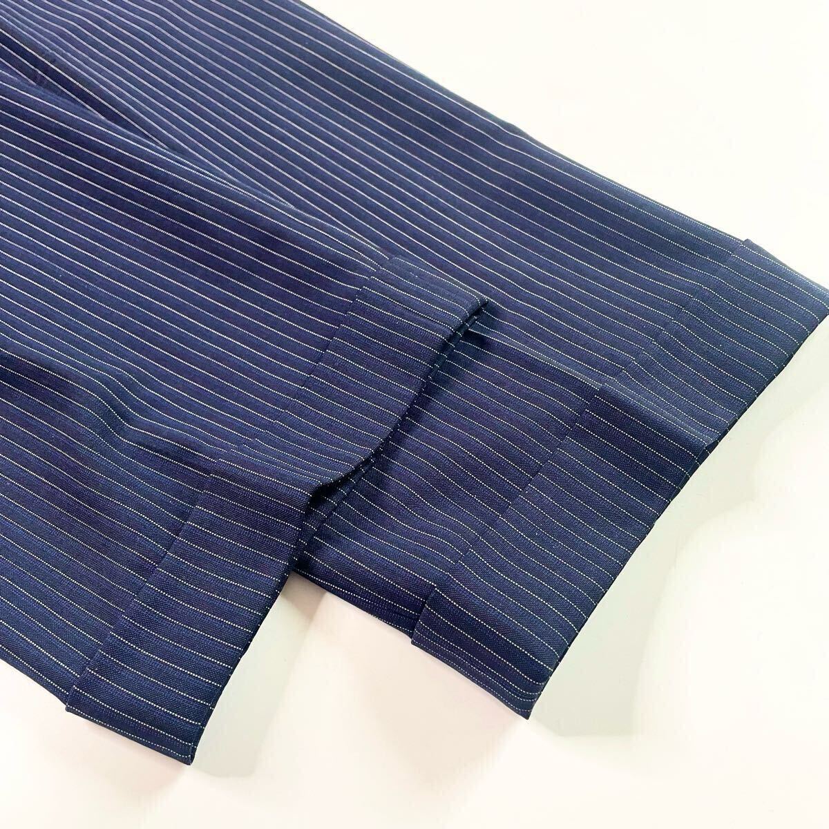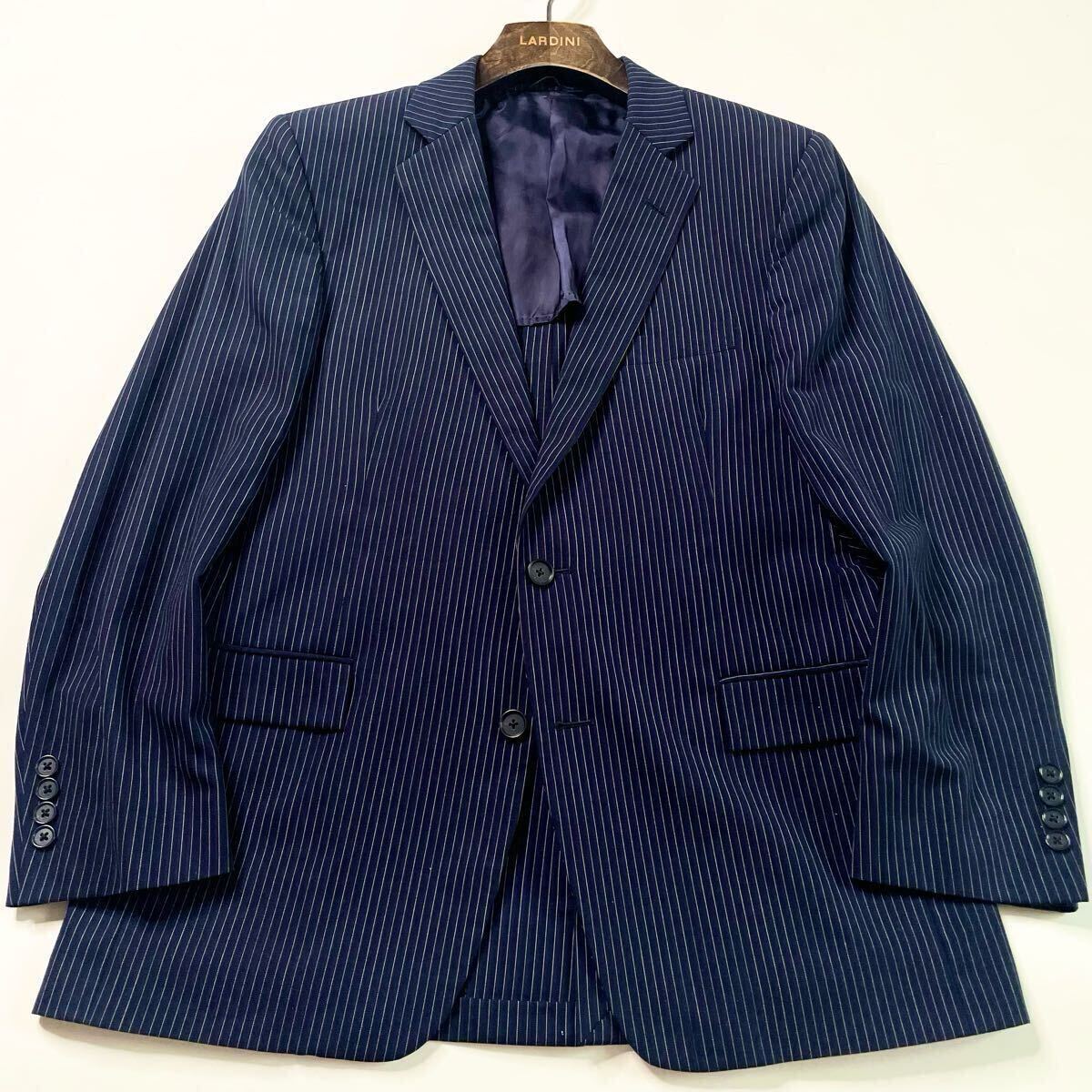 仕様: セットアップスーツ、ネイビーストライプ、背抜き、センターベント、ノータック裾シングル、ブルーパイピング