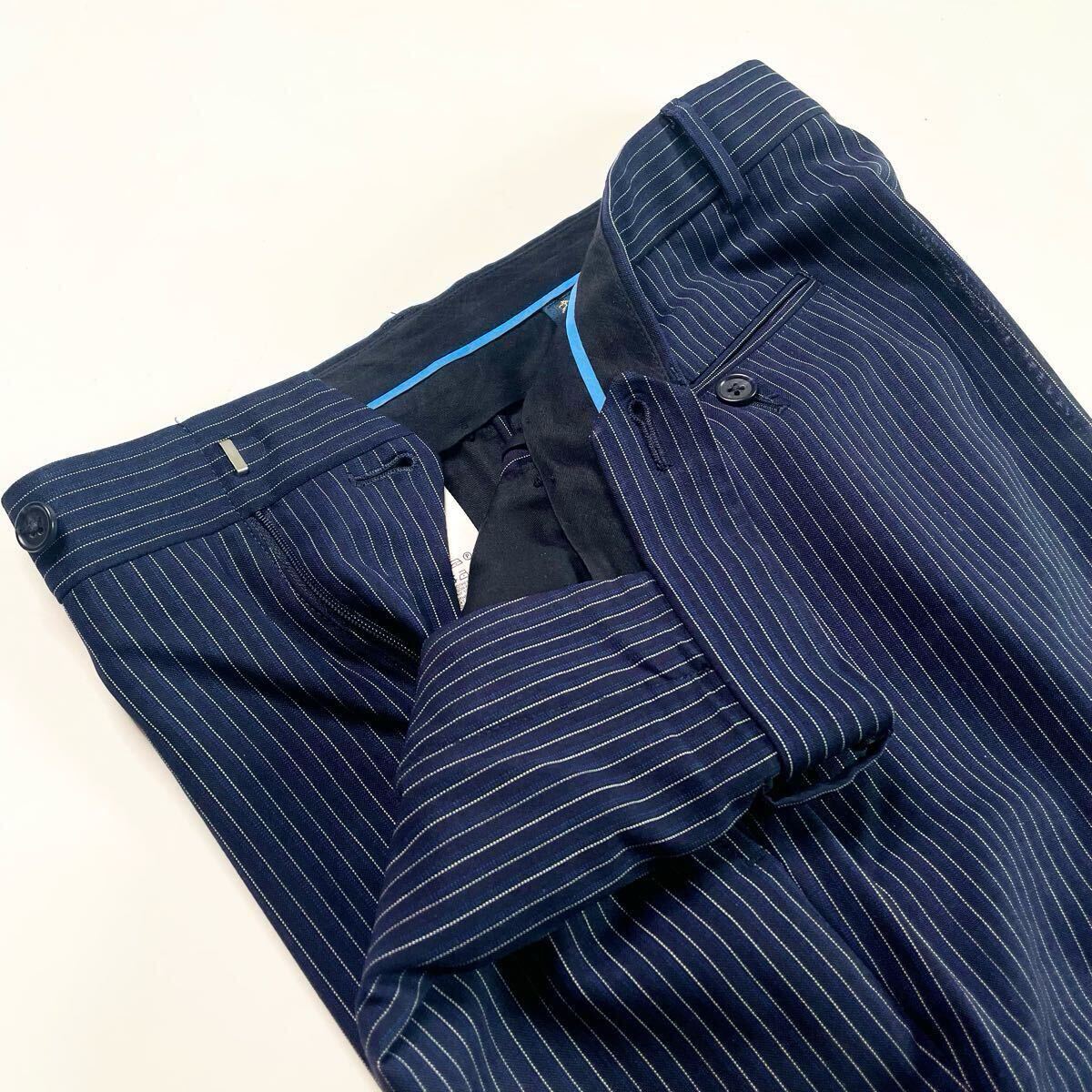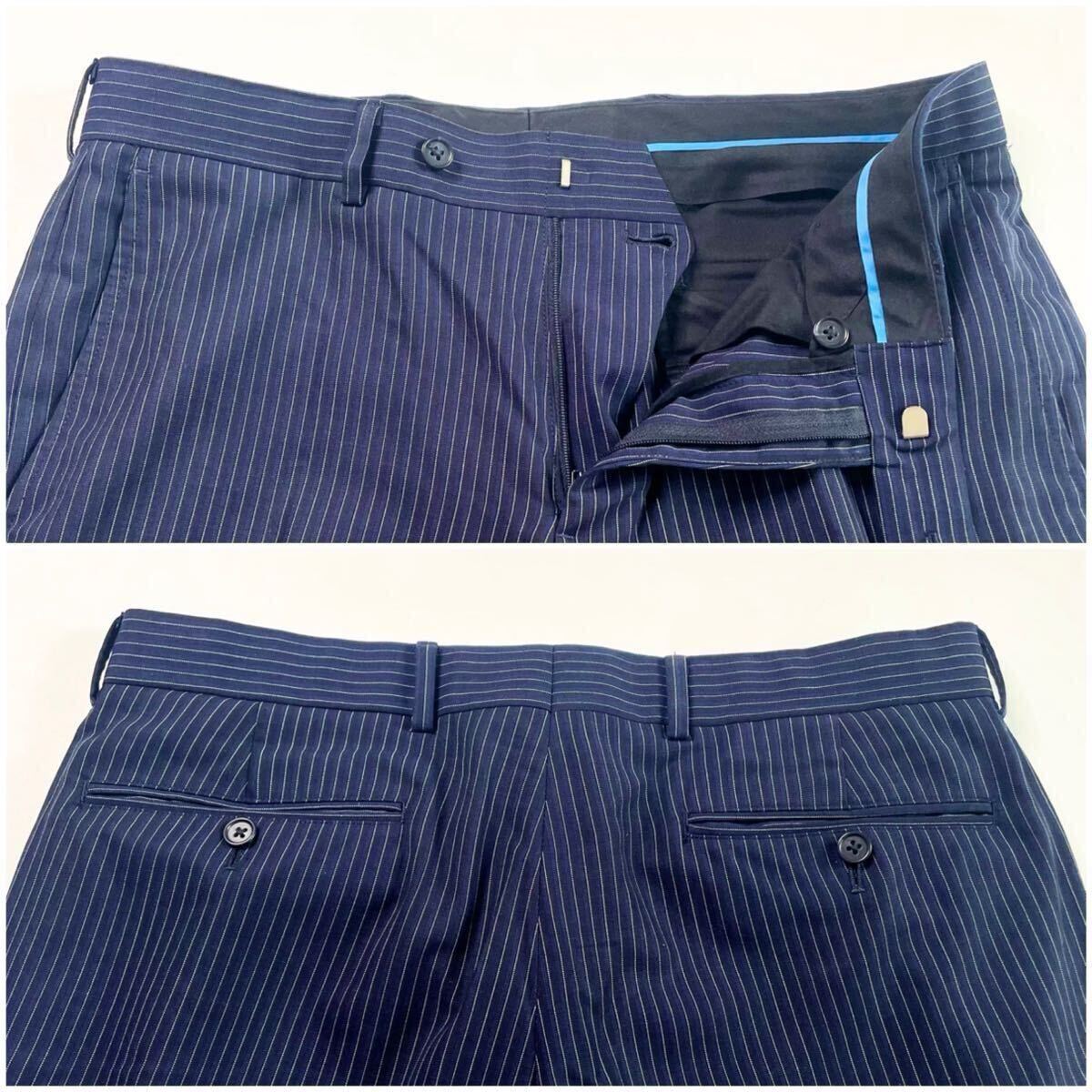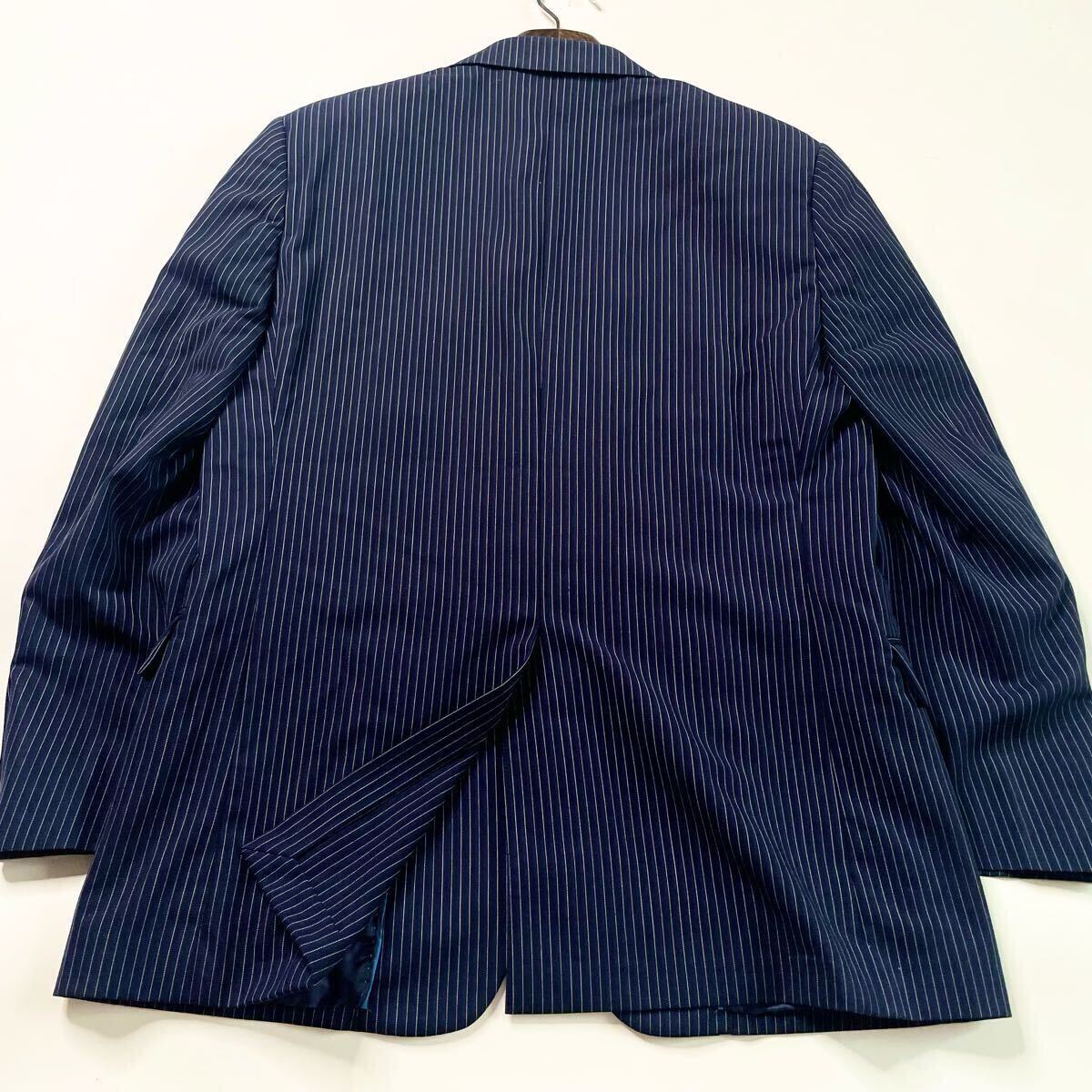 仕様: セットアップスーツ、ネイビーストライプ、背抜き、センターベント、ノータック裾シングル、ブルーパイピング