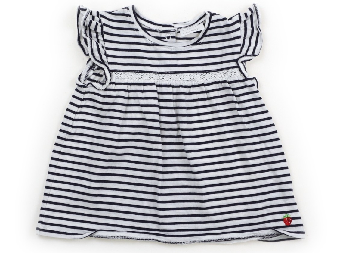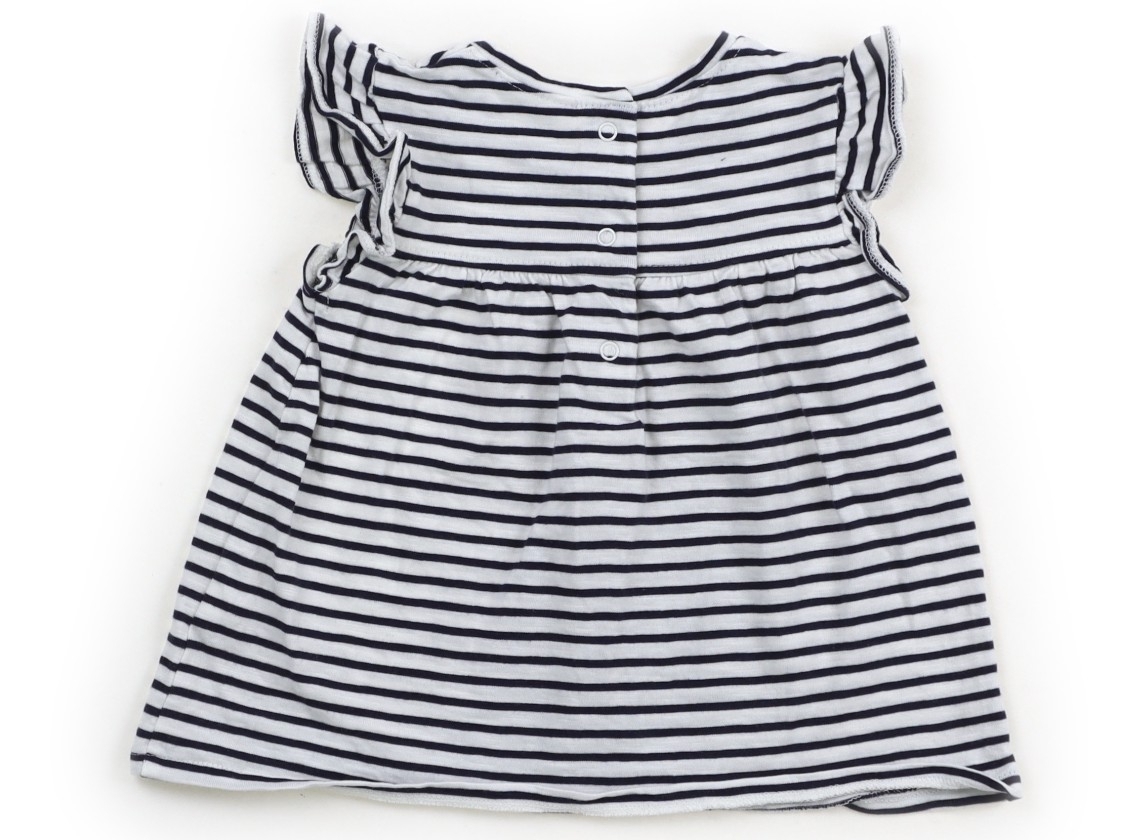 実際のサイズ表記は9-12mthsです。天竺カットソー生地です。裾と袖フリル端に若干ヨレがありますが、目立つ汚れはありません。背中ドットボタンあき。