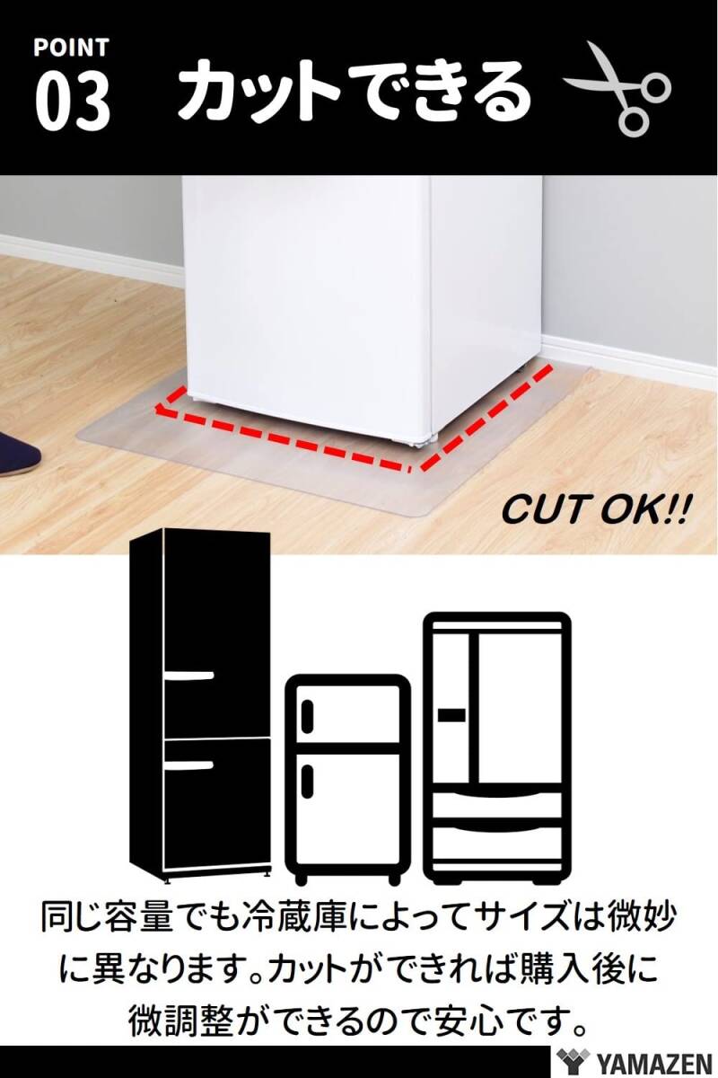 説明 \床のキズや汚れを防ぐ/ 山善「冷蔵庫下マット」 ●PVC素材だから汚れやシミに強く、熱にも強い ●ハサミでカット可能 ●汚れを残したくない賃貸住まいの人にオススメ