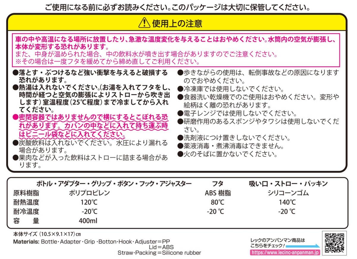 ●アンパンマンと一緒にお出かけ!お子様が喜ぶかわいい水筒です。 ●ワンタッチでらくらくオープン!ストローが付いているので、こぼさず飲みやすいです。 ●スポーツドリンクを入れても安心なプラスチック製です。 ●BPAフリーのプラスチックなのでお子様にも安心してご使用できます。 ●肩ひもつき。取りはずしができるので洗いやすいです。 ●専用(別売り)の「替えストロー(4903320042247)」と「替えパッキン(4903320042230)」がございます。