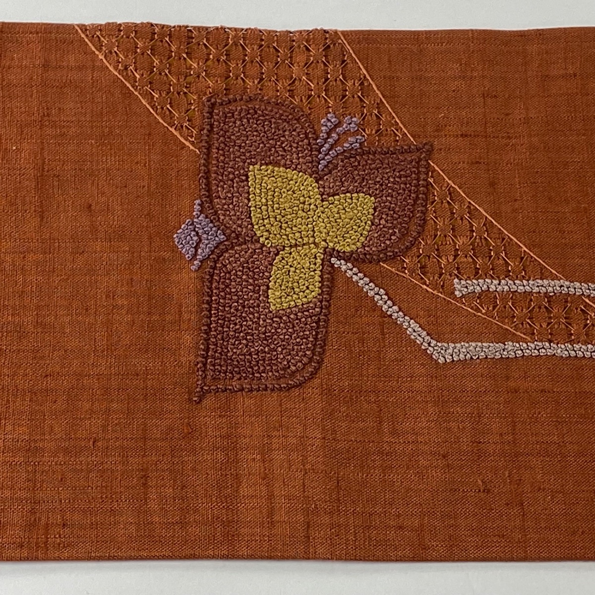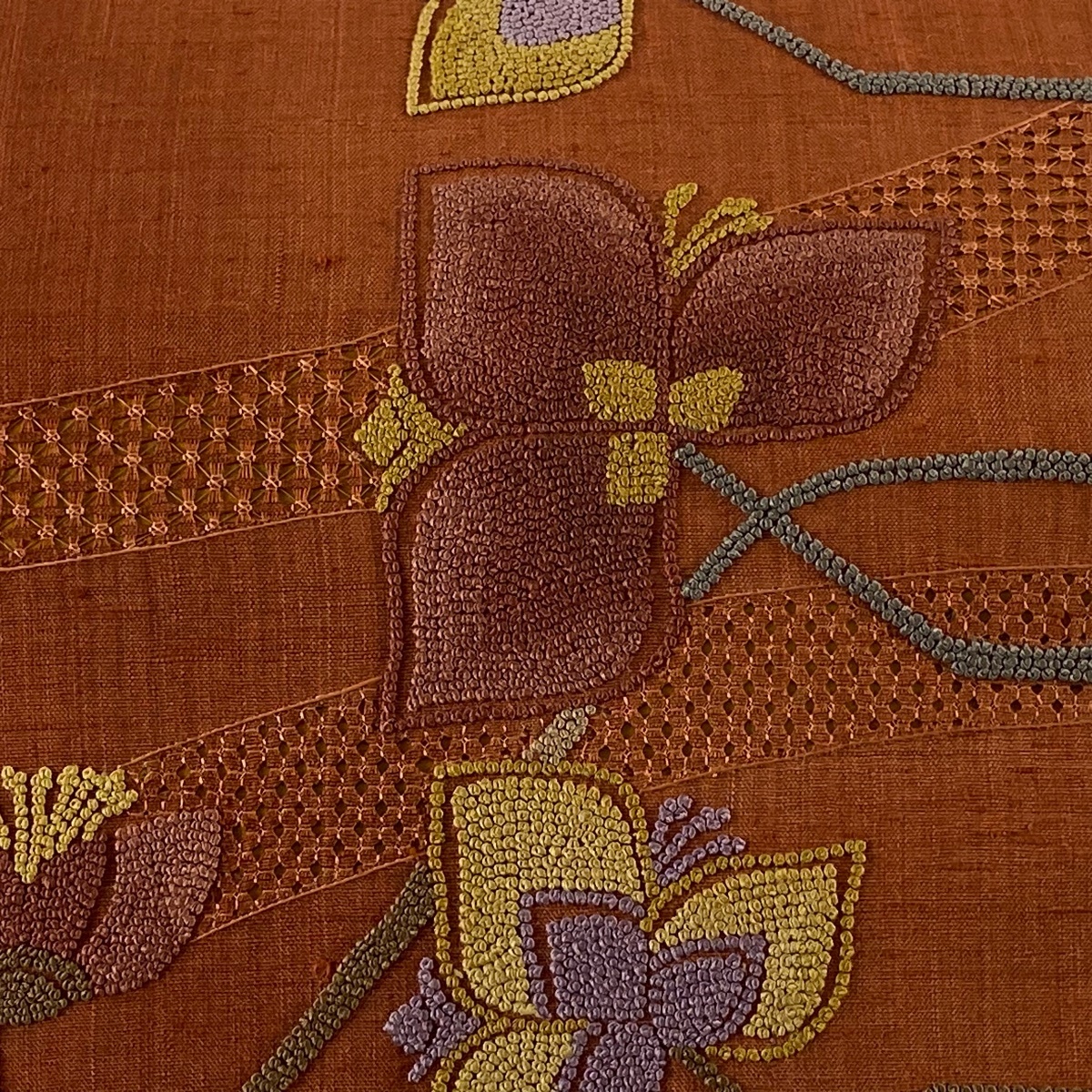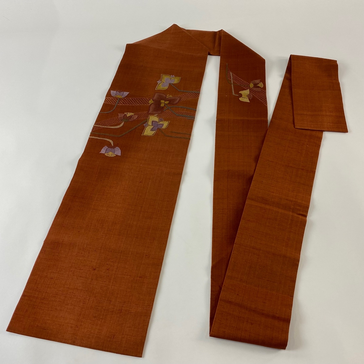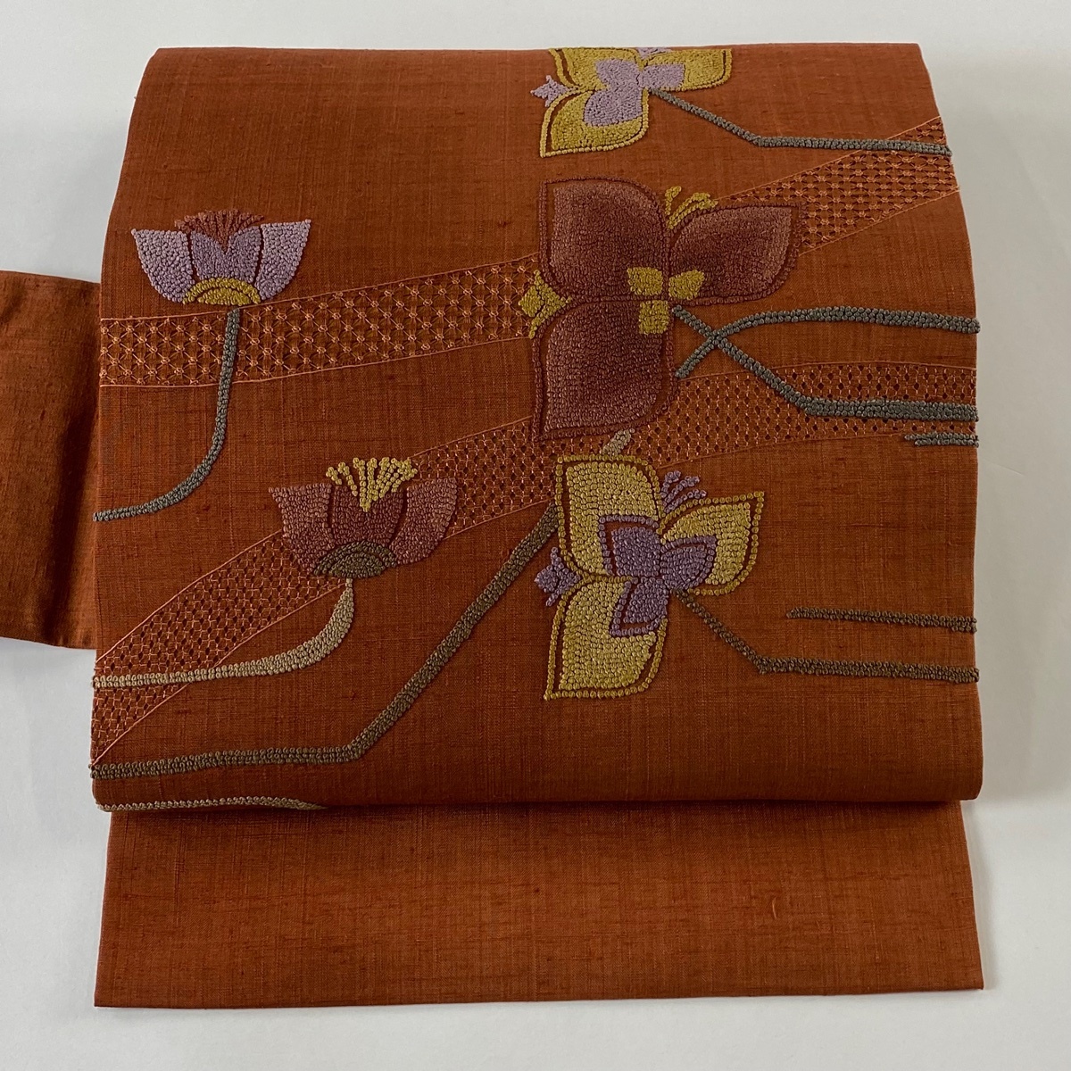 | 名古屋帯 名品 草花 刺繍 赤茶 正絹 【中古】 |