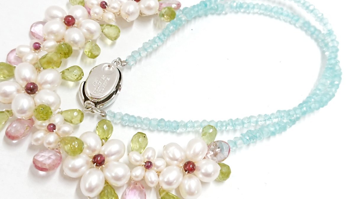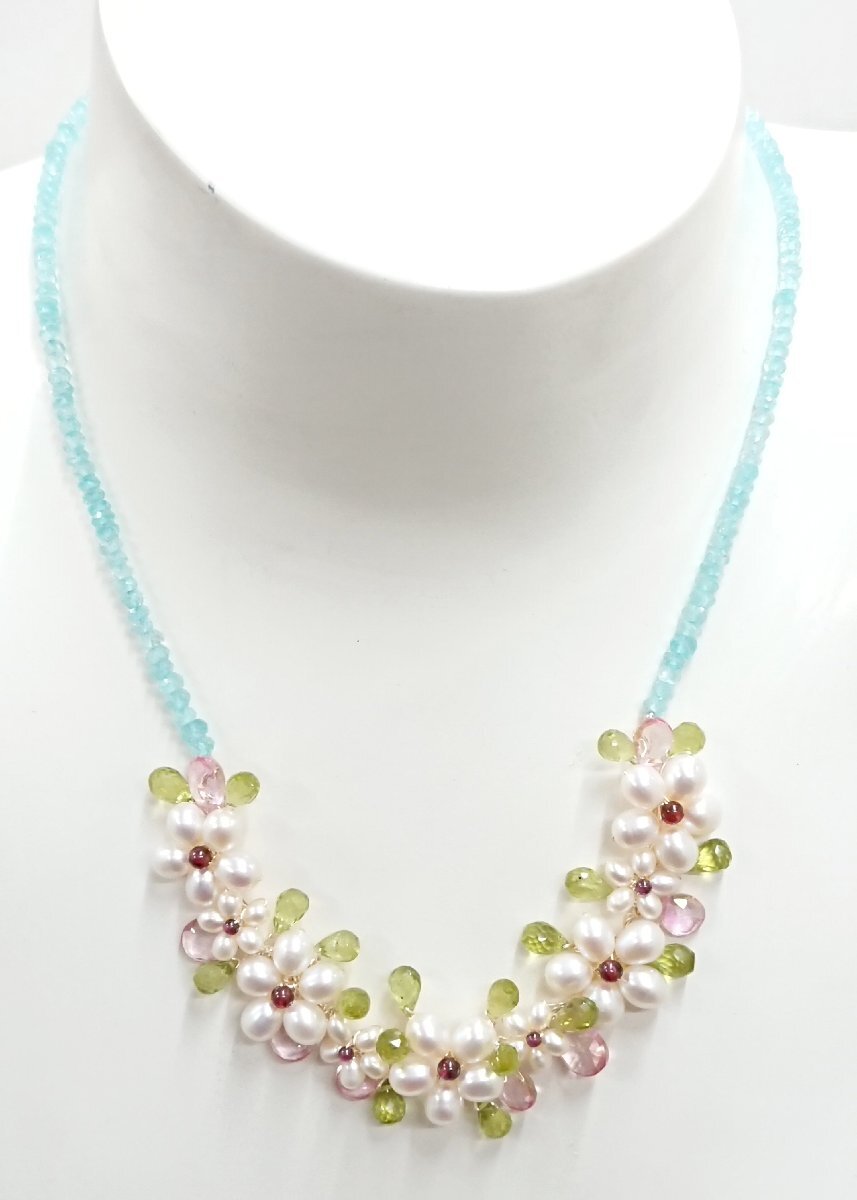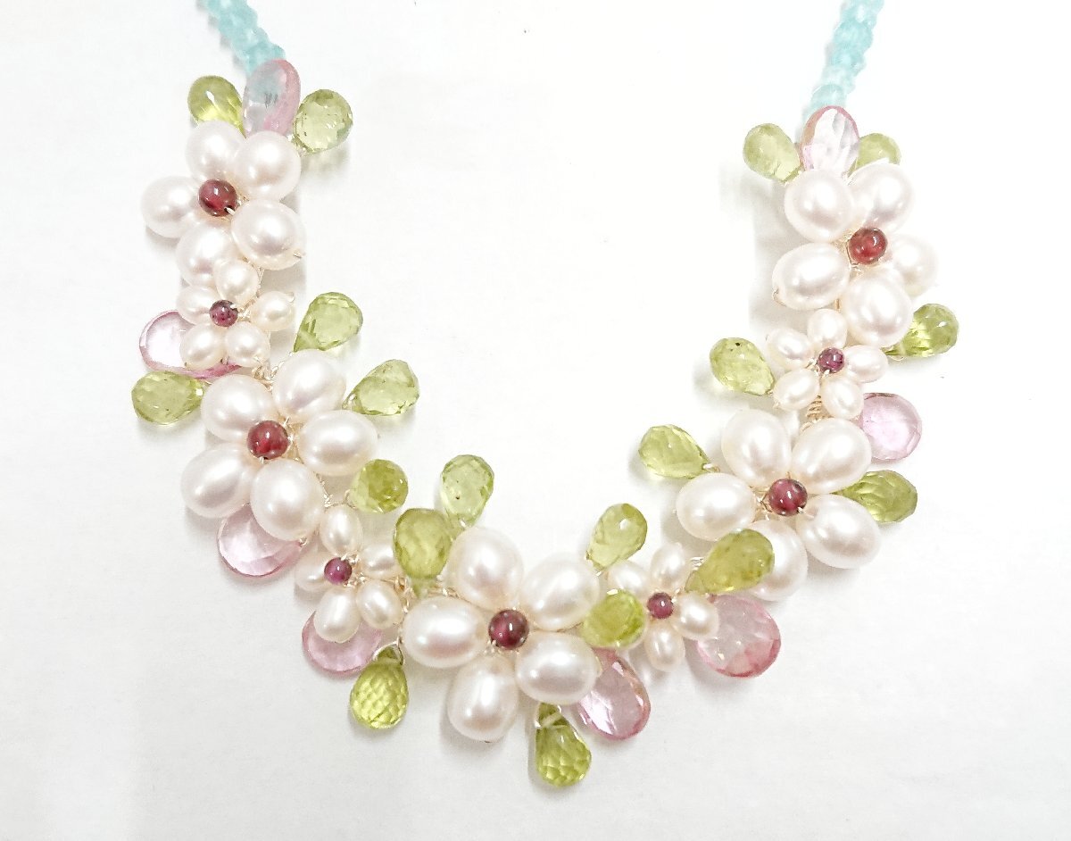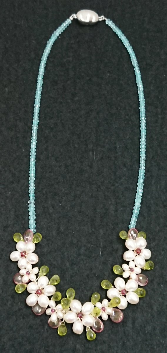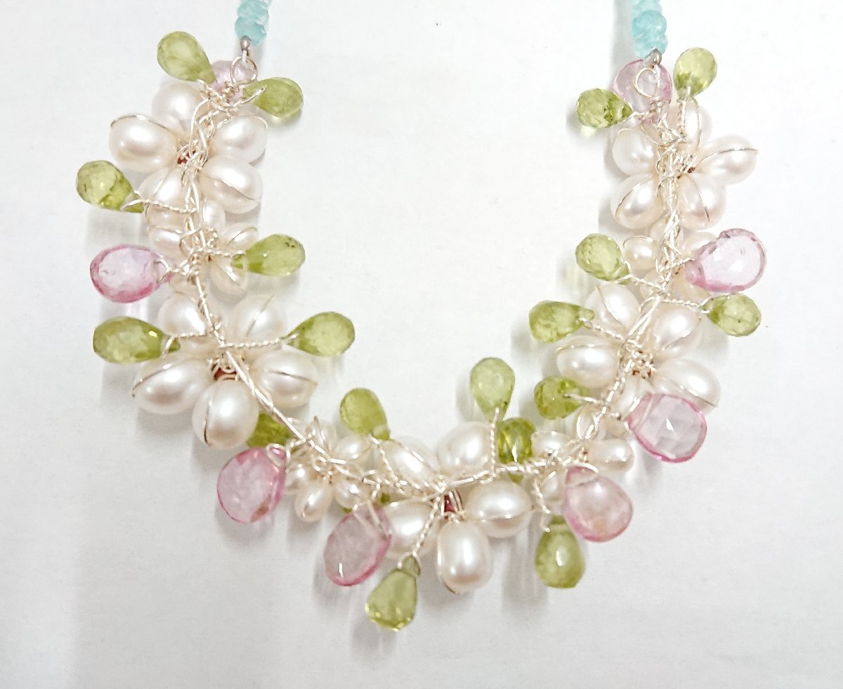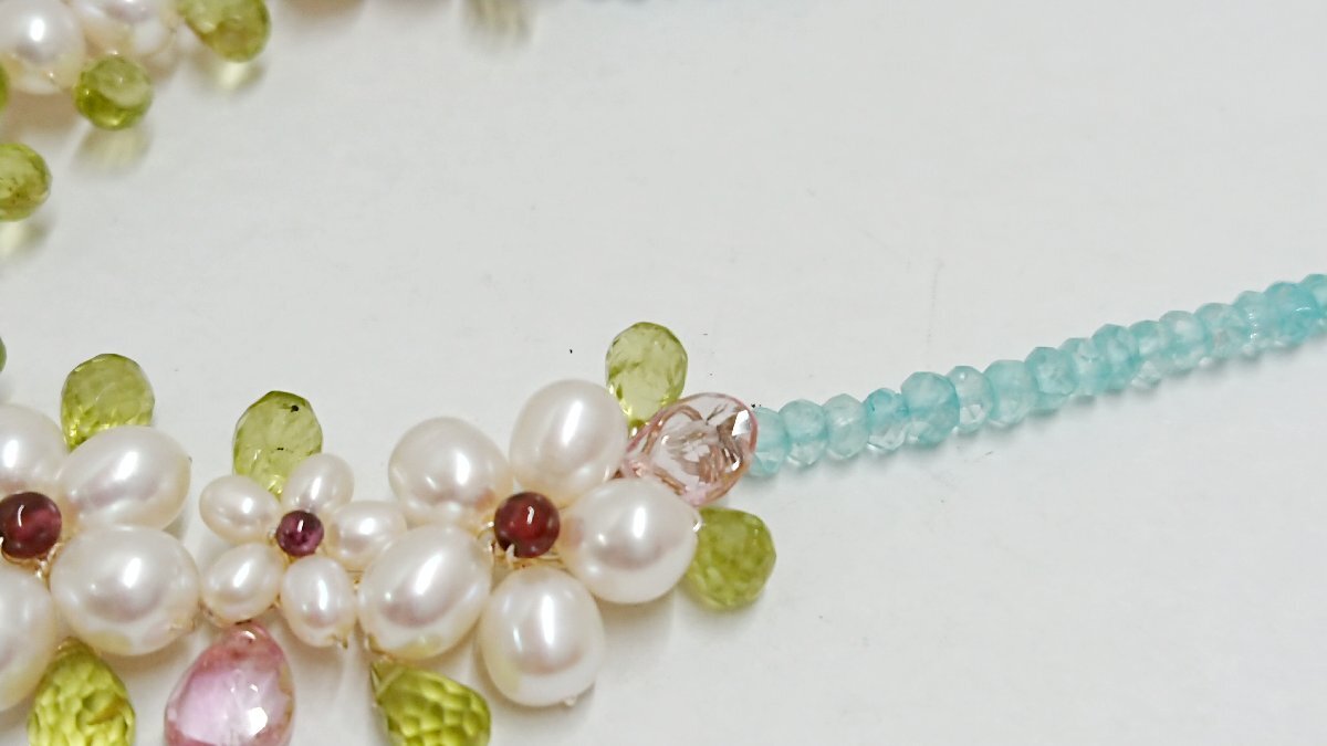 カラーストーンネックレス♪マルチカラー ネックレス 淡水パール ぺリドット ガーネット トパーズ(コーティング) カード式鑑別書付き*