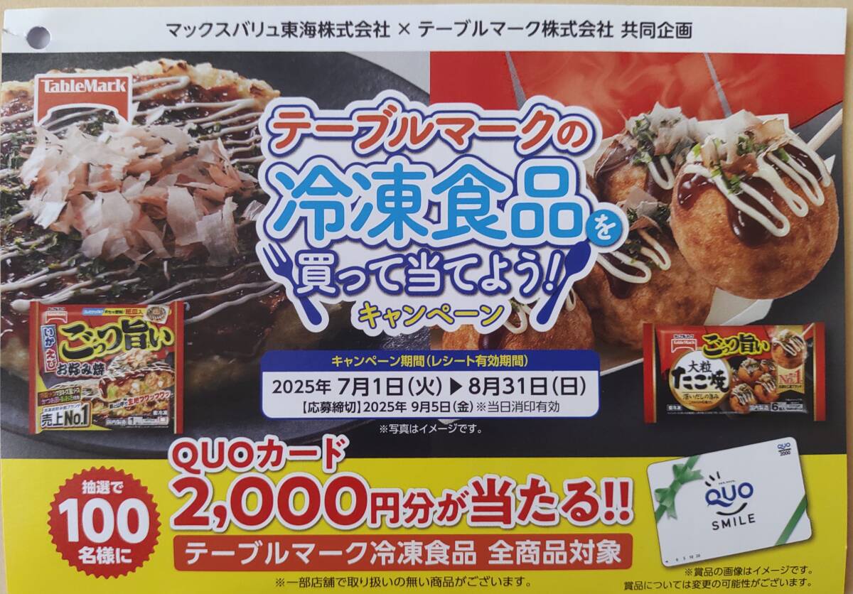 テーブルマークの冷凍食品を買って当てようキャンペーンに応募できるレシート1枚(対象商品含む合計500円以上購入)+専用応募ハガキ1枚の出品です。