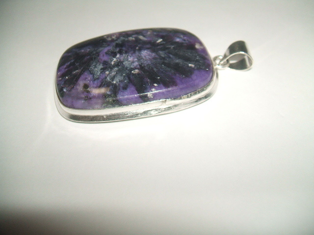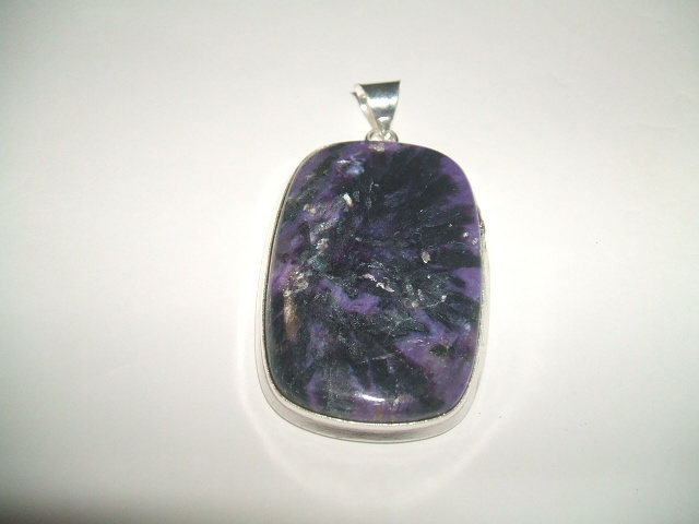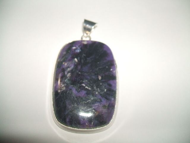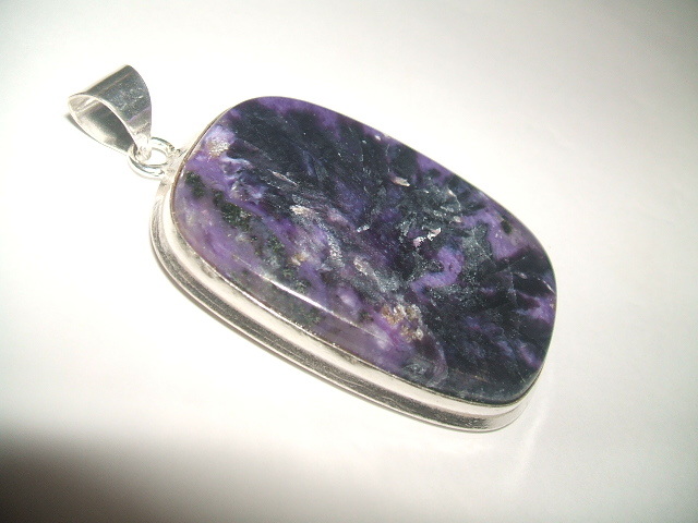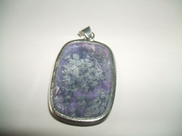 大きな長方形型のチャロアイトトップです。石の大きさは4.3x3センチ。金属はシルバーで925の刻印があります。