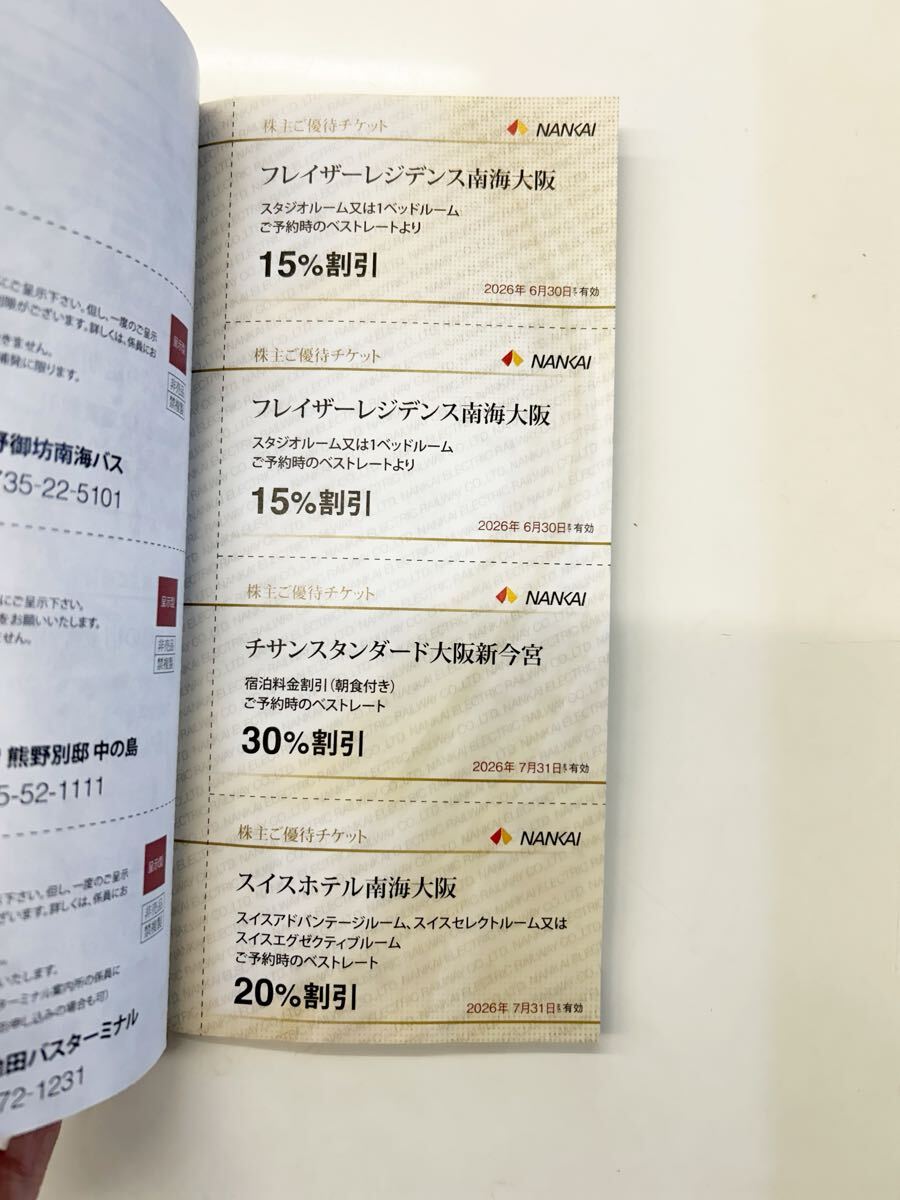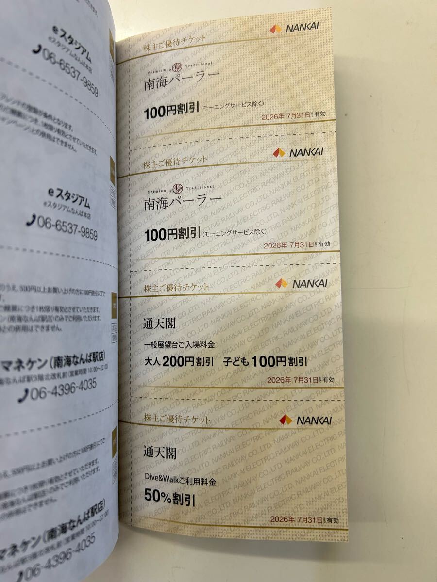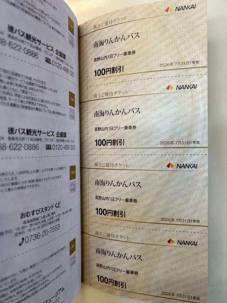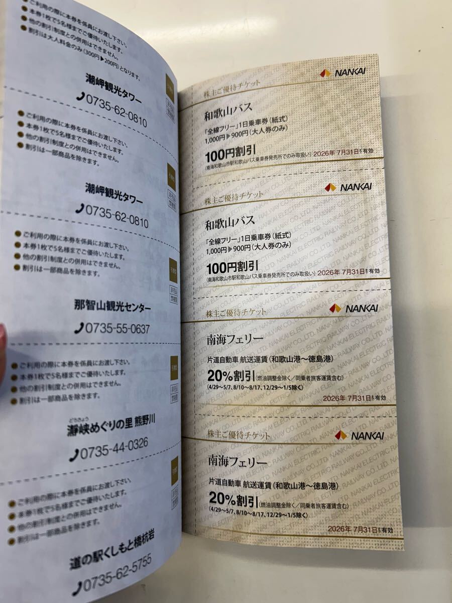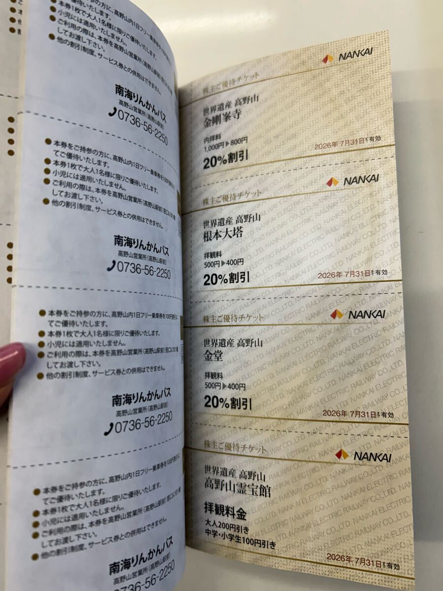 南海電気鉄道の株主ご優待券で、複数の店舗で割引が利用可能。