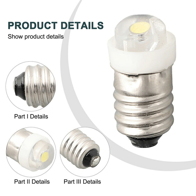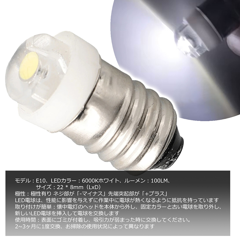 モデル:E10、LEDカラー:6000Kホワイト、ルーメン:100LM、サイズ:22 * 8mm(LxD)