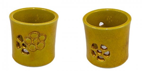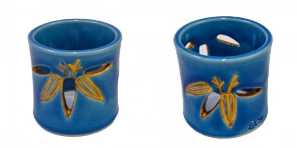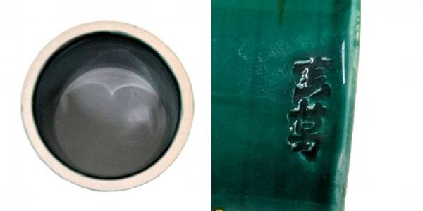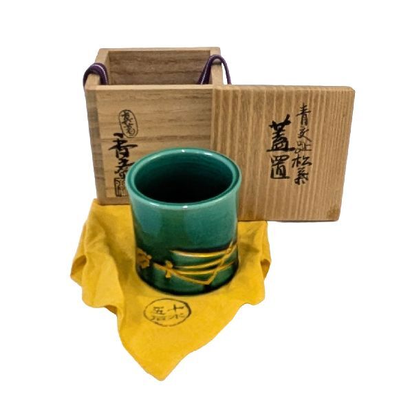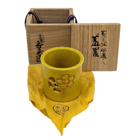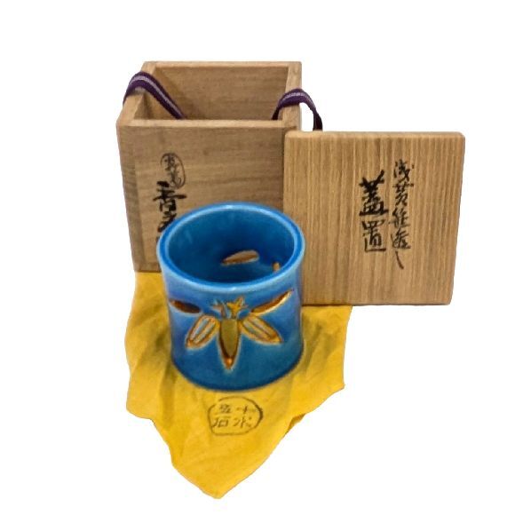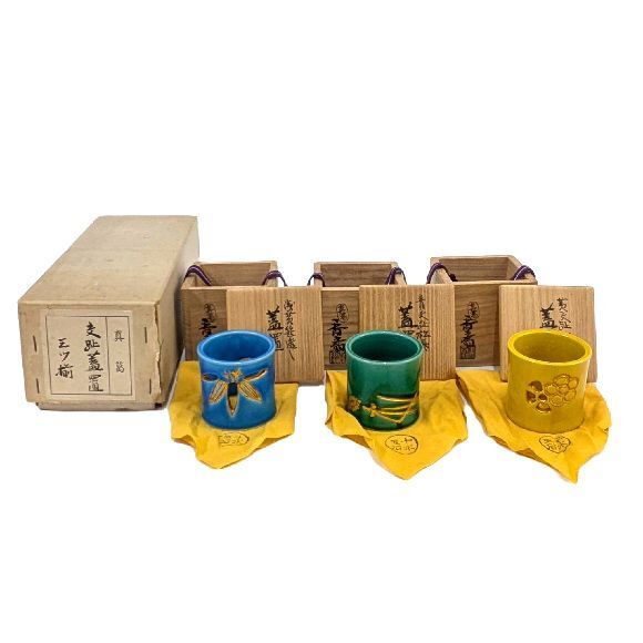 | 商品名 | 【茶道具】真葛焼「宮川 香齋」作 ・交趾蓋置三ツ揃(青交趾松葉 黄交趾梅透し 浅葱笹透し)・陶印 共箱 未使用保管品 |