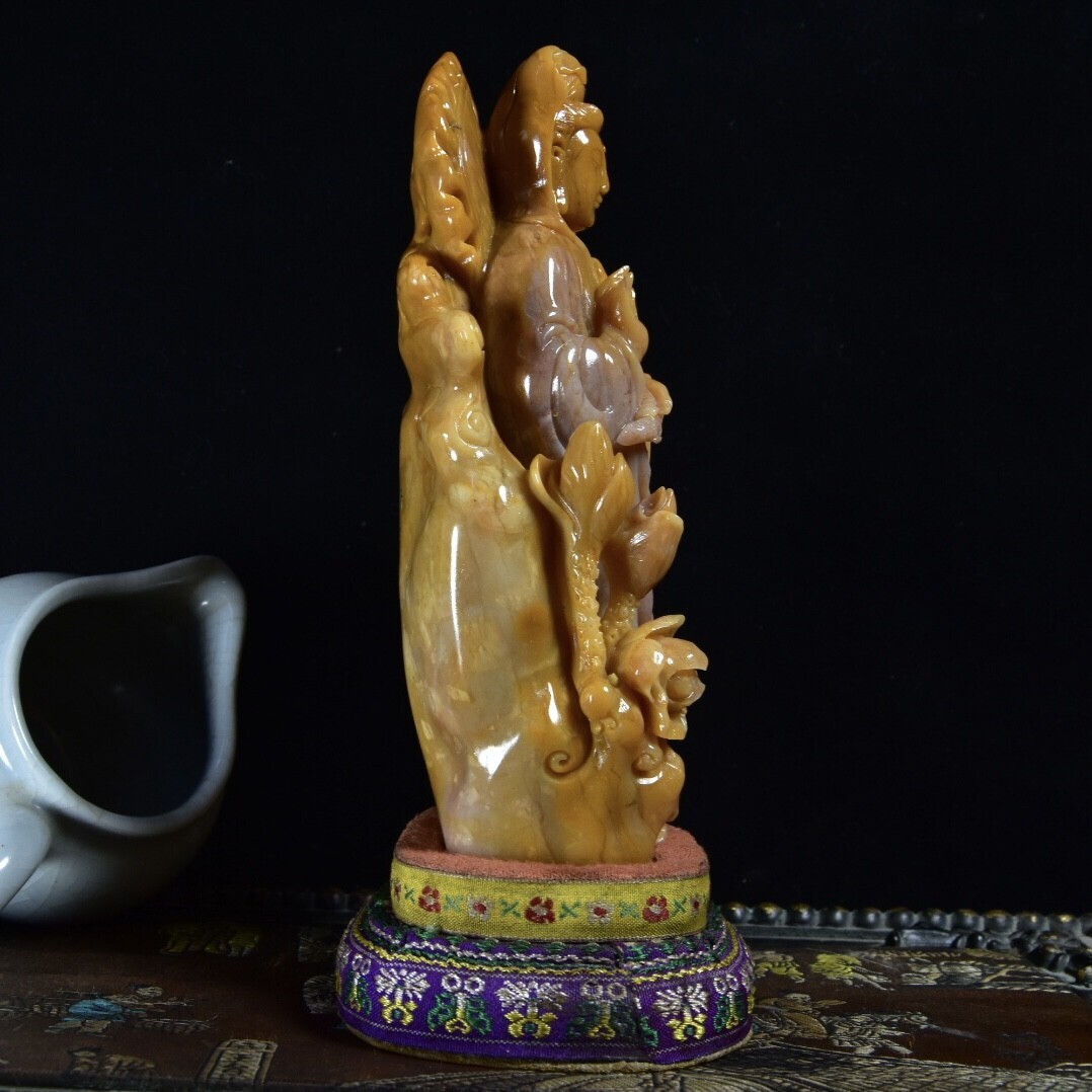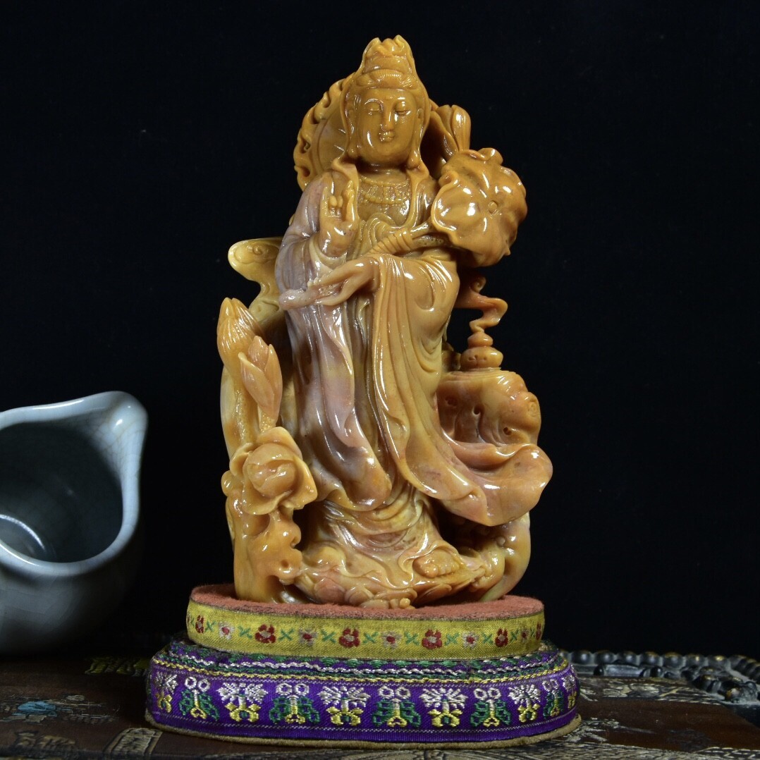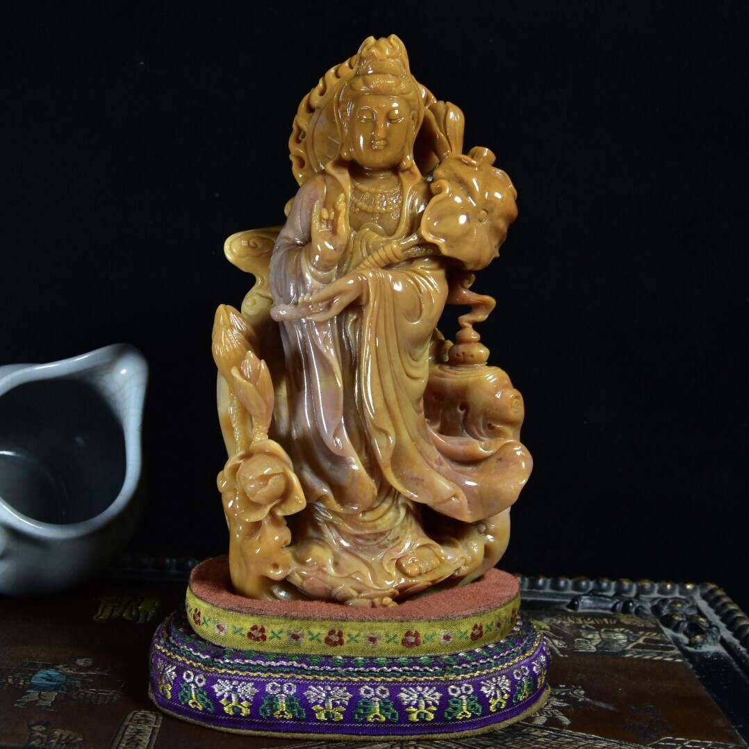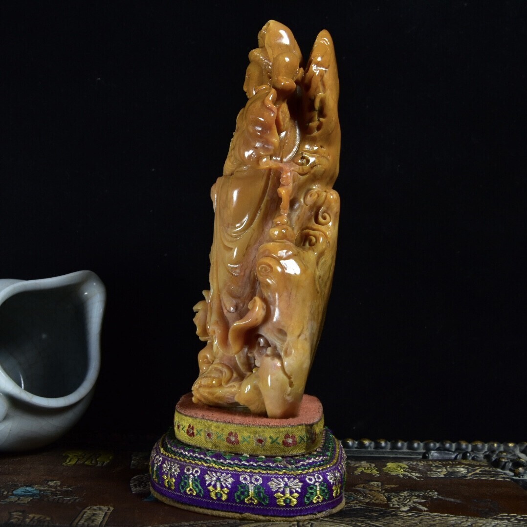 【瓏】寿山石 田黄石彫 自在観音 擺件 清代 汪啓淑作 極細工 手彫り 置物擺件 中国古賞物 古美術 蔵出