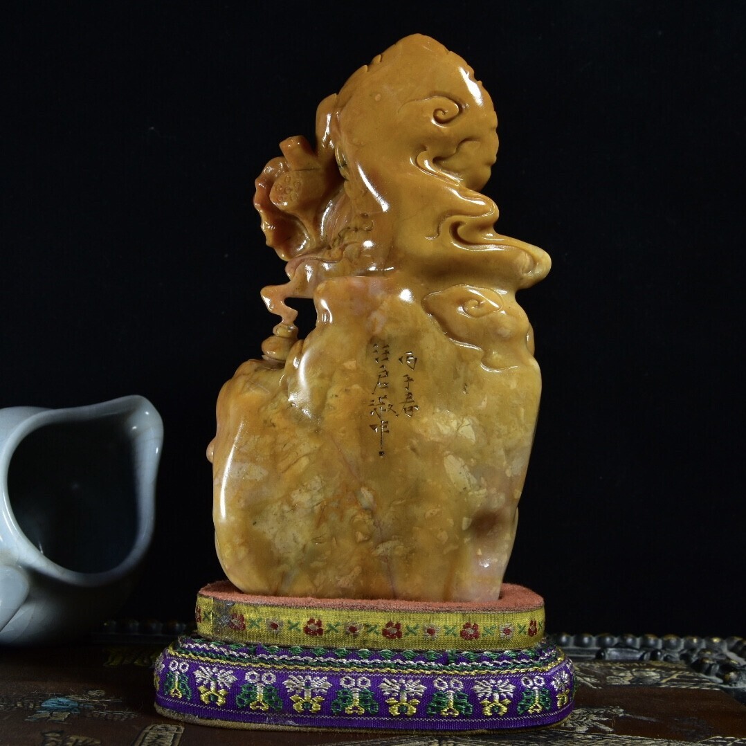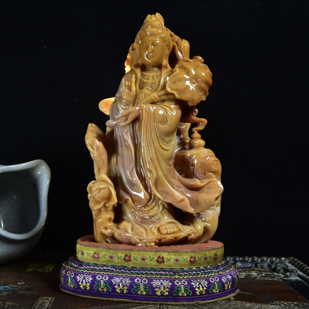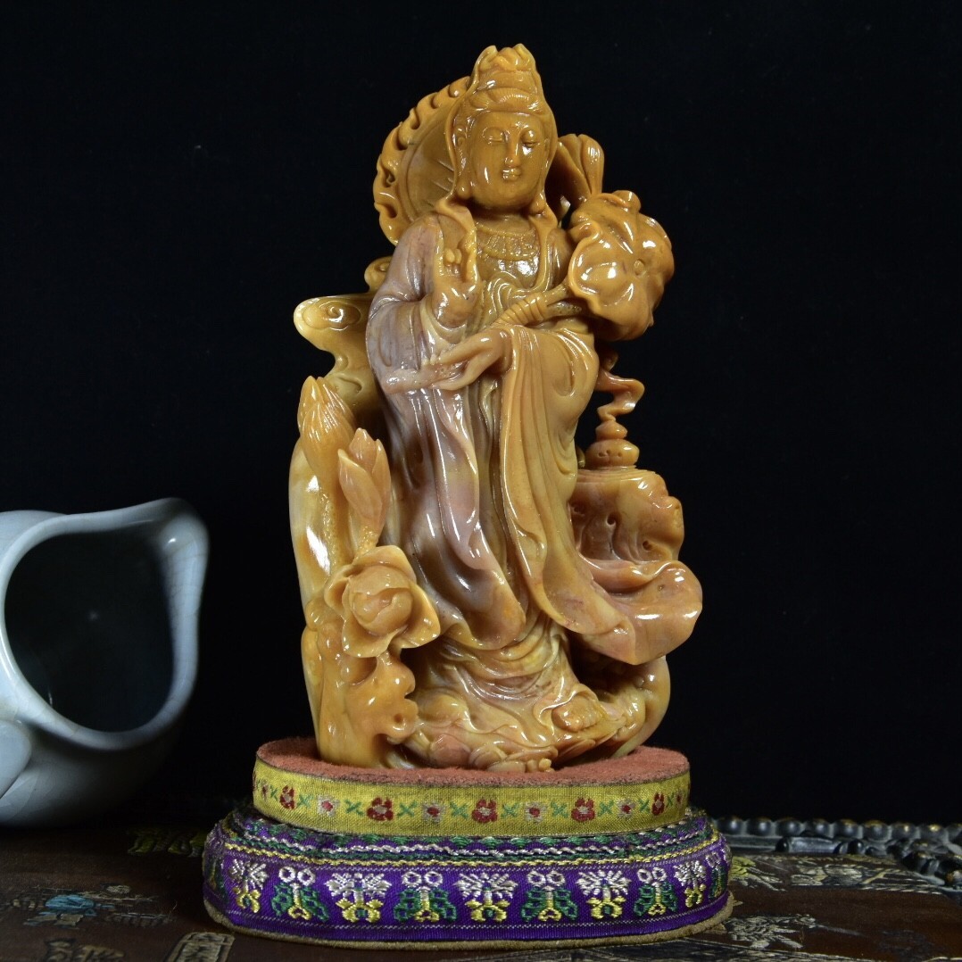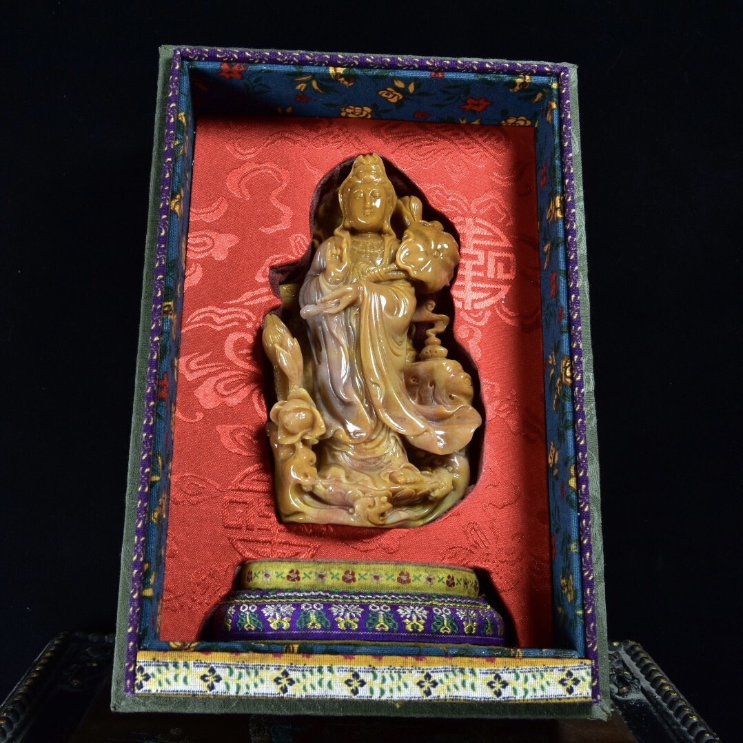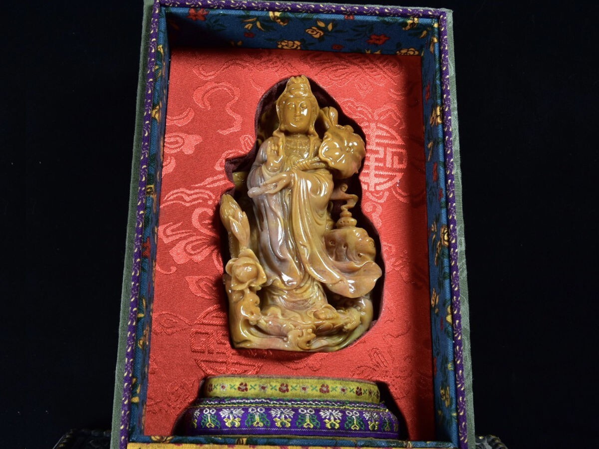 【瓏】寿山石 田黄石彫 自在観音 擺件 清代 汪啓淑作 極細工 手彫り 置物擺件 中国古賞物 古美術 蔵出