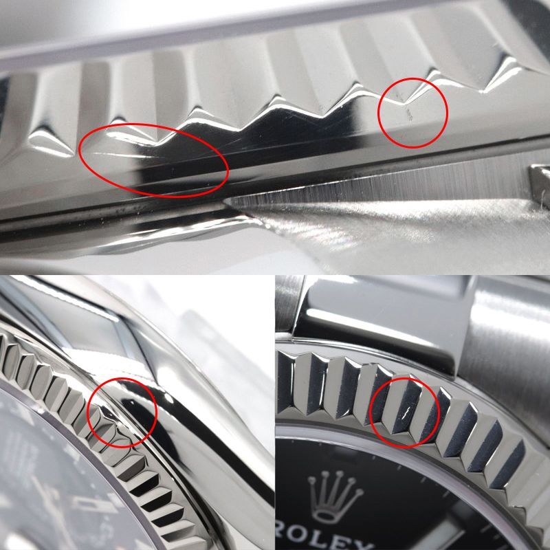 | 状態 | ランクA+ 新品仕上げ済みでございます。 ベゼル7時と8時と12時方向、ケースサイド、ベルト、バックル全体に新品仕上げで取り切れなかった光の反射で見える程度の微細なスレがございます。 |