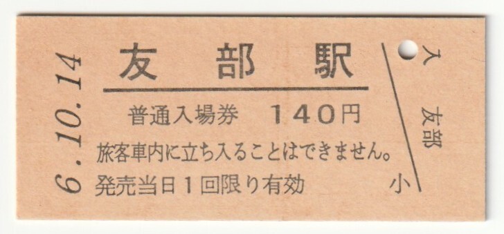 平成6年10月14日 常磐線 友部駅 140円硬券普通入場券(日付印刷)