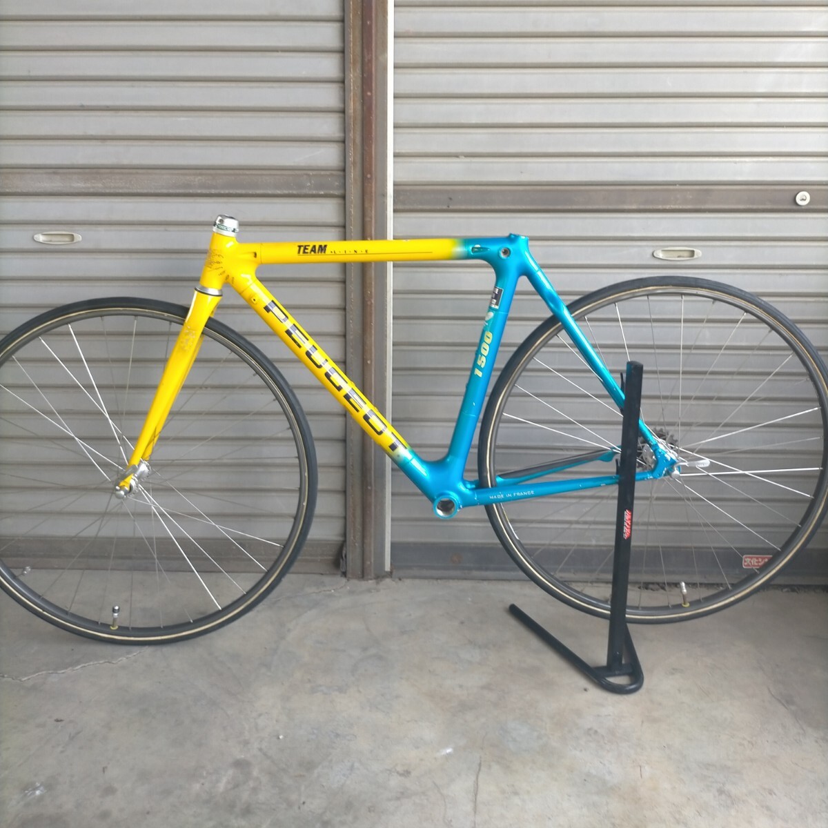 90年代のプジョーのチームカラーのロードバイクフレームです。素材はカーボンでかなり軽量です。フランス製でワイヤー内蔵型・FD直付けと高級車ならではの仕様です。形状はエアロタイプです。