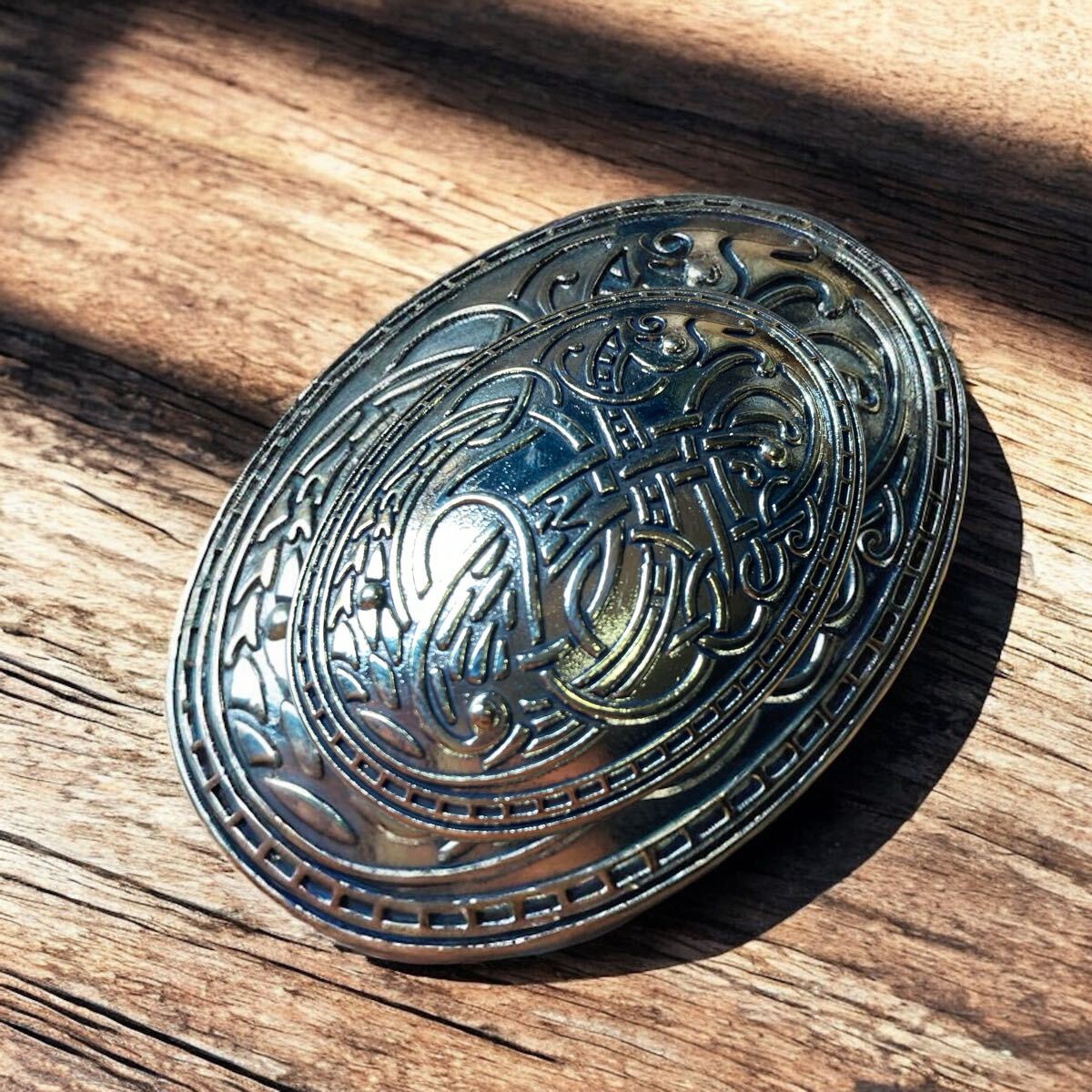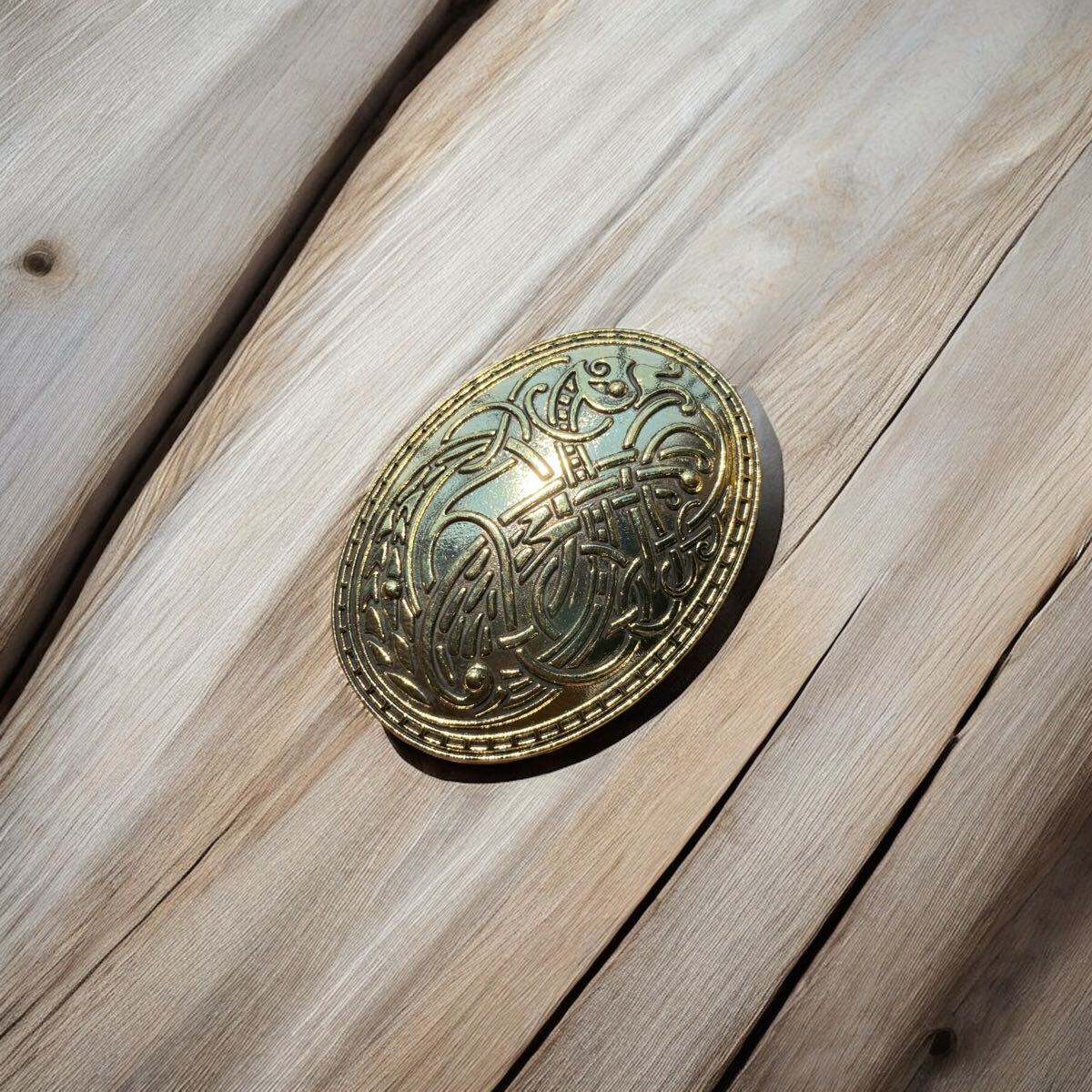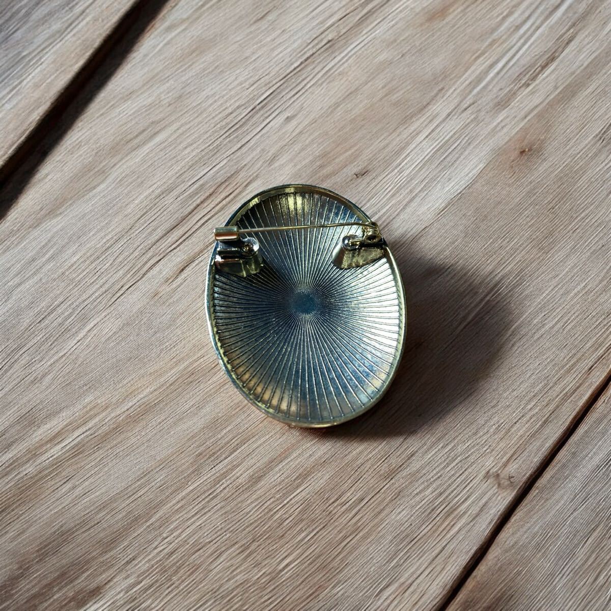 金色の模様が美しく装飾的な楕円形ブローチです。